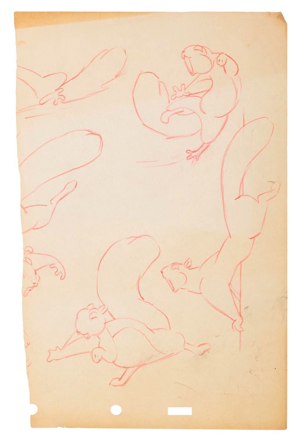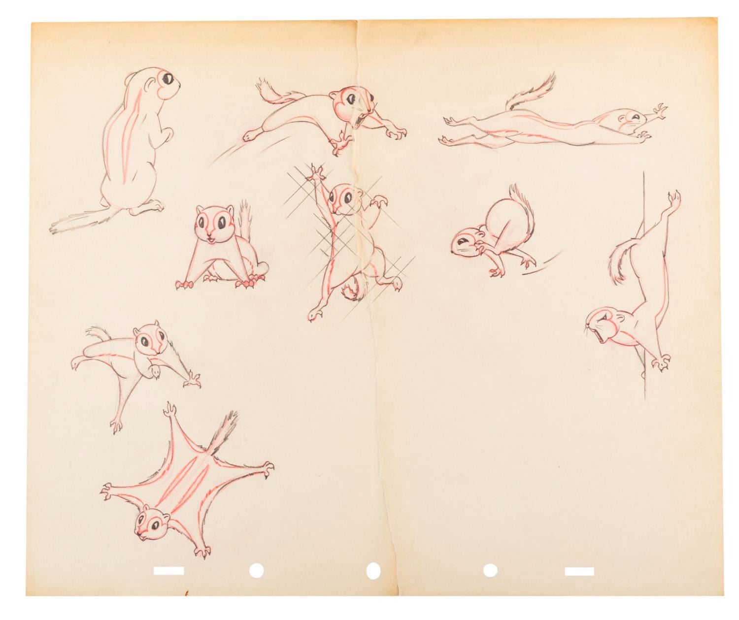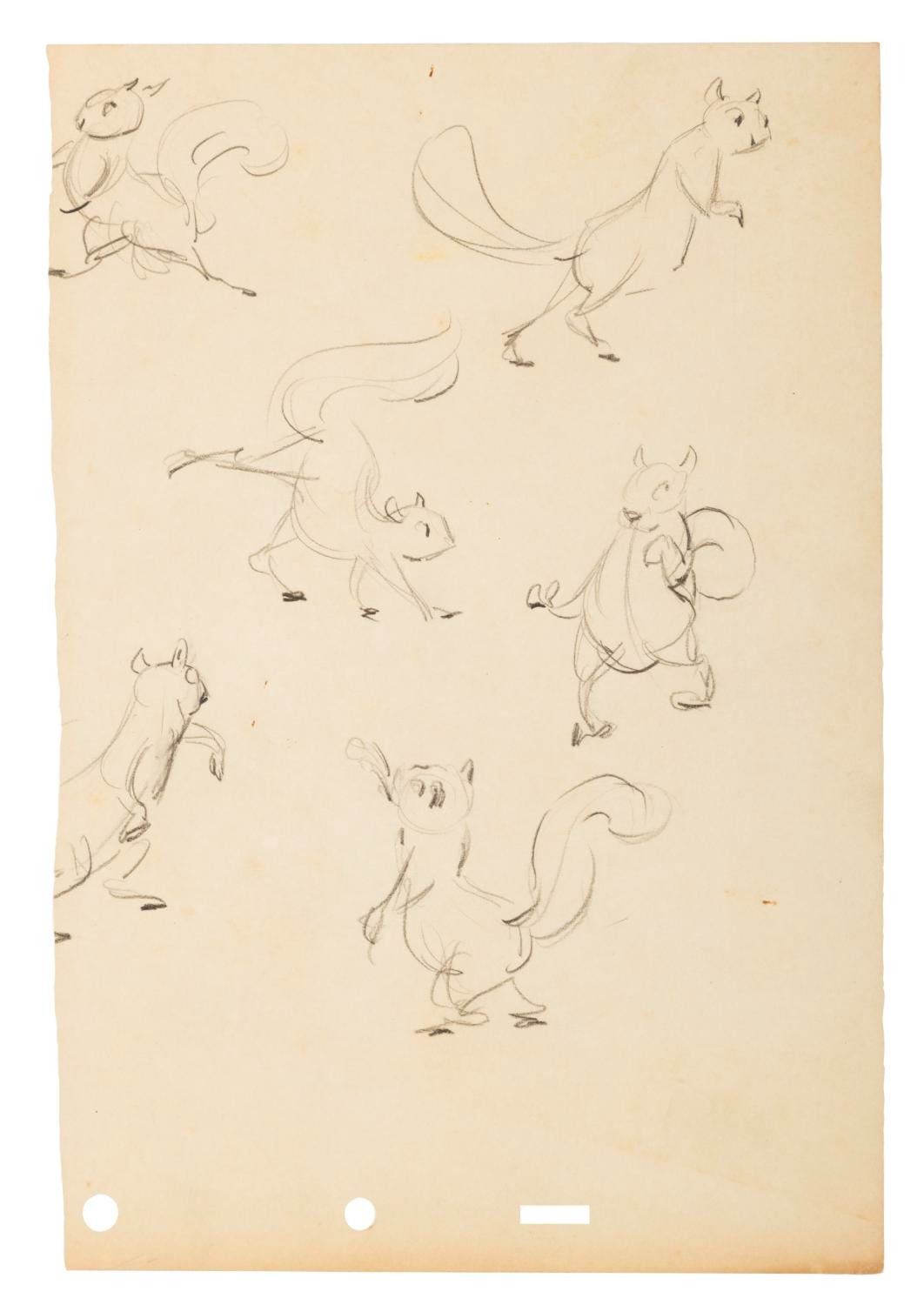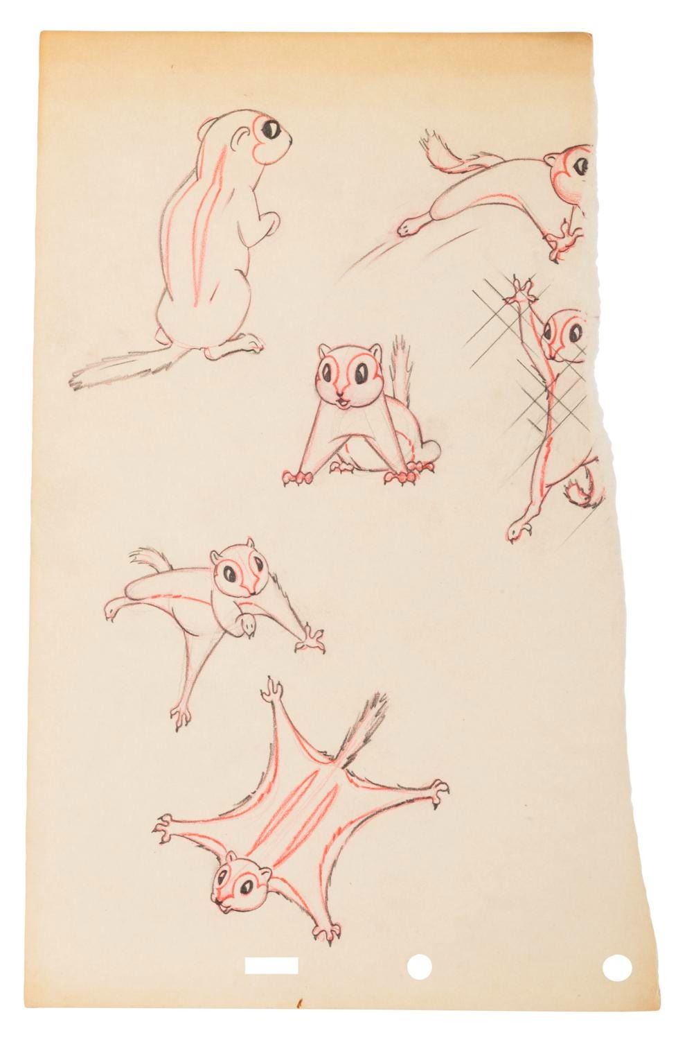 (Disney, 1930s-40s) A collection of eleven half-torn pages of squirrel drawings from an unknown early Disney production. The graphite and colored pencil drawings are in good condition with discoloration from age, creases, oxidation from a metal clip, and wear along the tears.