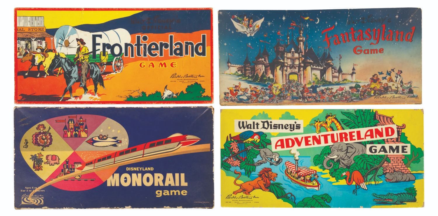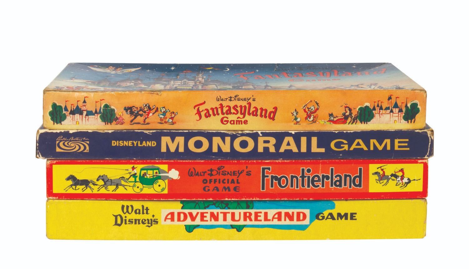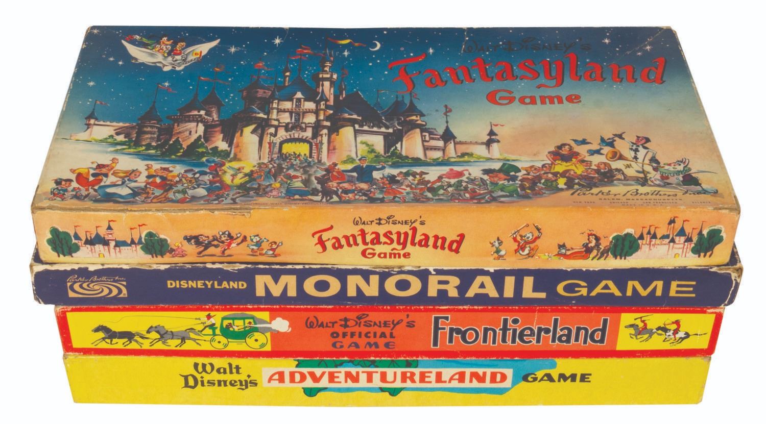 (Disneyland, 1950s-60s) A collection of four early Disneyland board games. Included are "Fantasyland," "Monorail," "Frontierland," and "Adventureland," each with beautifully illustrated game boards and boxes representing the early years of Disneyland. The boxes each measure approximately 16" x 8" x 1.5" tall. The games are in overall good condition with some wear to the boards and pieces from use, and some edge wear and spots of discoloration to the boxes. All of the game boards, spinners, and rule sheets are included. The "Monorail" game has a few replacement player tokens, "Fantasyland" is missing a player token, and "Frontierland" is missing the scout tokens.