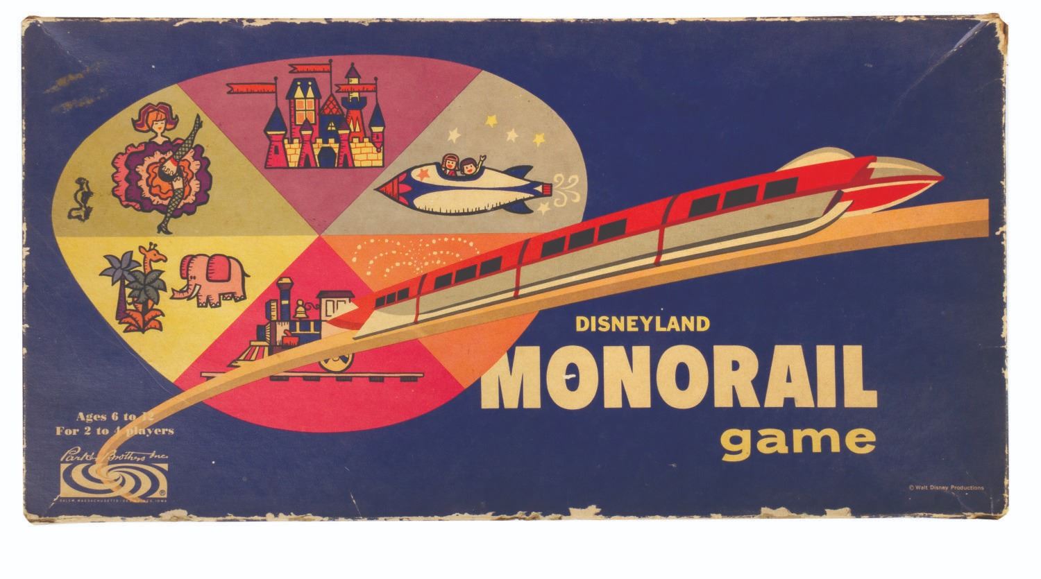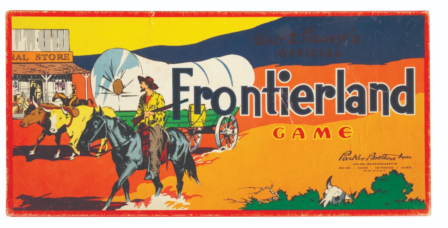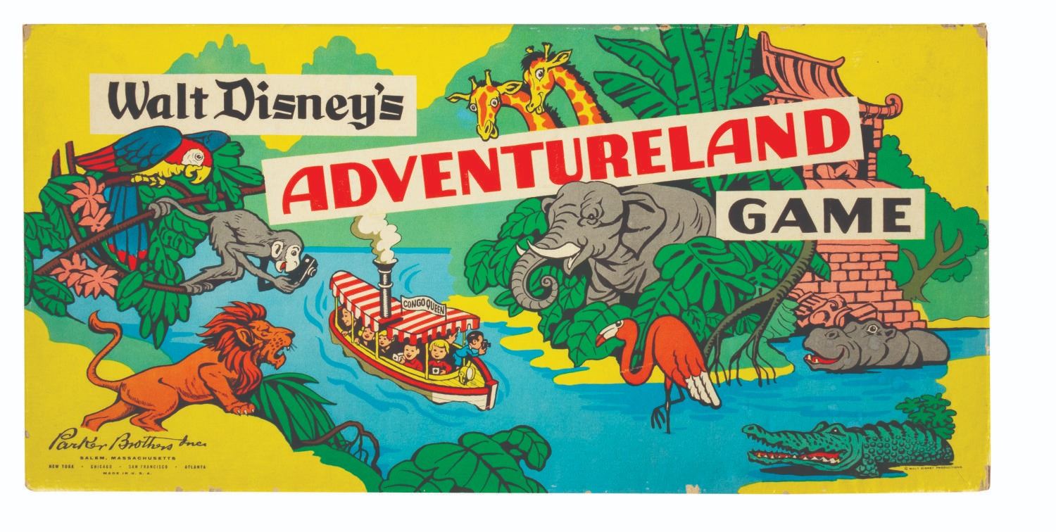 (Disneyland, 1950s-60s) A collection of four early Disneyland board games. Included are "Fantasyland," "Monorail," "Frontierland," and "Adventureland," each with beautifully illustrated game boards and boxes representing the early years of Disneyland. The boxes each measure approximately 16" x 8" x 1.5" tall. The games are in overall good condition with some wear to the boards and pieces from use, and some edge wear and spots of discoloration to the boxes. All of the game boards, spinners, and rule sheets are included. The "Monorail" game has a few replacement player tokens, "Fantasyland" is missing a player token, and "Frontierland" is missing the scout tokens.