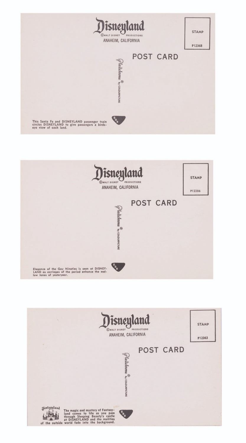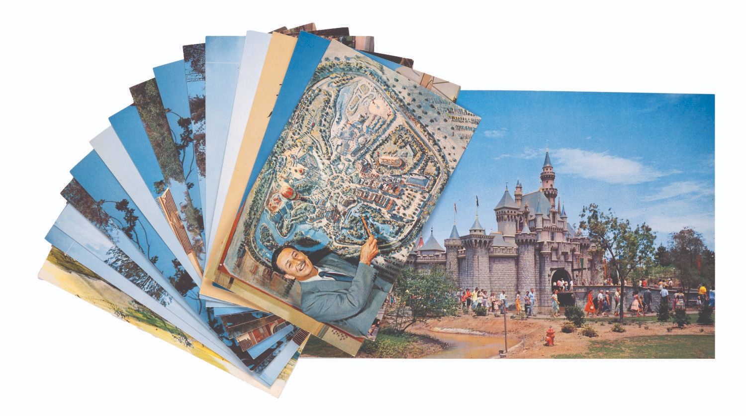 (Disneyland, 1950s) A collection of 15 early Disneyland postcards. Fourteen are produced by Colourpicture, and one by Monsanto. Measuring 3.5" x 5.5" with one oversized 5.5" x 8.75", the postcards are in very good to fine condition with some light handling wear, and the Adventureland card good condition with spotting on the back.