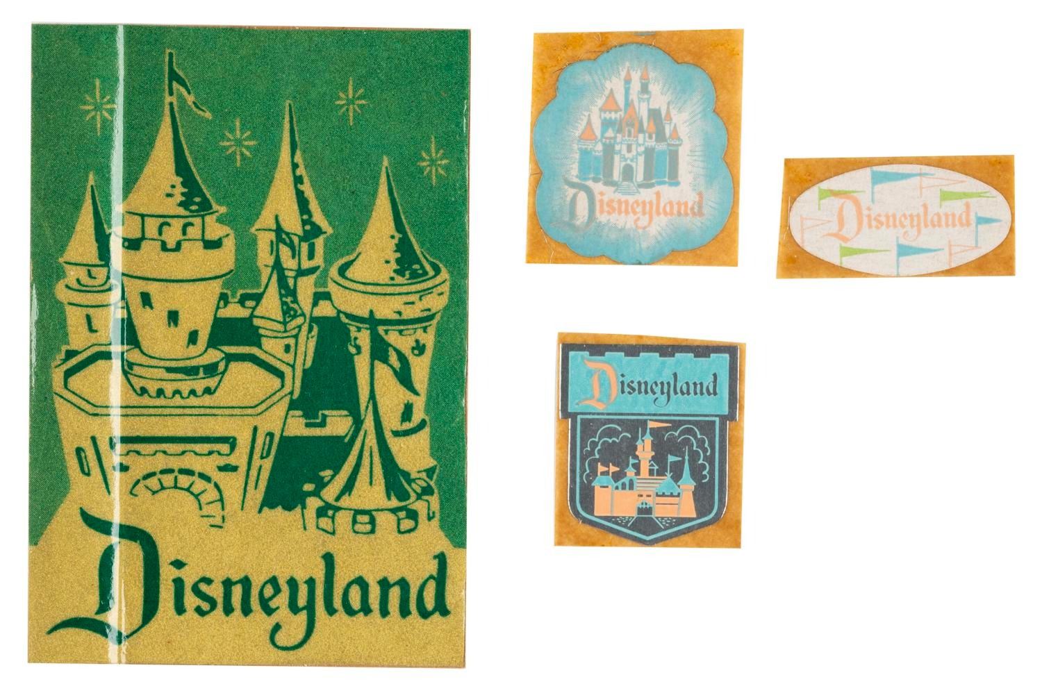 (Disneyland, 1950s-60s) A collection of rare early Disneyland stickers including three logos under 1.25" each, and a reflective 2.5" x 3.5" sticker. The stickers are in good condition with wear from age mainly in the backing.