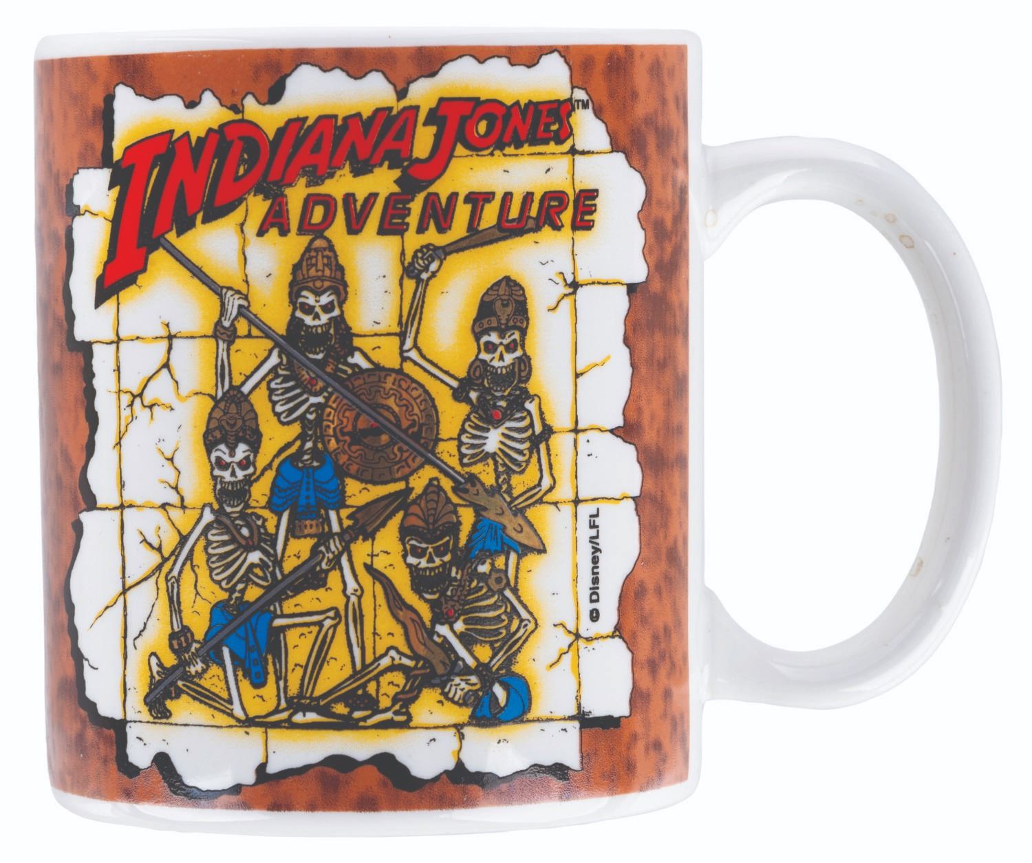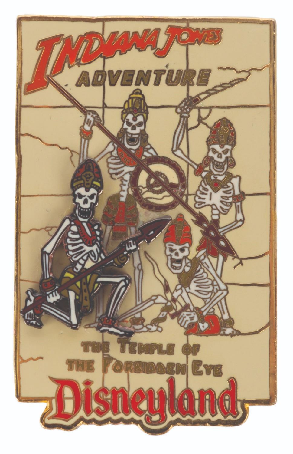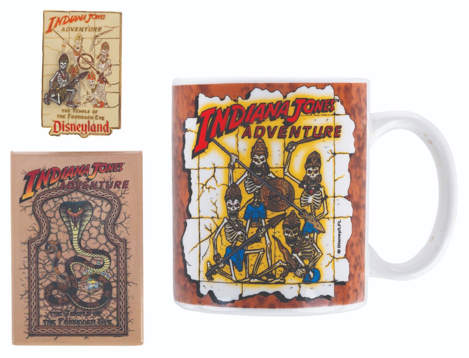 (Disneyland, 1990s) A collection of Indiana Jones Adventure: Temple of the Forbidden Eye souvenirs from the early years of the attraction. Included are a mug, a snake button, and a skeleton guards pin. Ranging in size from the 1.25” x 2” pin to the 3.25” in diameter and 4” tall mug, the souvenirs are in good to very good condition with light scratches and stains on the mug.