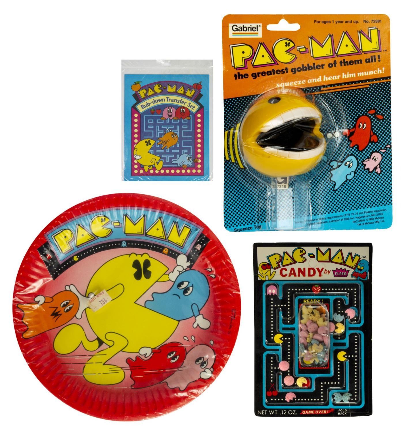 (Bally Midway, 1980-82) A collection of early Pac-Man memorabilia, including a pack of eight party plates, a package of candy, a rub-down transfer set, and a squeeze toy. Ranging in size from the 3.5" x 5.25" candy to the 7" x 9.75" transfer set, the collection is in fair to fine condition with edge wear, creases to the packaging plastic, and recrystallization spots to the candy from age. The candy is intended for collecting purposes only and not for consumption.