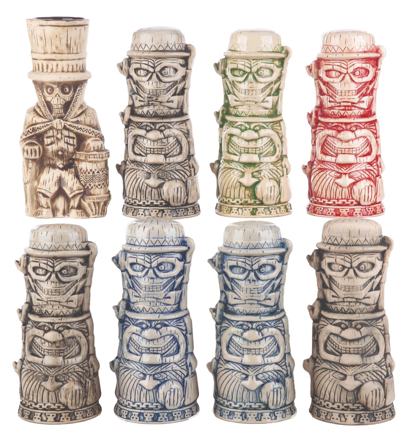 (Disney Parks, 2016-19) A collection of eight Trader Sam's Haunted Mansion Ceramic Tiki Mugs. The mugs were designed by artist Tom Wollweber and released through both Trader Sam's Grog Grotto and Trader Sam's Enchanted Tiki Bar between 2017-2019. Among the lot are (2) 1st Edition Grog Grotto Hitchhiking Ghosts mugs (with dark blue glaze), (1) 2nd Edition Grog Grotto Hitchhiking Ghosts mug (with red glaze), (3) 1st Edition Enchanted Tiki Bar Hitchhiking Ghosts mugs (with black glaze), (1) 2nd Edition Grog Grotto Hitchhiking Ghosts mug (with red glaze), and (1) 1st Edition Trader Sam’s Enchanted Tiki Bar Hatbox Ghost mug. Measuring 3.75" in diameter and 8.5" tall and 4"x9", the mugs are in fine and unused condition overall.