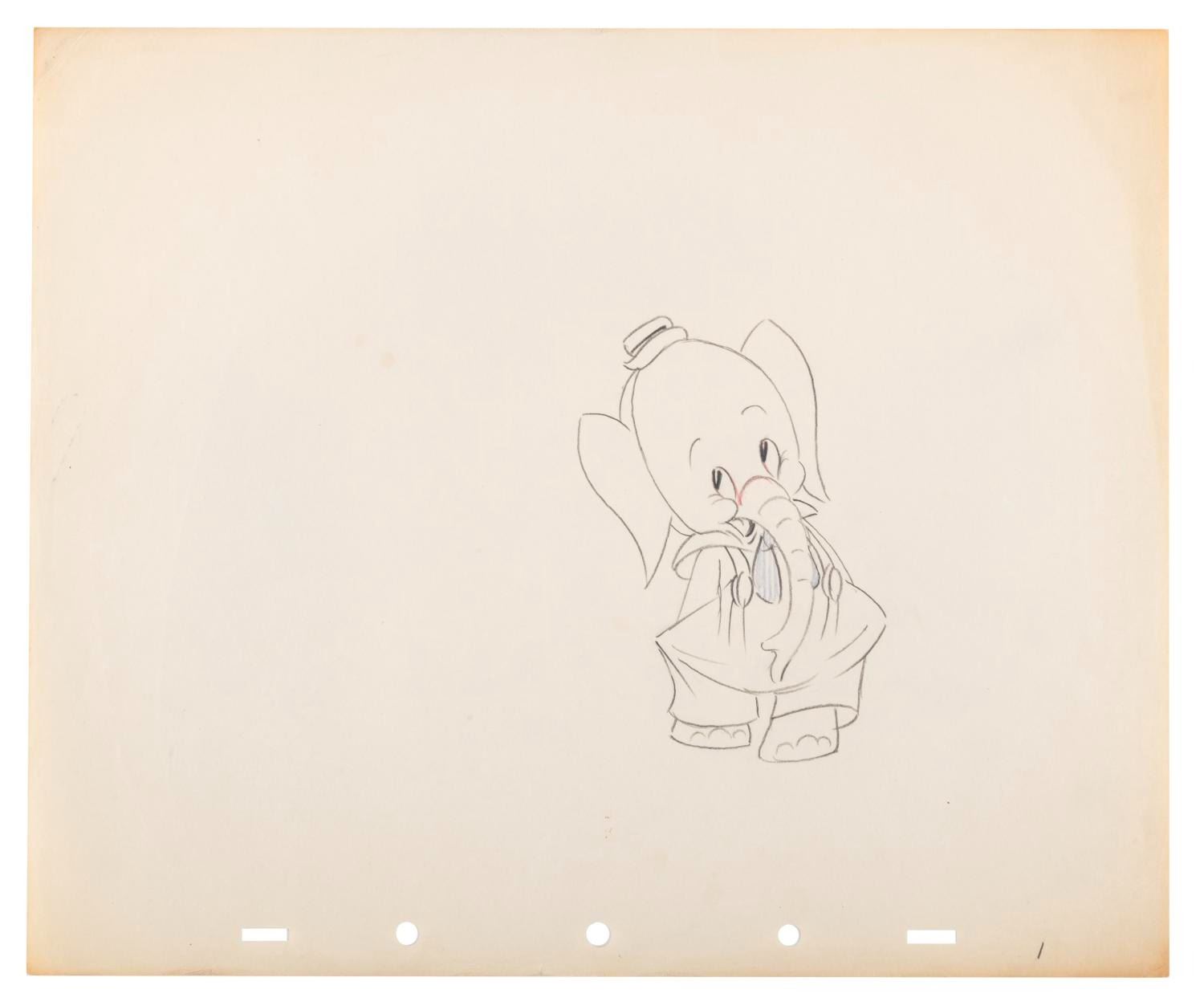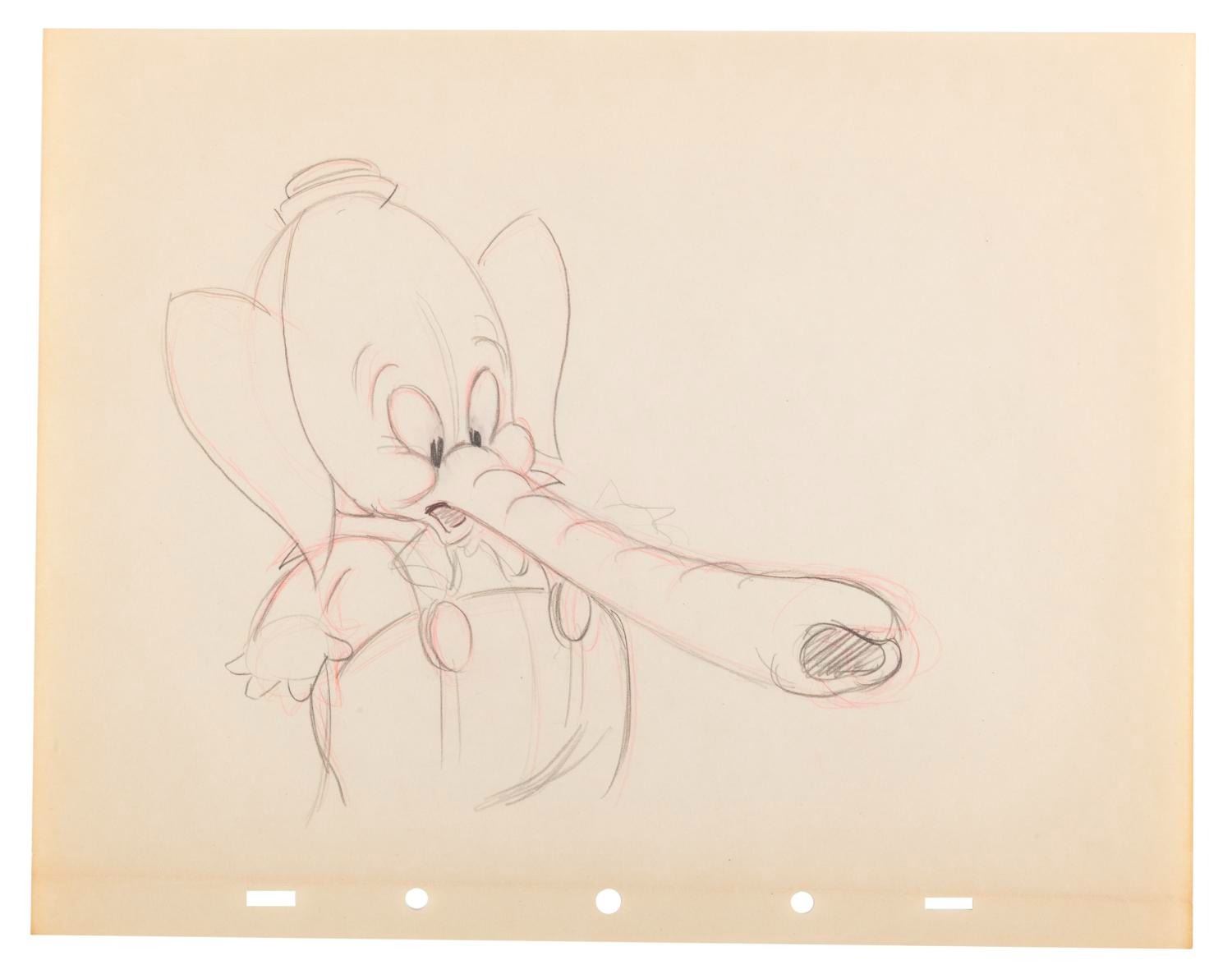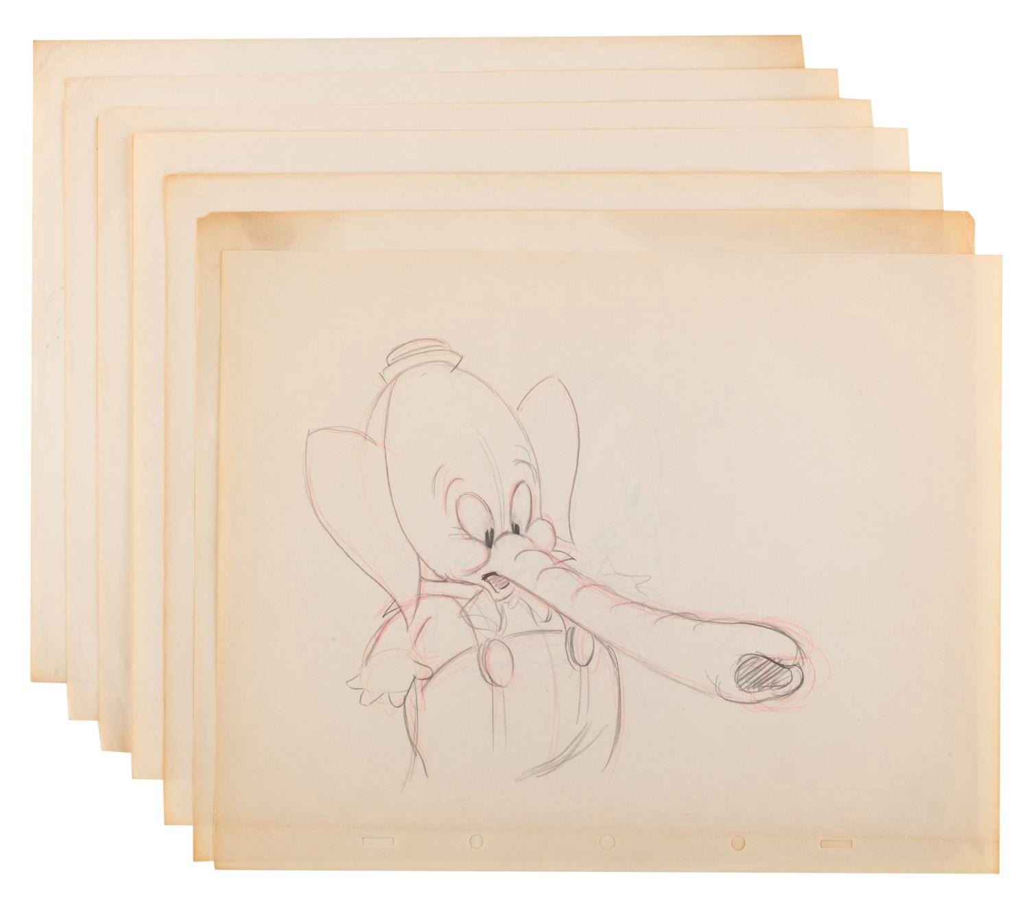 (Disney, 1936) A collection of seven original production drawings from the Silly Symphony short "Elmer Elephant. " With image sizes ranging from 3.25 " x 4.5 " to 7 " x 8 " on 10 " x 12 " animation paper, the graphite and colored pencil drawings are in very good condition with creases, corner folds, spots, edge wear, and discoloration from age.