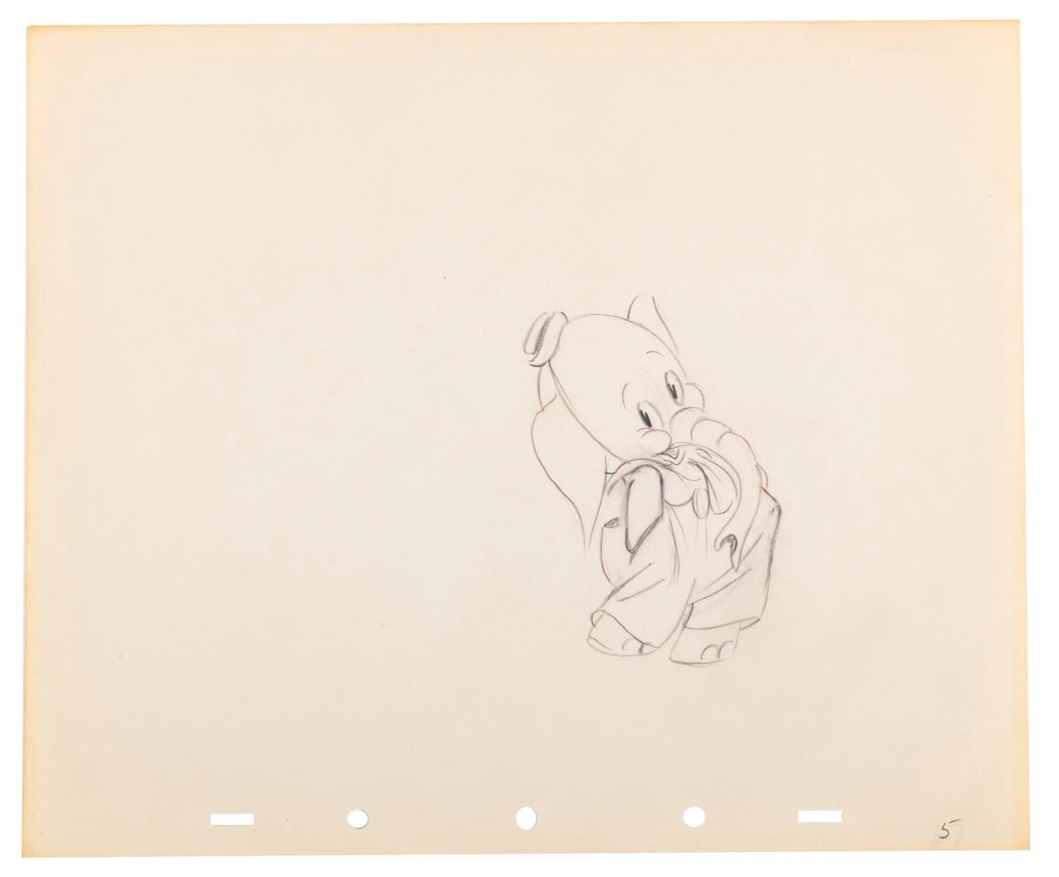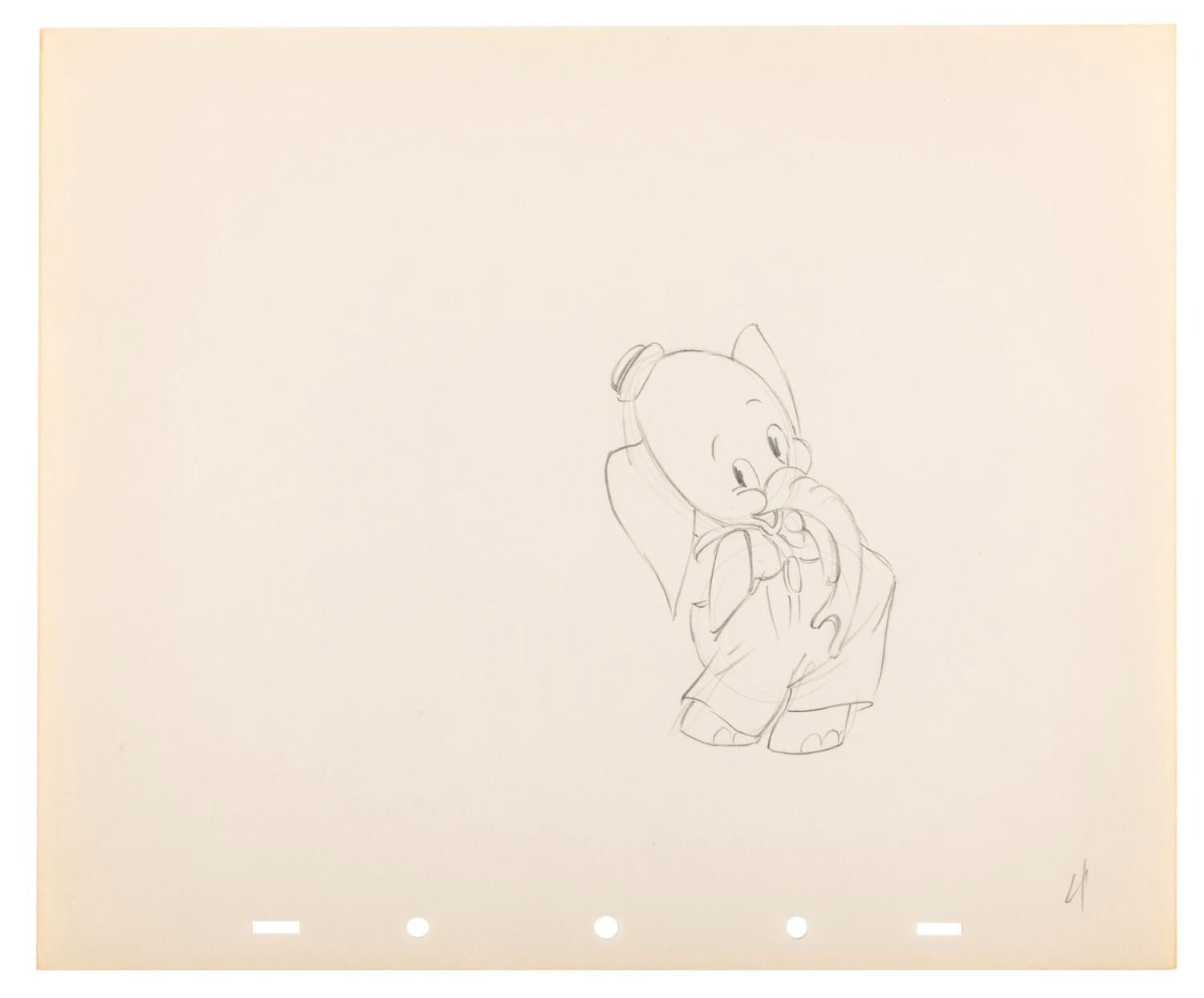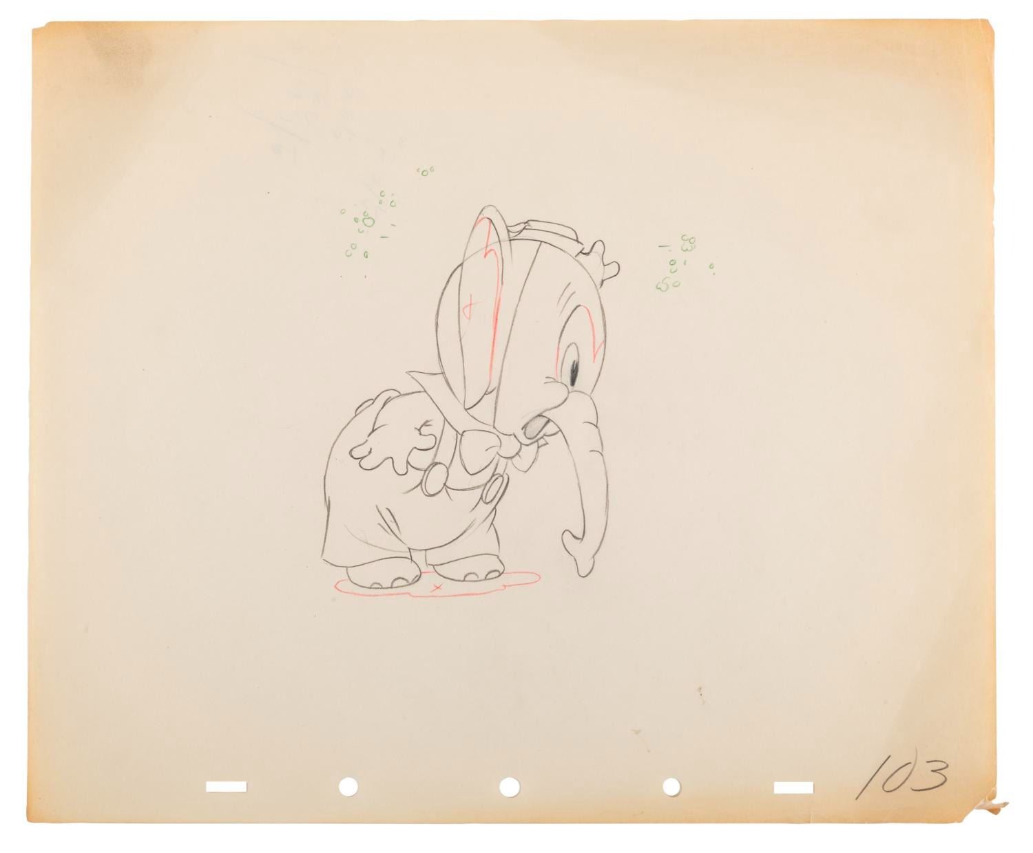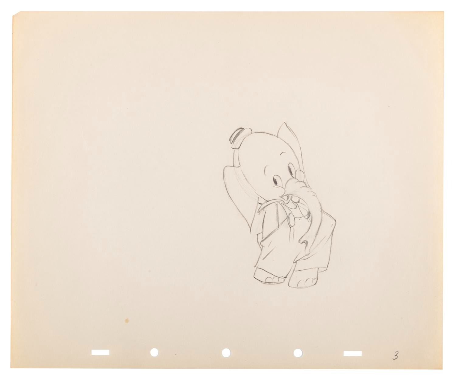 (Disney, 1936) A collection of seven original production drawings from the Silly Symphony short "Elmer Elephant. " With image sizes ranging from 3.25 " x 4.5 " to 7 " x 8 " on 10 " x 12 " animation paper, the graphite and colored pencil drawings are in very good condition with creases, corner folds, spots, edge wear, and discoloration from age.
