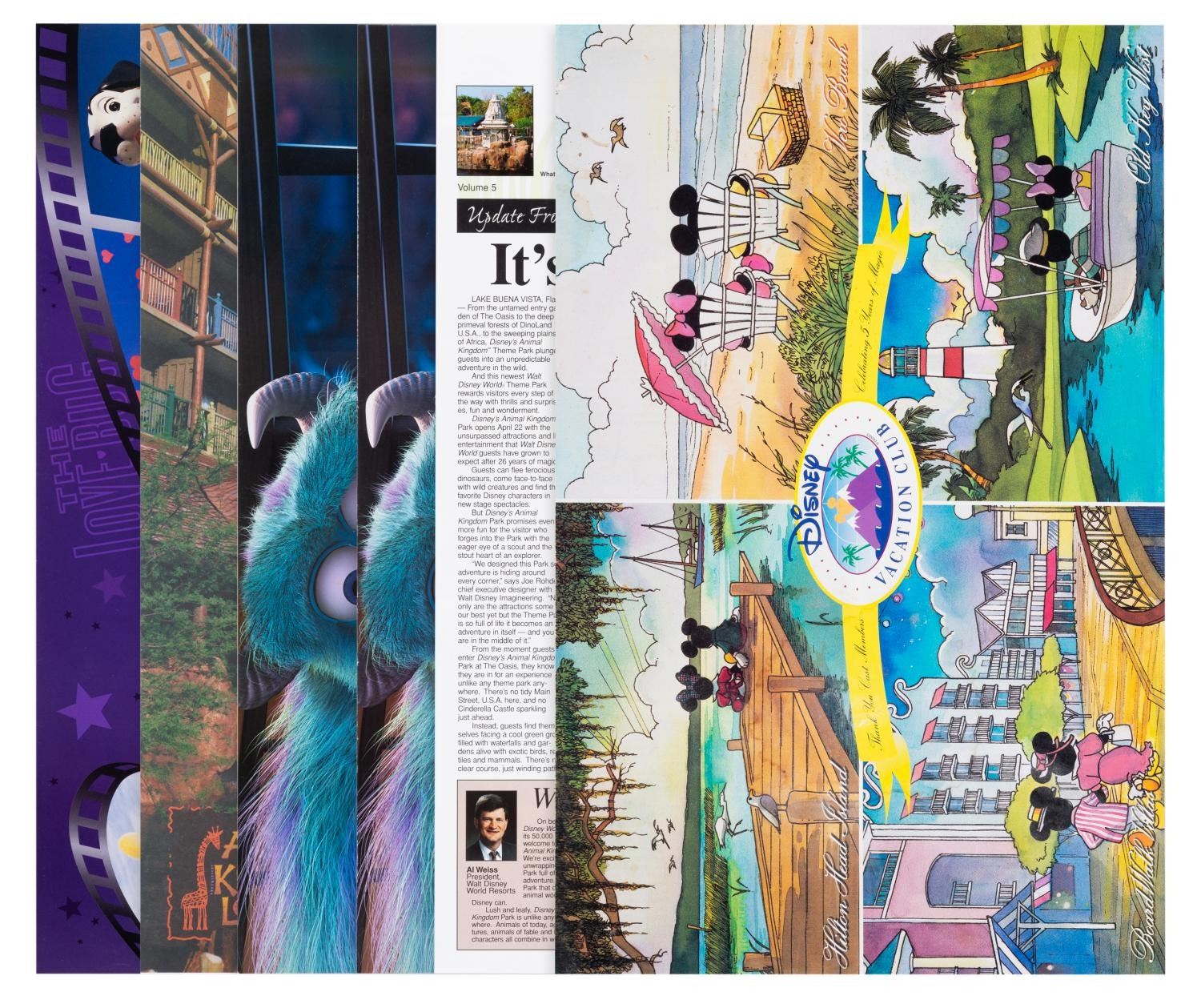 (Walt Disney World, 1997-2001) A collection of five Walt Disney World Eyes and Ears and Animal Kingdom newsletters. Highlights include a romantic Disney Vacation Club 5th anniversary ad featuring Mickey and Minnie, A Disney’s All-Star Movies Resort ad, two “Monsters Inc.” ads, and a Disney’s Animal Kingdom opening article. Measuring 11” x 17”, the newsletters are in good to very good condition with light spots of water damage, creases, and wear.