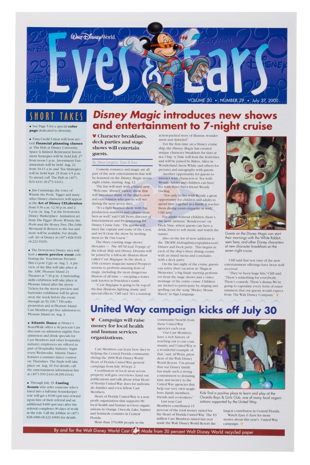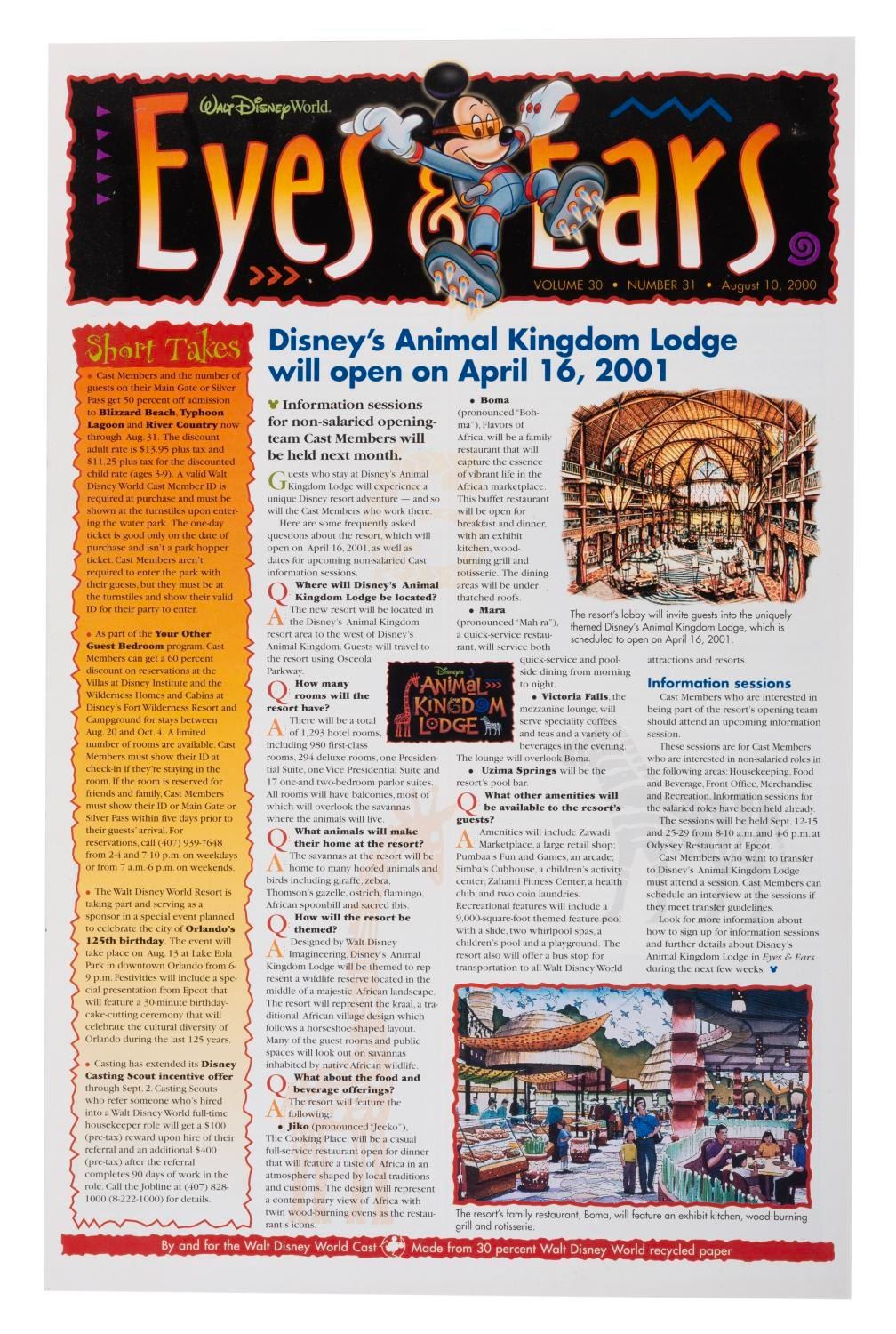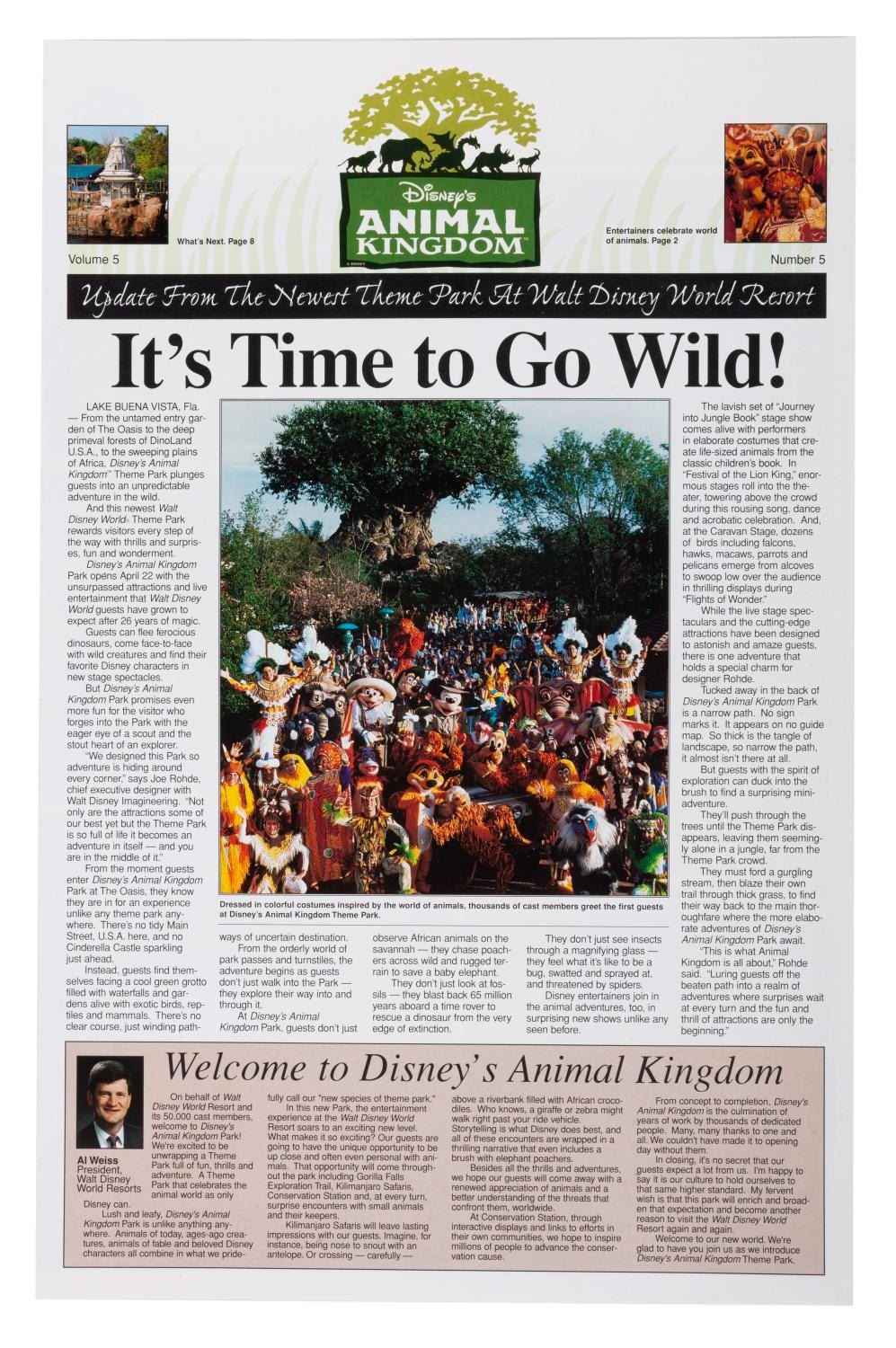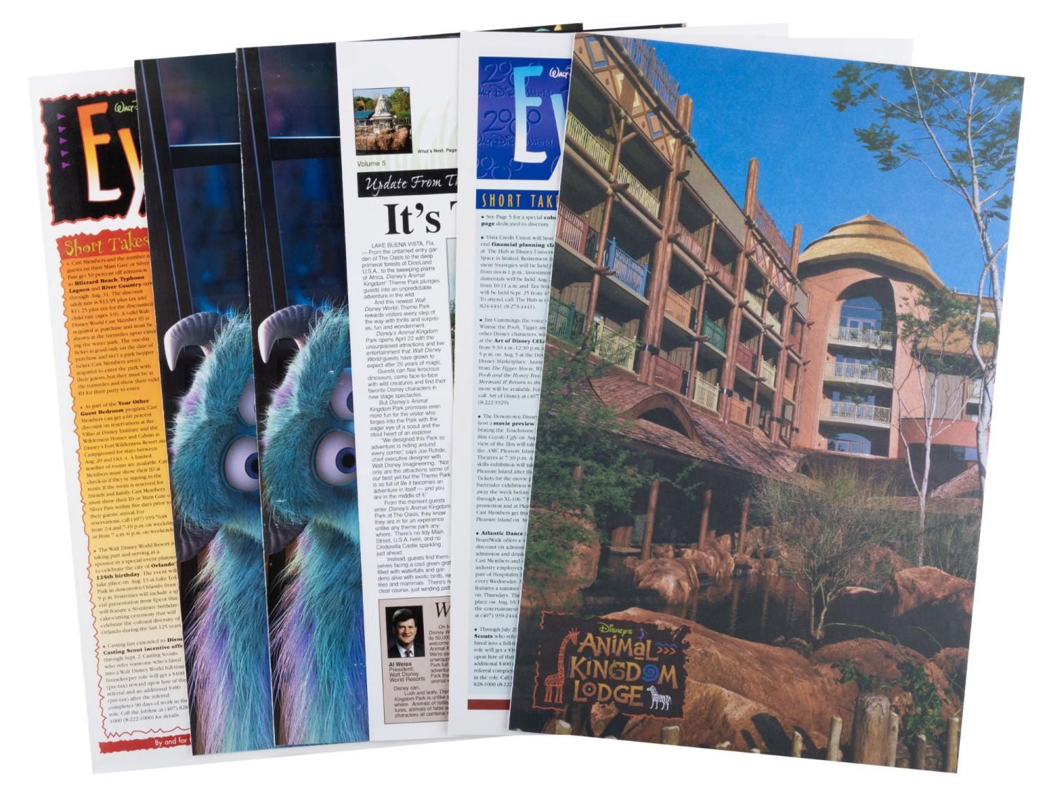 (Walt Disney World, 1998-2001) A collection of six Walt Disney World Eyes & Ears and Animal Kingdom newsletters. Highlights include articles on Disney’s Animal Kingdom Lodge, duplicate issues with “Monsters, Inc.” articles, and the opening of Disney’s Animal Kingdom. Measuring 11” x 17”, the newsletters are in very good to fair condition with scratches, scrapes, creases, and wear.