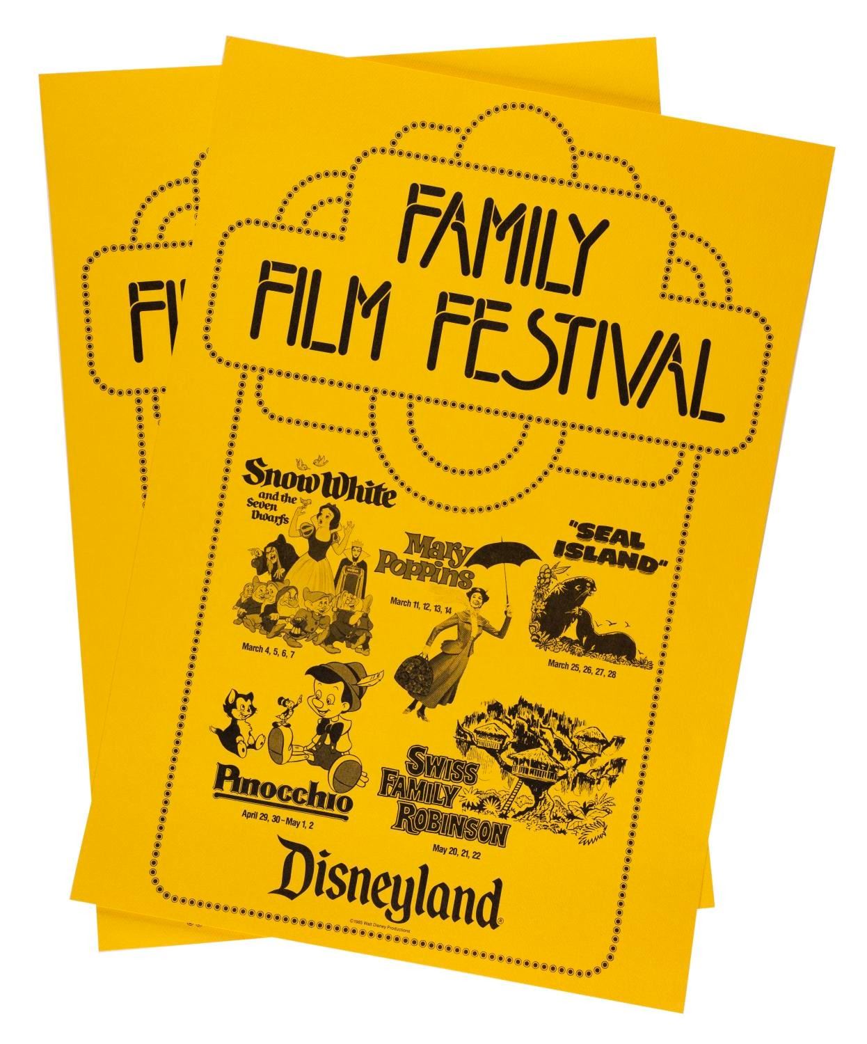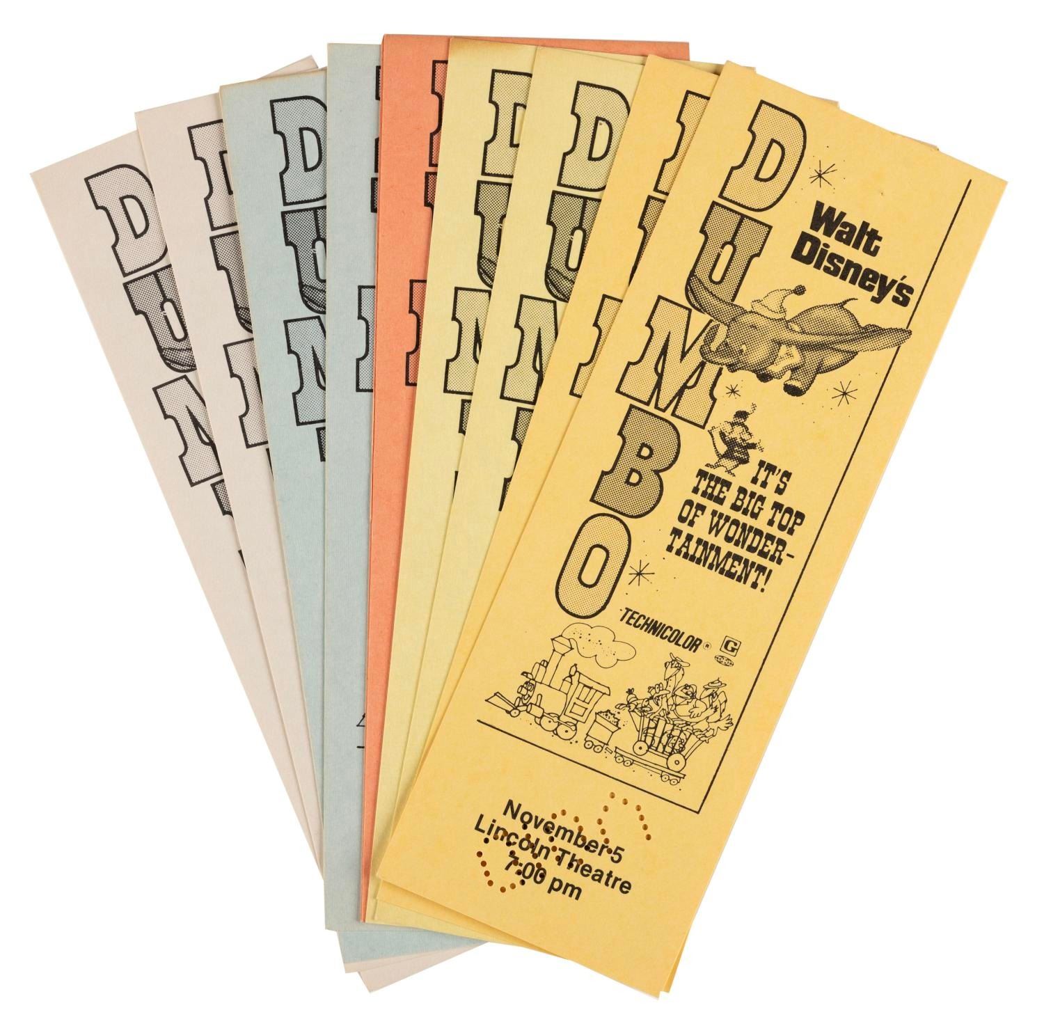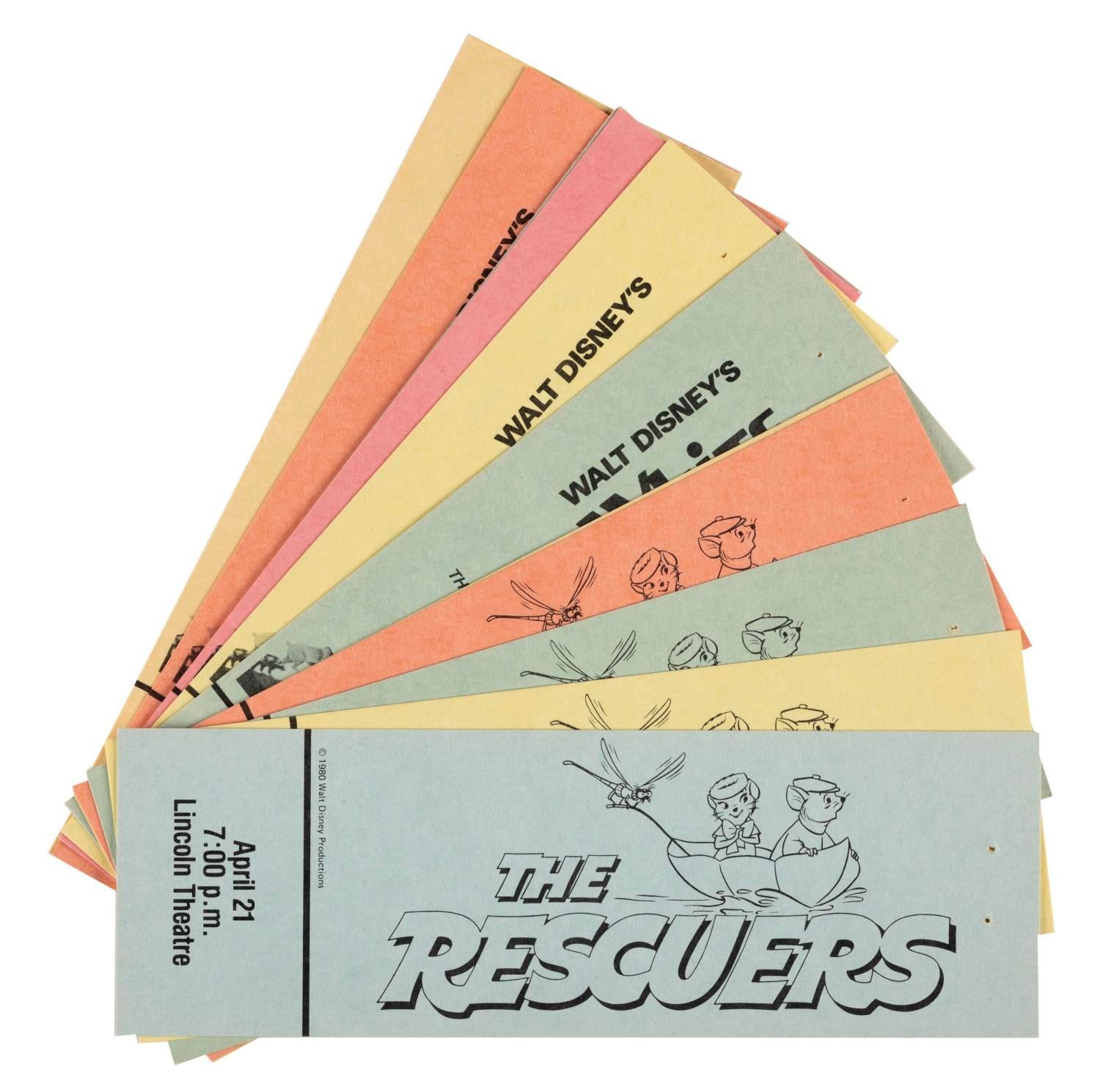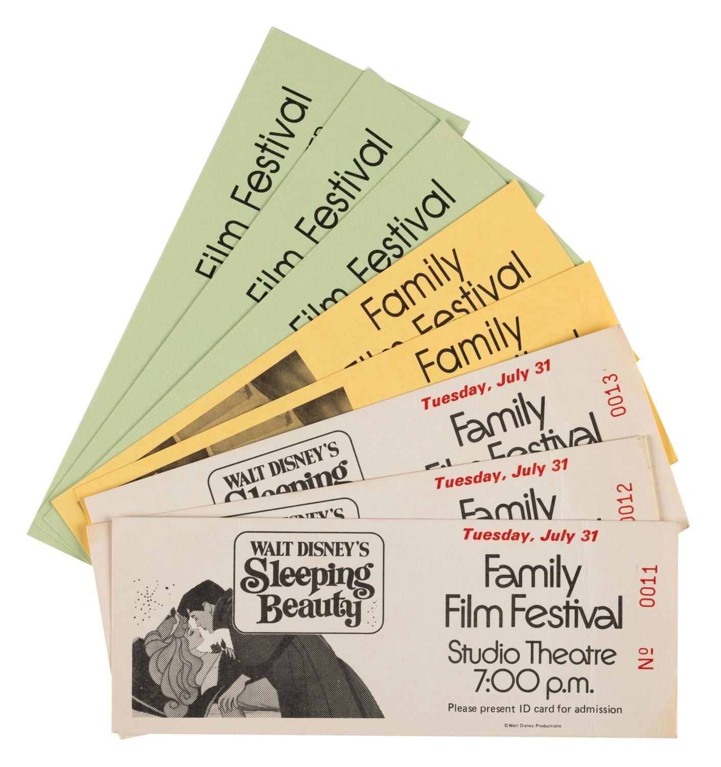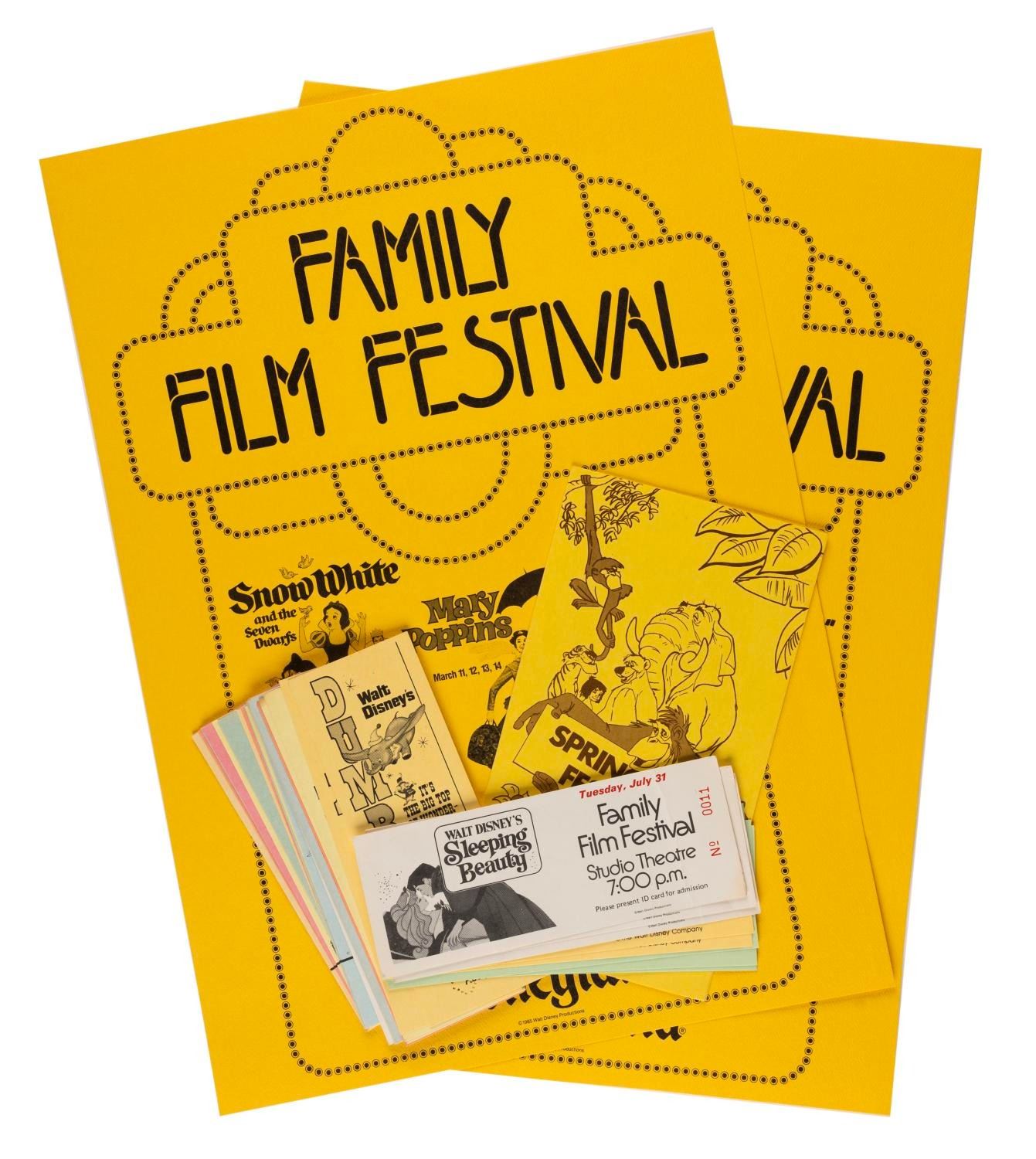 (Disneyland, 1985) A collection of Family Film Festival items including two identical posters, a Spring Film Festival informational brochure, 30 tickets, 6 "The Rescuers," 6 "White Wilderness," 10 "Dumbo," 3 "Sleeping Beauty," 3 "Ruthless People" and 2 "The Great Mouse Detective." Measuring from 6" x 2" to 12"x17", the items are in very good condition with staple holes to some of the tickets, a fold, creasing and discoloration on all of the "Sleeping Beauty" tickets, and a small water spot and scuffing to the reverse of the brochure. The posters are in fine condition.