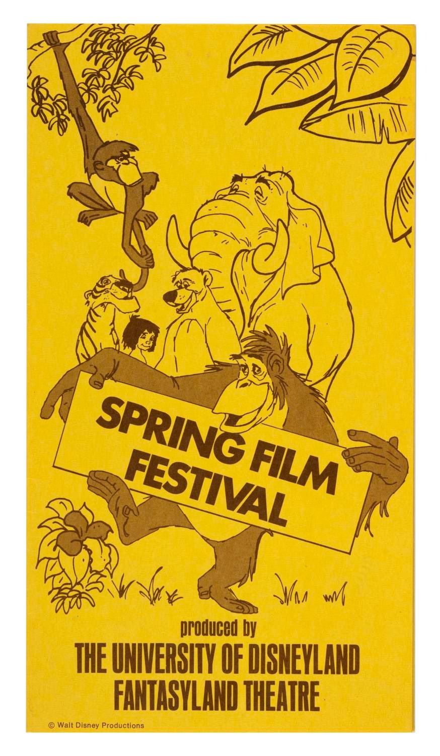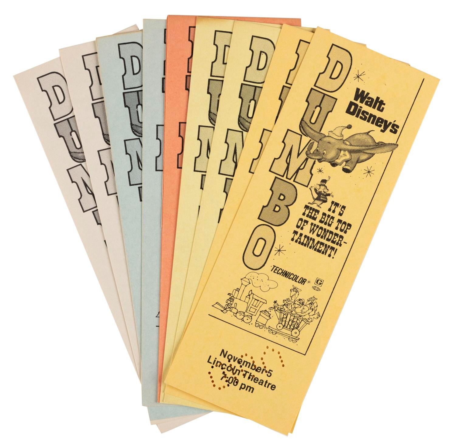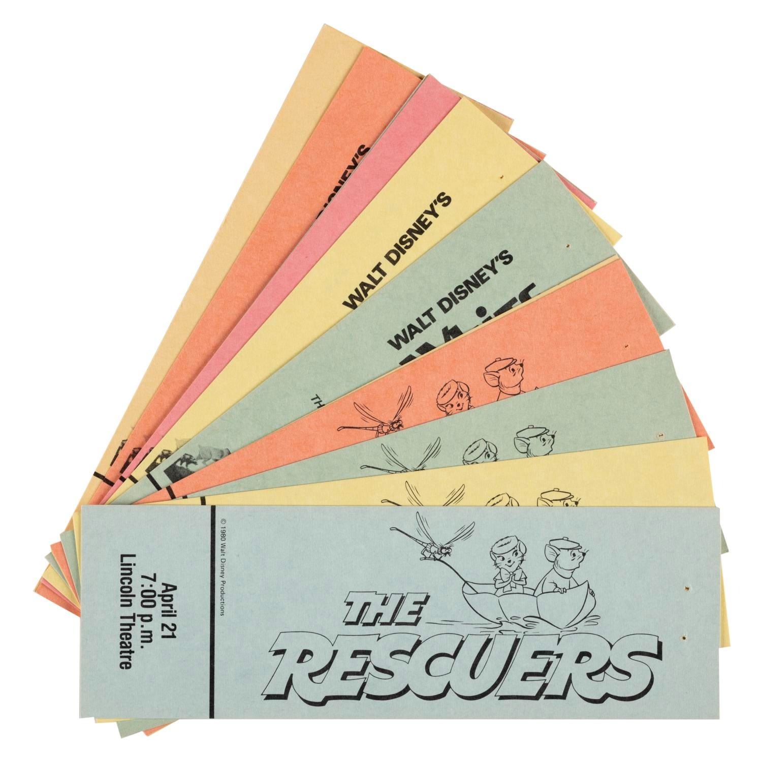 (Disneyland, 1985) A collection of Family Film Festival items including two identical posters, a Spring Film Festival informational brochure, and 30 tickets; 6 for "The Rescuers," 6 for "White Wilderness," 10 for "Dumbo," 3 for "Sleeping Beauty," 3 for "Ruthless People" and 2 for "The Great Mouse Detective." Measuring 6" x 2" to 12" x 17", the items are in very good condition with staple holes to some of the tickets, a fold, creasing and discoloration on all of the "Sleeping Beauty" tickets, and a small water spot and scuffing to the reverse of the brochure. The posters are in fine condition.