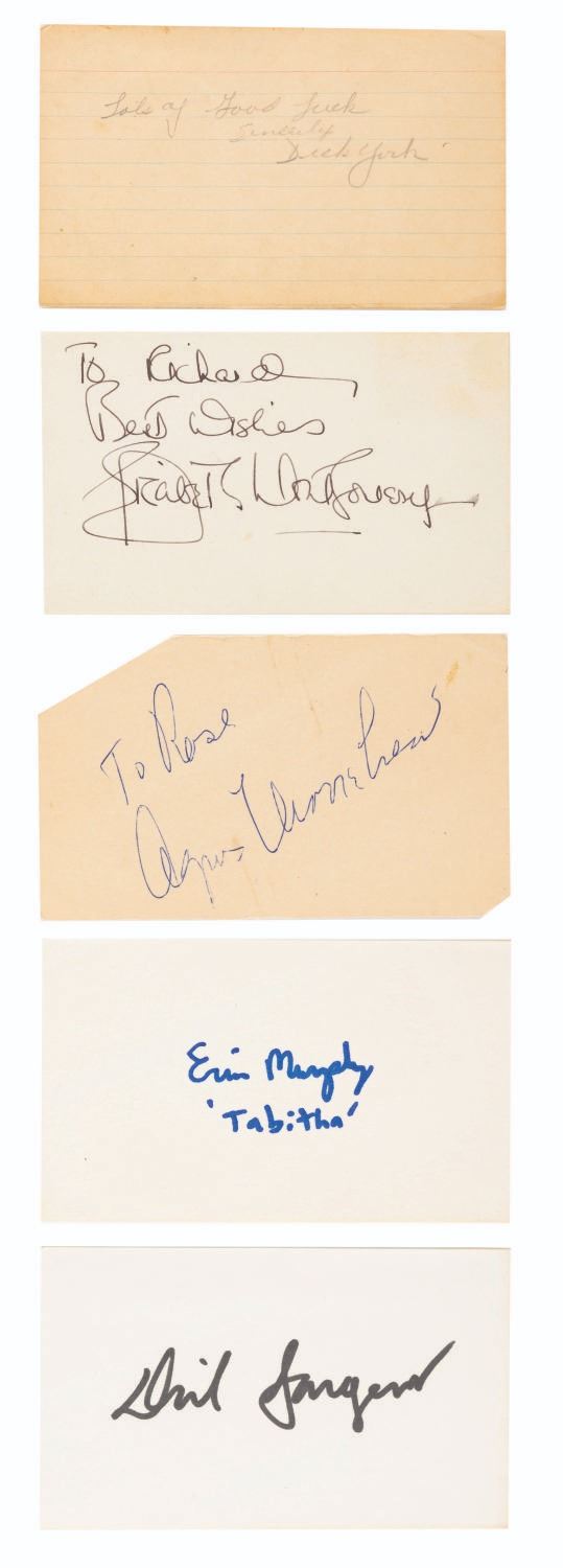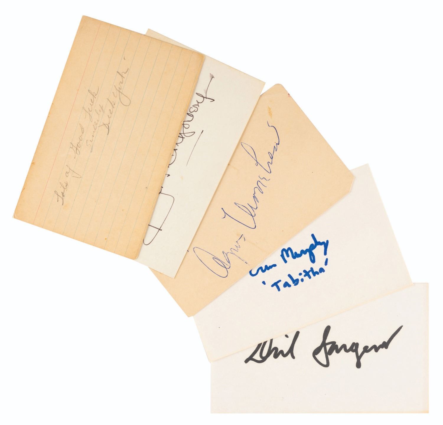 (Screen Gems, 1970s-90s) A rare collection of signatures from the lead cast of “Bewitched.” Included are signatures from Elizabeth Montgomery, Erin Murphy, Agnes Moorehead, and both Darrens - Dick York and Dick Sargent. All signatures are on 3” x 5” index cards and are in very good condition with a 1.5” diagonal cut to the top left corner of Agnes Moorehead’s card that does not affect the signature.