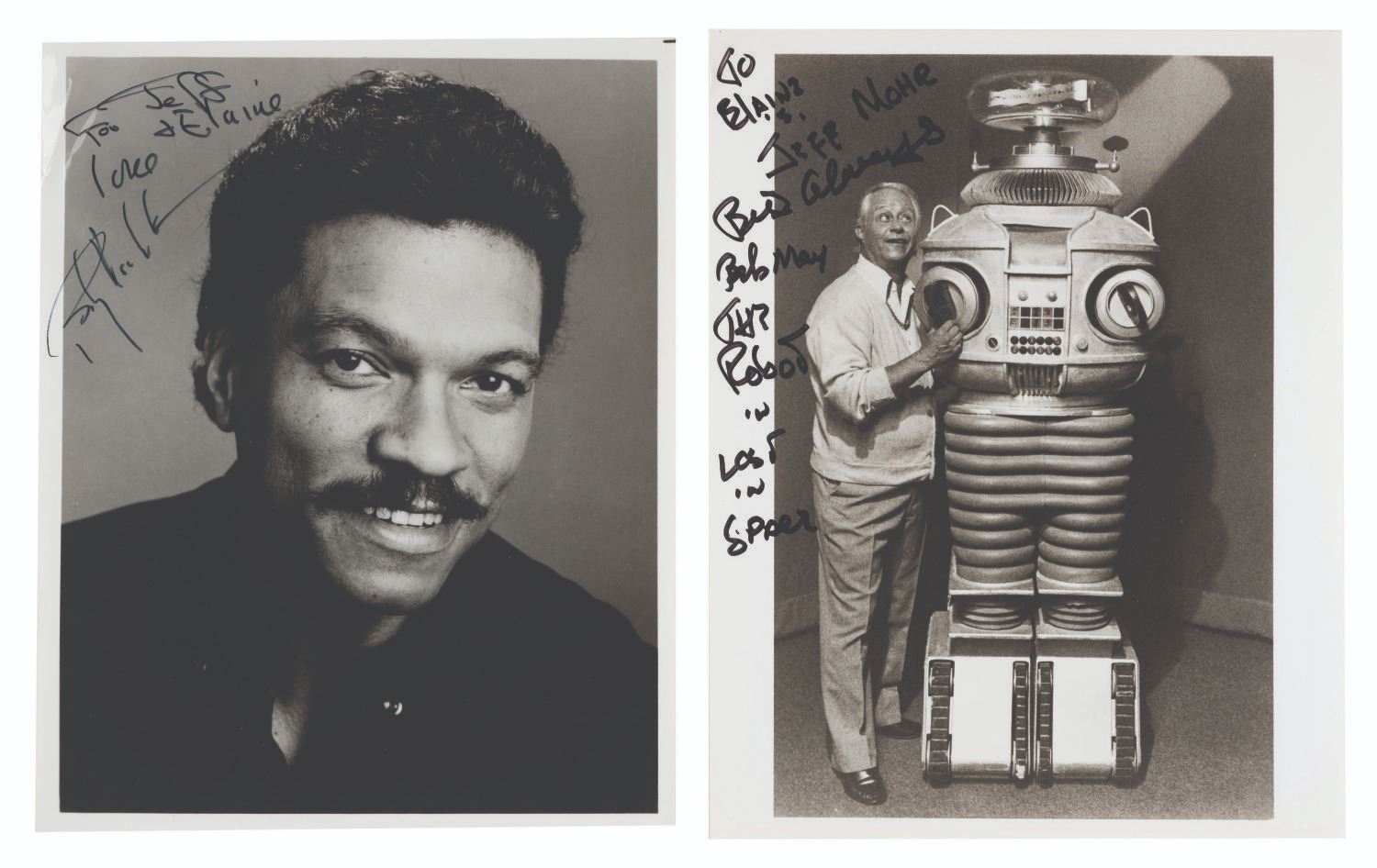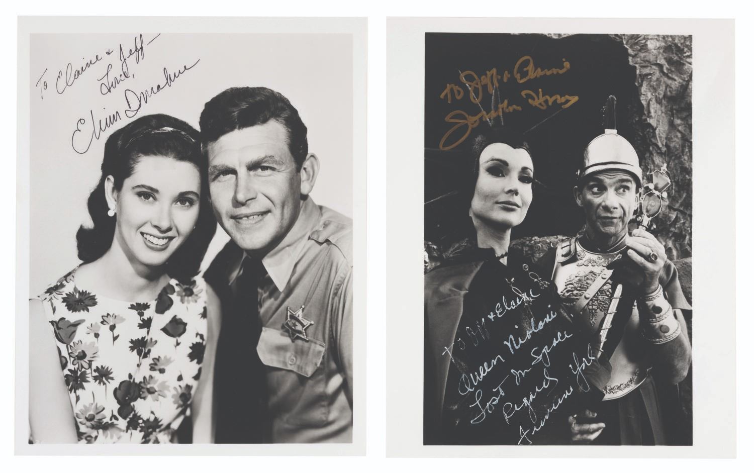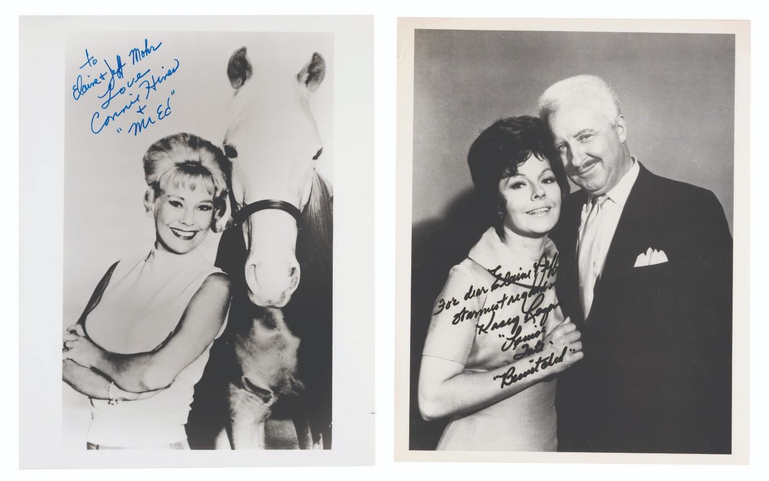 (1980s-2000s) A collection of fourteen photos signed by famous actors from film and television. Movie actors included are Billy Dee Williams from “The Empire Strikes Back,” Daniel Roebuck in “U.S. Marshalls,” and Steve Reeves of “Hercules.” Photos from TV stars include Lee Meriwether from “Batman,” Kasey Rogers and Bernard Fox of “Bewitched,” Elinor Donahue and Betty Lynn of “The Andy Griffith Show,” Russell Johnson and Dawn Wells of “Gilligan’s Island,” Connie Hines from “Mr. Ed,” Sid Melton on “The Danny Thomas Show,” and Jonathan Harris with Francine York and Bob May of “Lost in Space.” Each measuring 8” x 10”, the signed photos are all dedicated to “Elaine and Jeff.” Six are in very good condition, five are in good condition with light wear including some slight creasing to the top left corner, and the Daniel Roebuck print is good with a slight smudge to the dedication. The Steve Reeves print is good with a large crease to the lower left corner, and the Jonathan Harris/ Francine York print is in good condition with a 4” crease horizontally near the bottom.