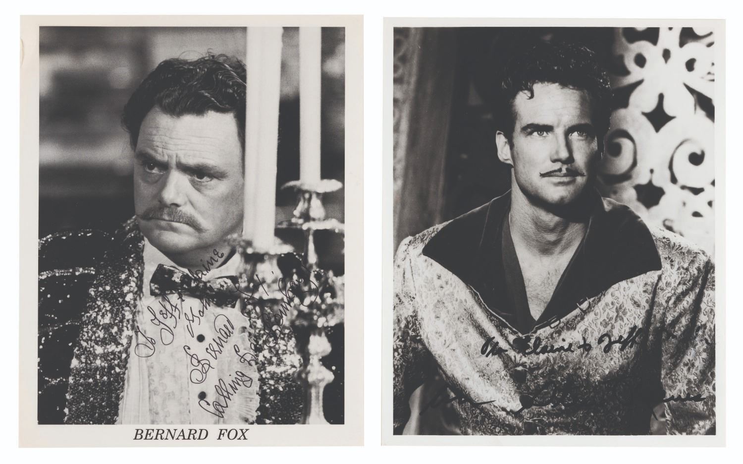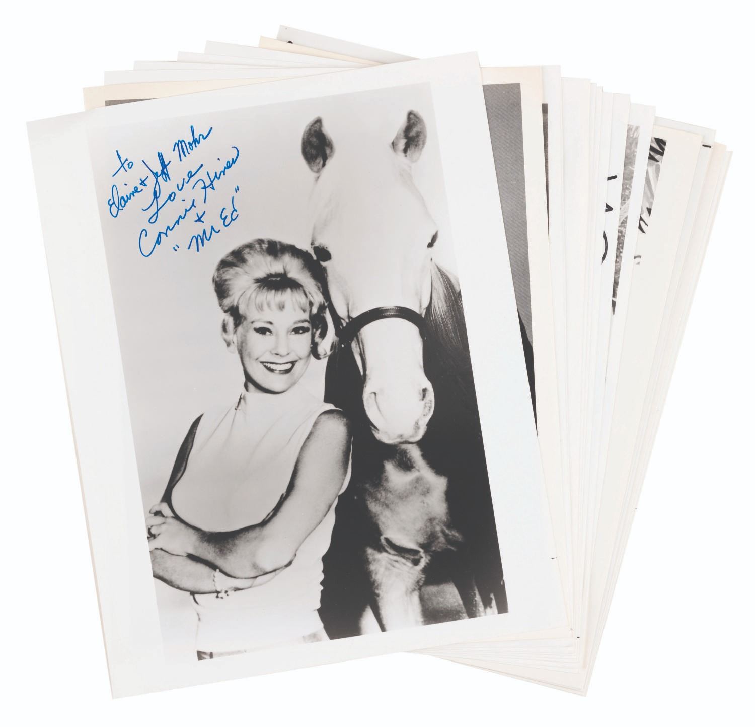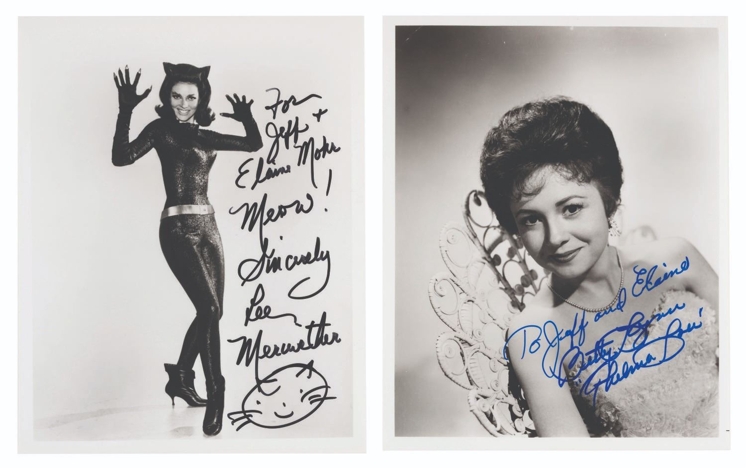 (1980s-2000s) A collection of fourteen photos signed by famous actors from film and television. Movie actors included are Billy Dee Williams from “The Empire Strikes Back,” Daniel Roebuck in “U.S. Marshalls,” and Steve Reeves of “Hercules.” Photos from TV stars include Lee Meriwether from “Batman,” Kasey Rogers and Bernard Fox of “Bewitched,” Elinor Donahue and Betty Lynn of “The Andy Griffith Show,” Russell Johnson and Dawn Wells of “Gilligan’s Island,” Connie Hines from “Mr. Ed,” Sid Melton on “The Danny Thomas Show,” and Jonathan Harris with Francine York and Bob May of “Lost in Space.” Each measuring 8” x 10”, the signed photos are all dedicated to “Elaine and Jeff.” Six are in very good condition, five are in good condition with light wear including some slight creasing to the top left corner, and the Daniel Roebuck print is good with a slight smudge to the dedication. The Steve Reeves print is good with a large crease to the lower left corner, and the Jonathan Harris/ Francine York print is in good condition with a 4” crease horizontally near the bottom.