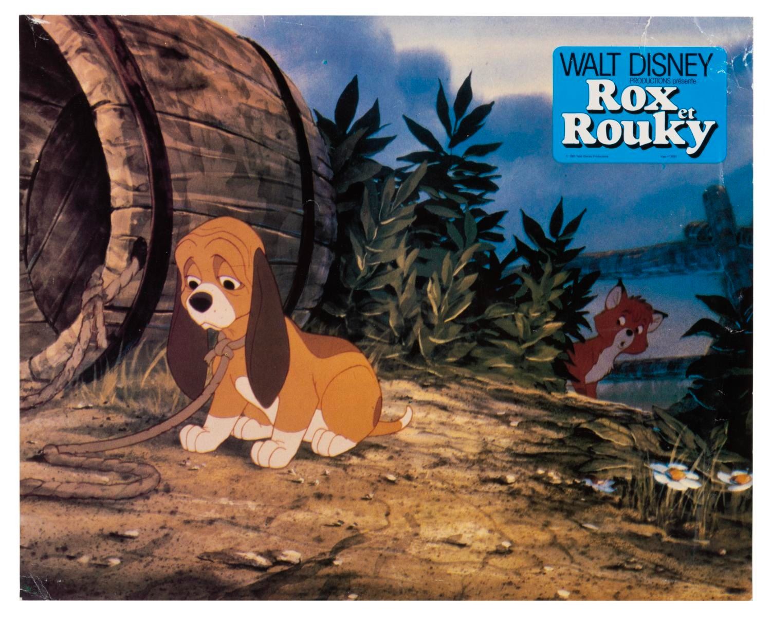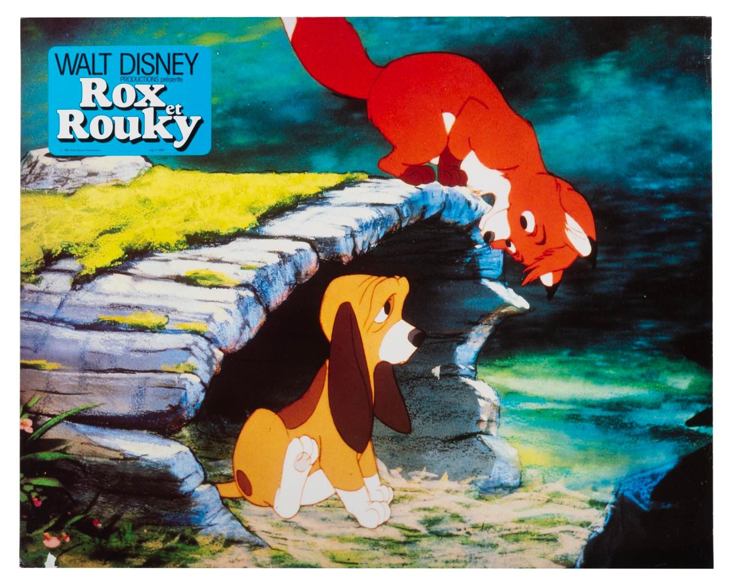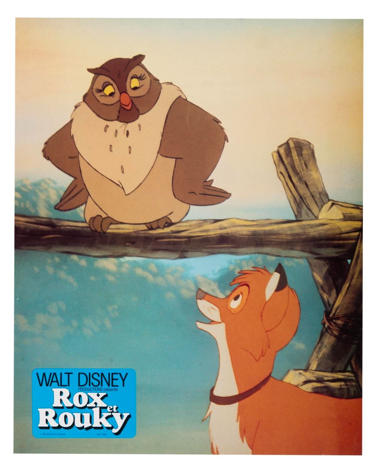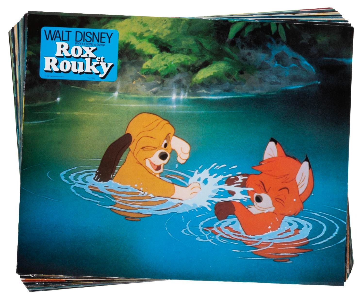 (Disney, 1981) A collection of 18 French "The Fox and the Hound" publicity photos featuring Copper, Tod, Vixey, Big Mama, and Boomer. Measuring 9" x 11.5", the photos are in good condition with light creasing, edge wear, and discoloration.