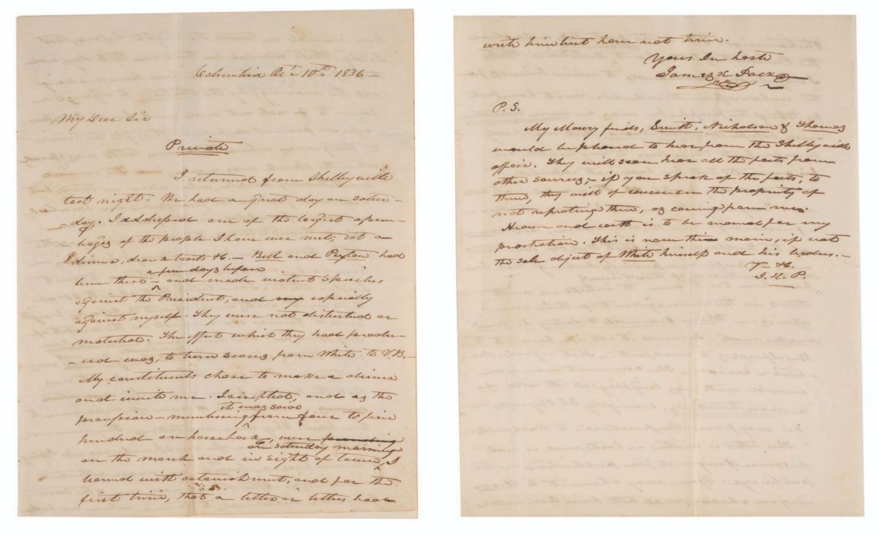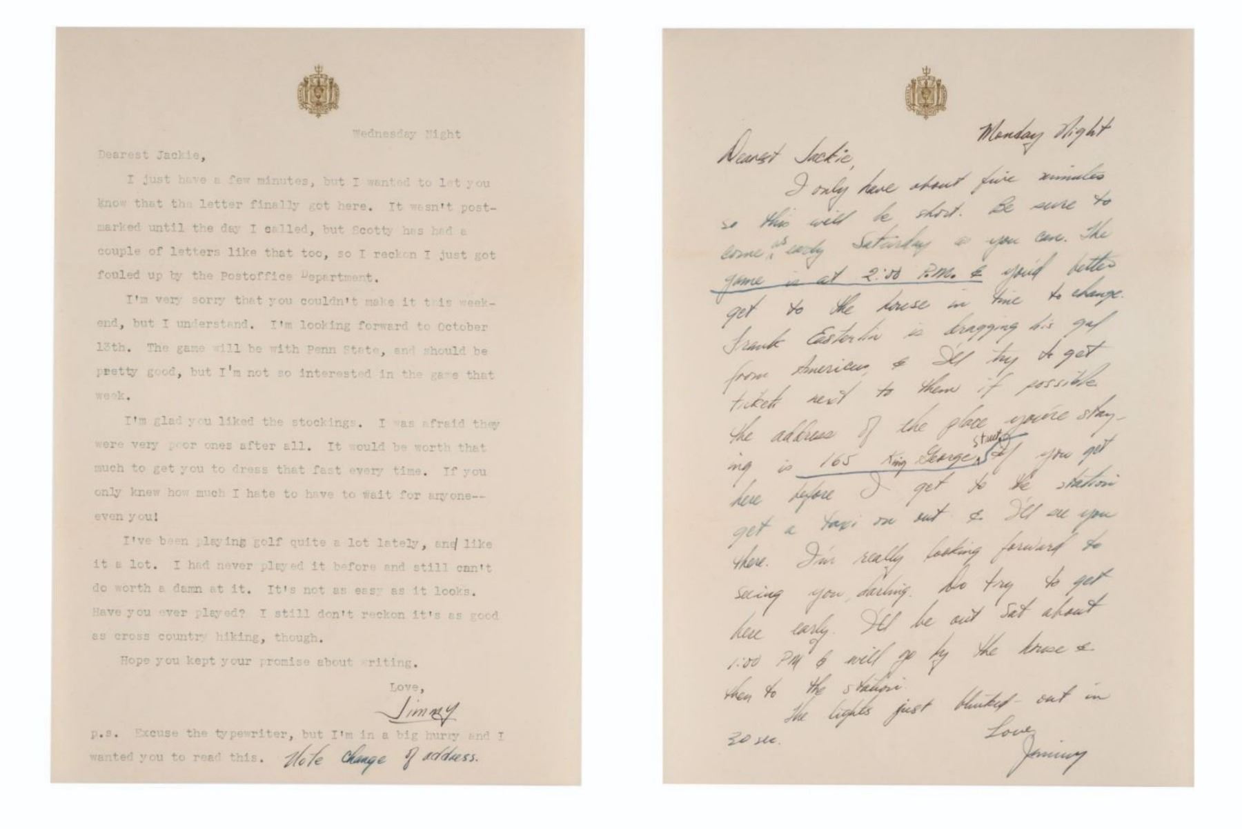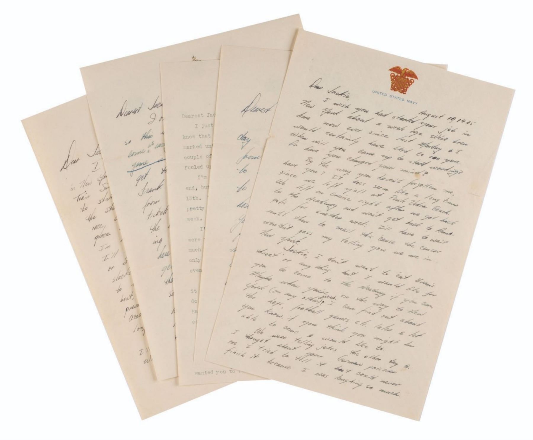 (Jimmy Carter, 1945) A collection of five love letters written and signed by future U.S. President Jimmy Carter to his sweetheart at the time, Miss Jaquelyn Reid. Carter wrote the letters while he was attending the U.S. Naval Academy at Annapolis and mere months before he married future first lady Rosalynn Smith. Four letters were written on U.S. Naval Academy stationery and include the original envelope, while the fifth was written on U.S. Navy stationery and does not include the envelope. Measuring 7.25" x 10.5" to 7.25" x 11", the letters are in very good condition with light discoloration from age and slight edge wear.
