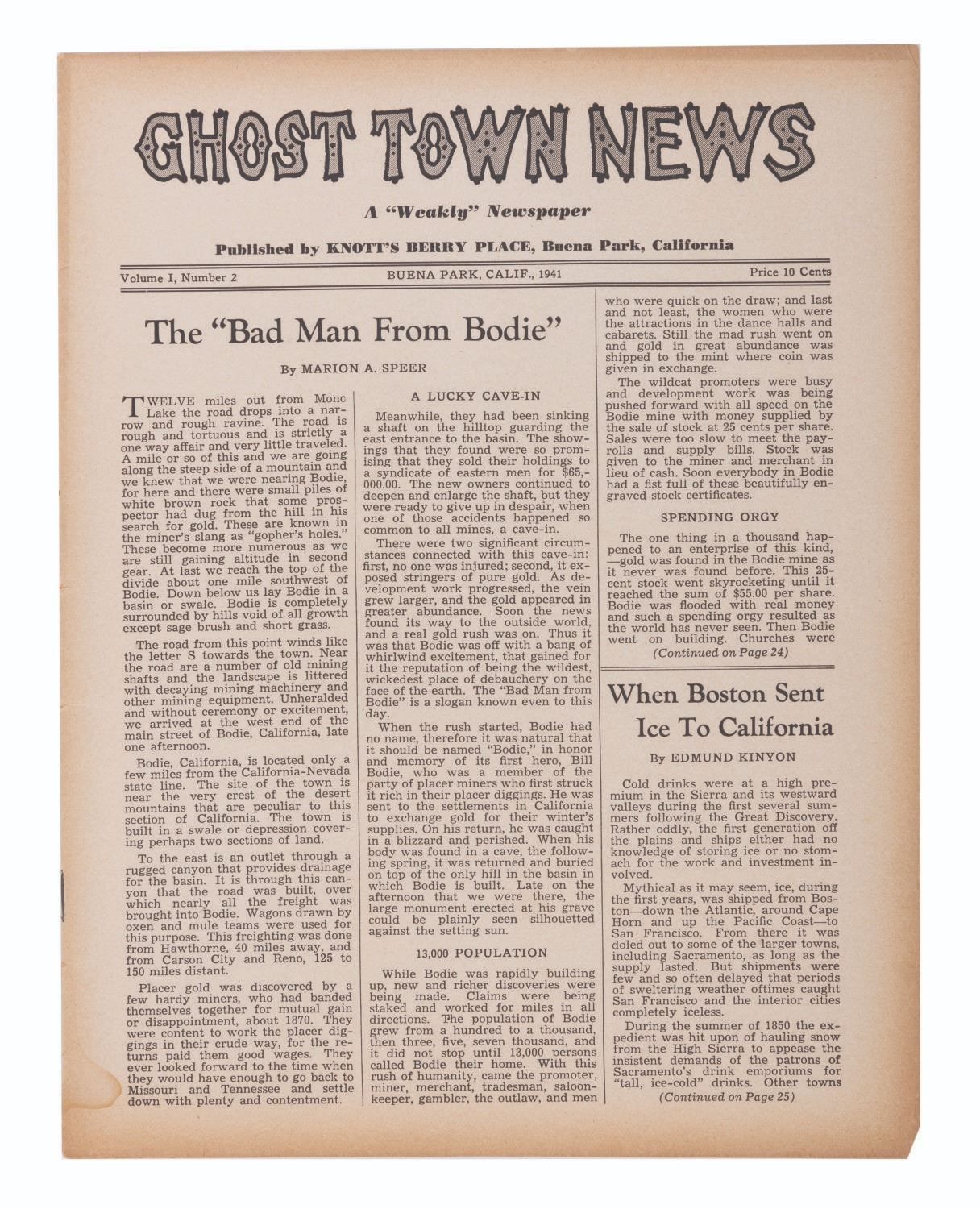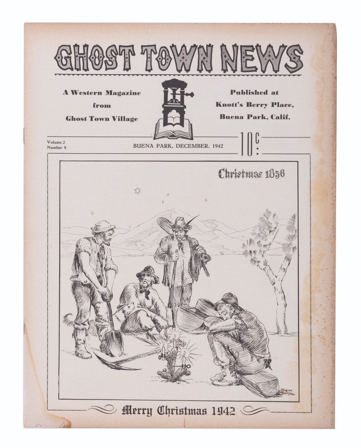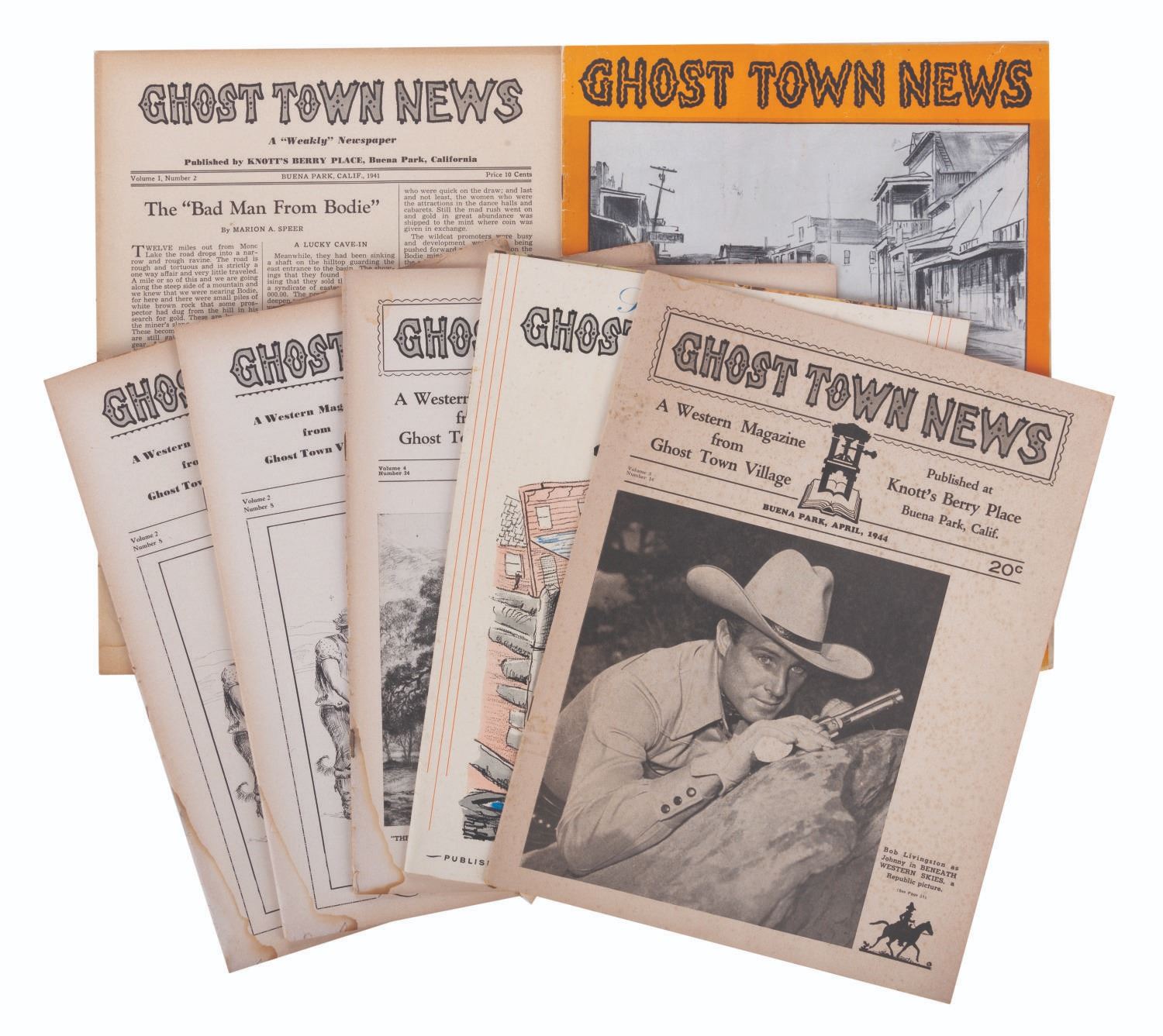 (Knott's Berry Place, 1940s) A collection of seven issues of The Ghost Town News, the official publication of Knott's Berry Farm. The issues range from Vol. 1 issue #2, dated 1941, to Vol. 5 #31, dated May 1946. Included are two copies of a December 1942 issue, and one undated Special Souvenir Issue. Measuring 8.5"x11", the magazines are in good condition, with some spotting, and edge wear including some staining to the spine and edges.