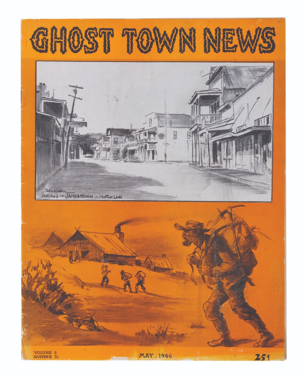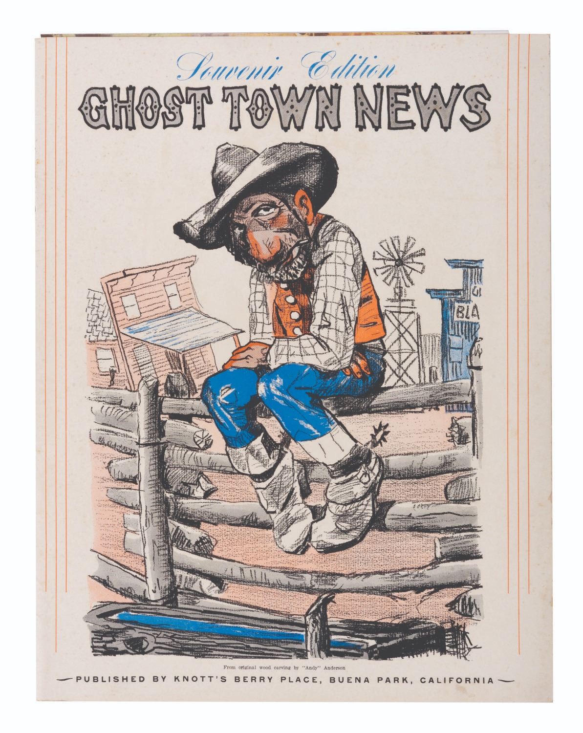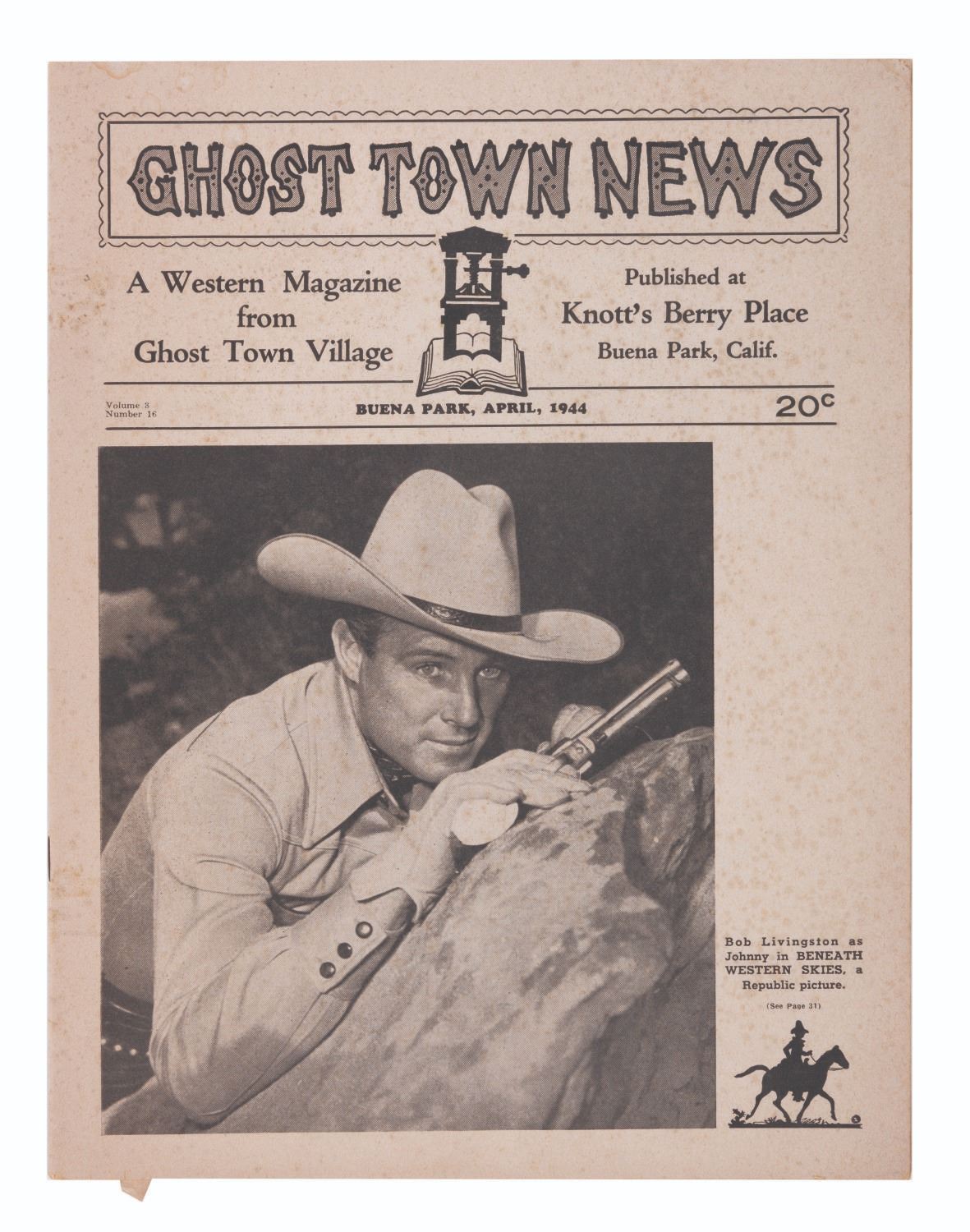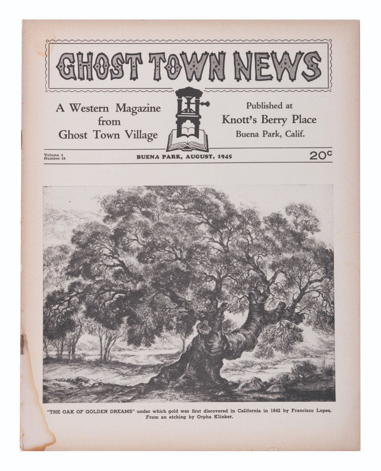 (Knott's Berry Place, 1940s) A collection of seven issues of The Ghost Town News, the official publication of Knott's Berry Farm. The issues range from Vol. 1 issue #2, dated 1941, to Vol. 5 #31, dated May 1946. Included are two copies of a December 1942 issue, and one undated Special Souvenir Issue. Measuring 8.5"x11", the magazines are in good condition, with some spotting, and edge wear including some staining to the spine and edges.