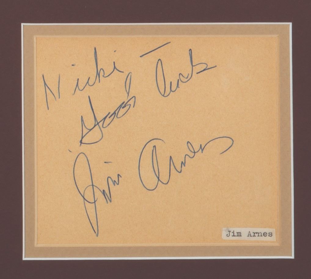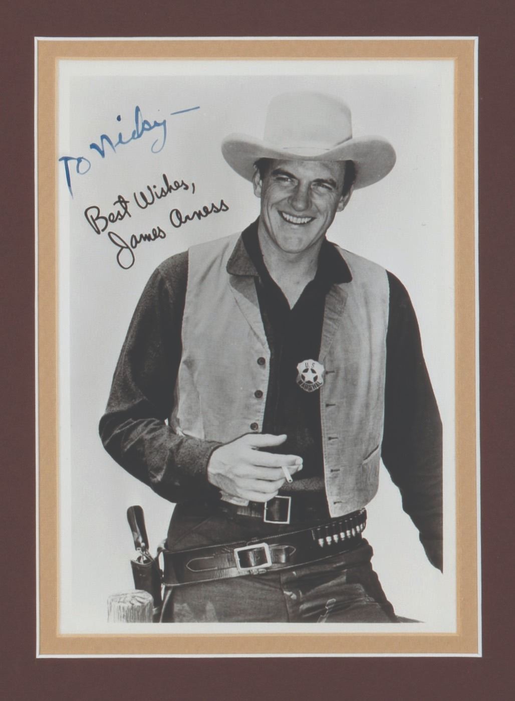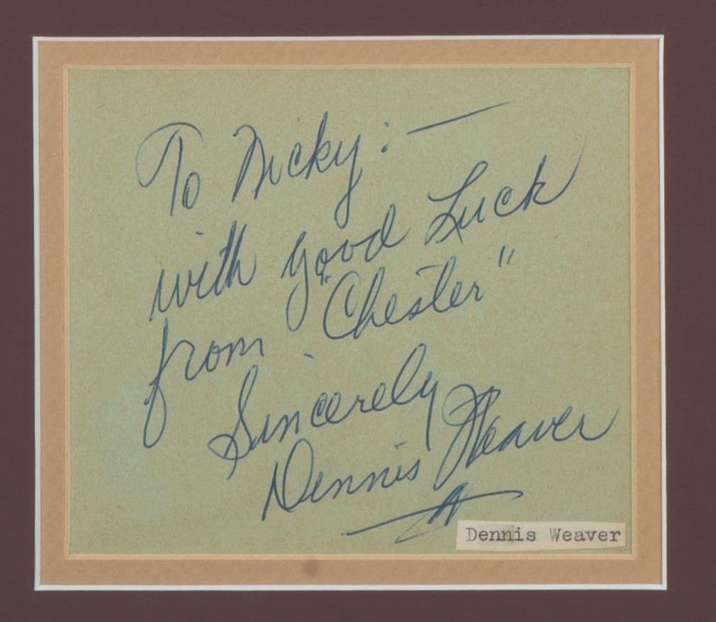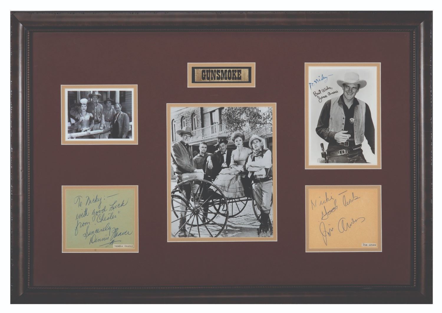 (CBS, 1950s) A pair of signatures from the cast of Gunsmoke. Included are pages signed with dedication by both James Arness (Matt Dillon) and Dennis Weaver (Chester). In addition, included is a fan card with pre-printed signature that Arness has added a hand-written dedication to. The pair are mounted in a 20.5"x29.5" frame with (2) photos of the show's cast. The pages each show 4"x5" visible and the fan card 5"x7", all appearing in very good condition.