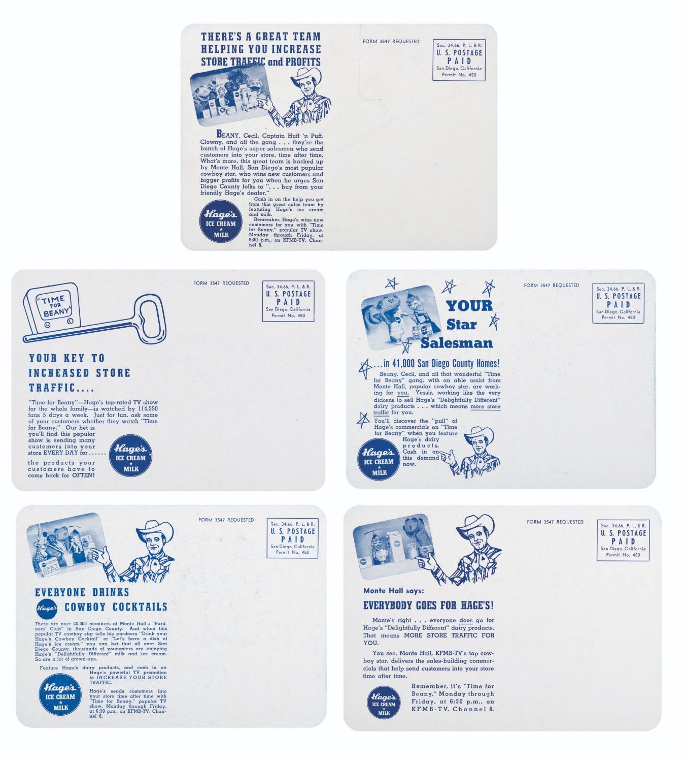(Hage’s, 1950s) A collection of five Hage’s “Time for Beany” promotional postcards featuring the stars of the show, with airtimes and information on Hage’s ice cream. Measuring 5” x 7” each, the postcards are in very good condition with light creases, scratches, and wear.