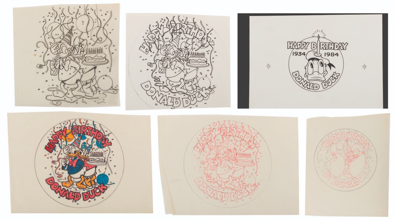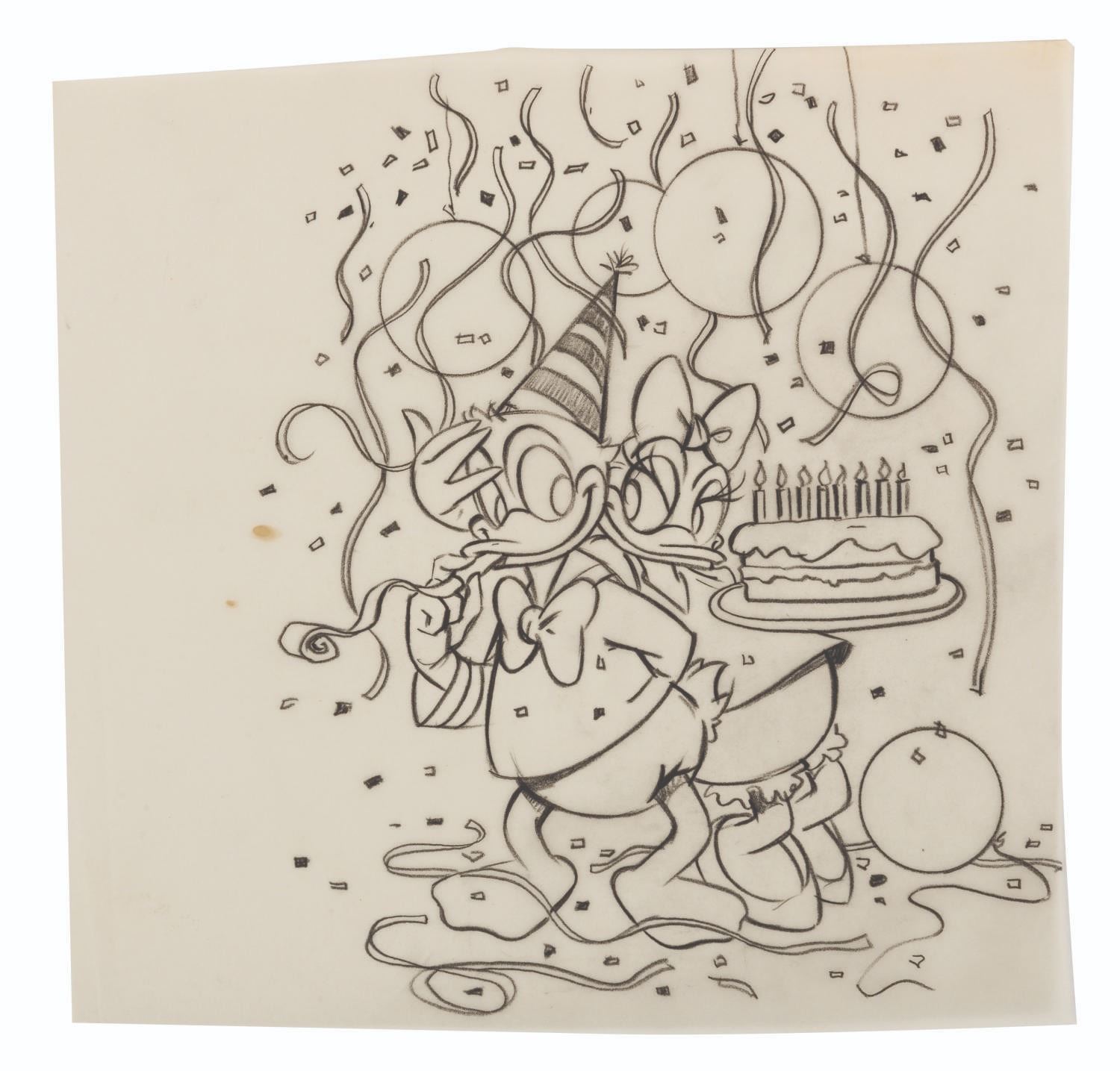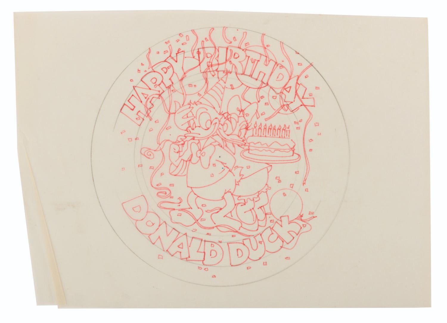 (Disneyland/Walt Disney World, 1984) A collection of six concept renderings created for Donald Duck’s 50th birthday celebration at Disneyland and Walt Disney World. The artwork featuring Donald and Daisy Duck was created for use by the Marketing Department. Ranging in size from 5” x 8” to 9.75” x 10.5”, the pieces display in very good condition with creases, light stains, and wear.