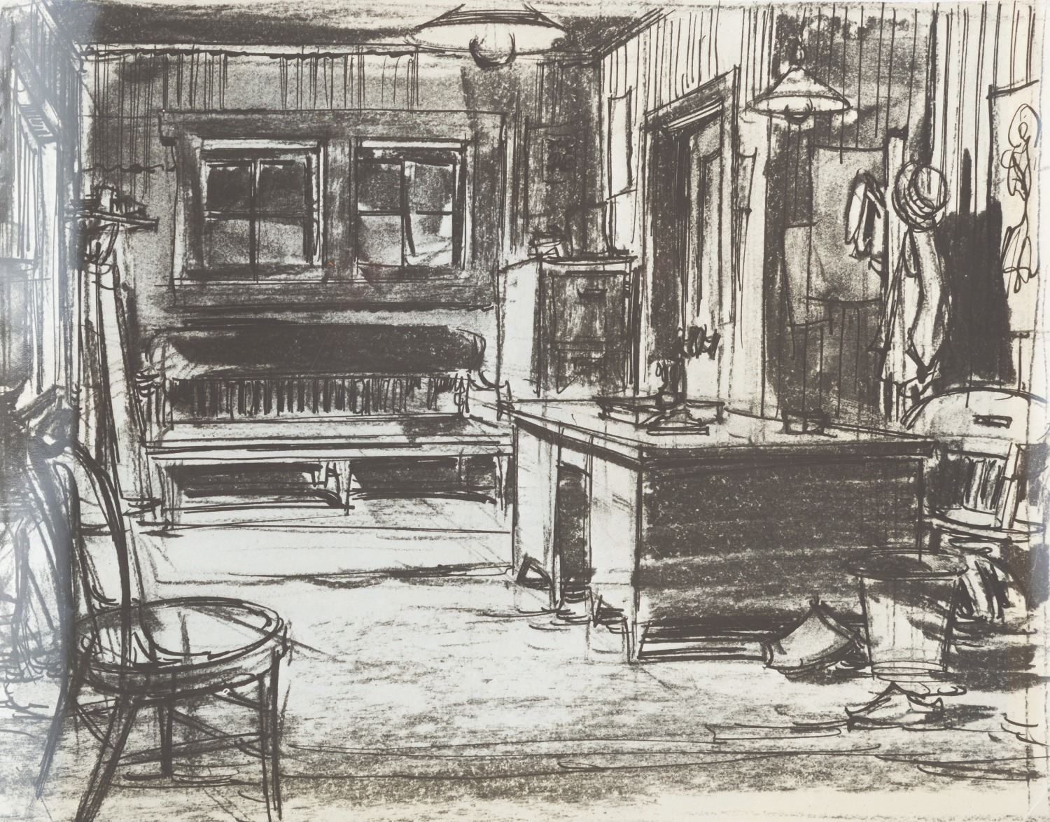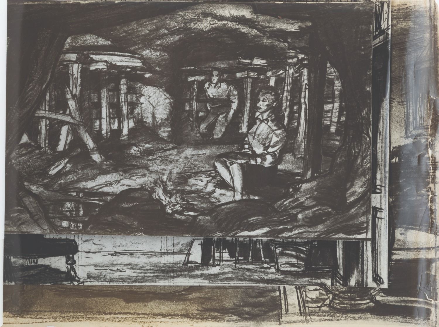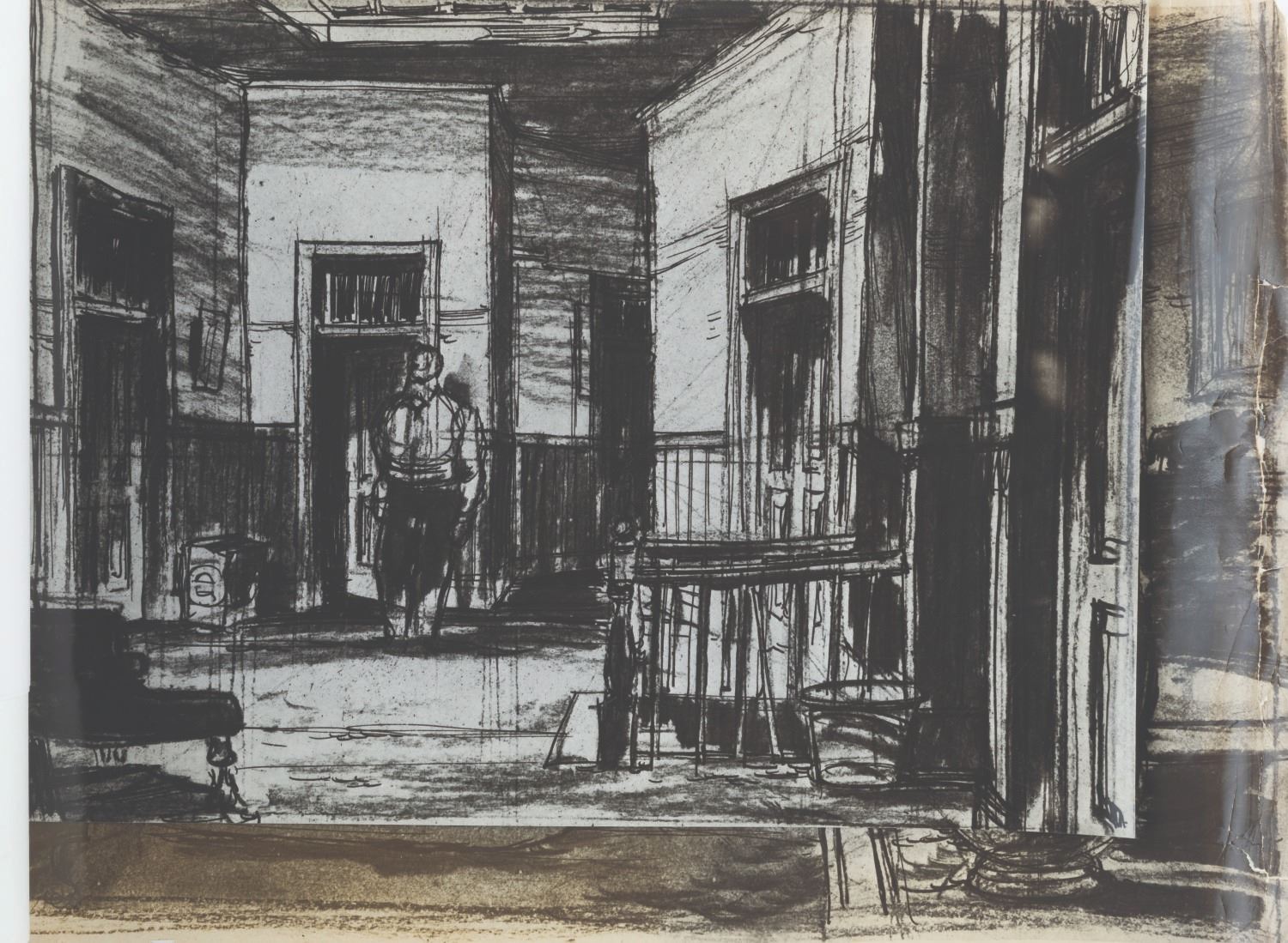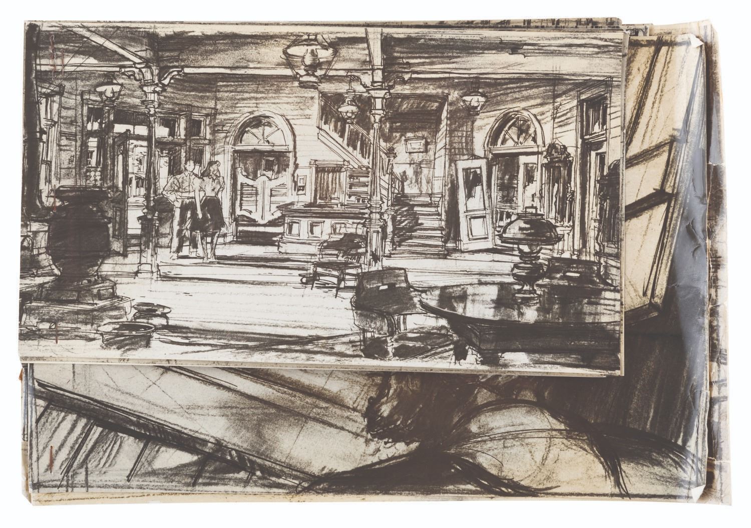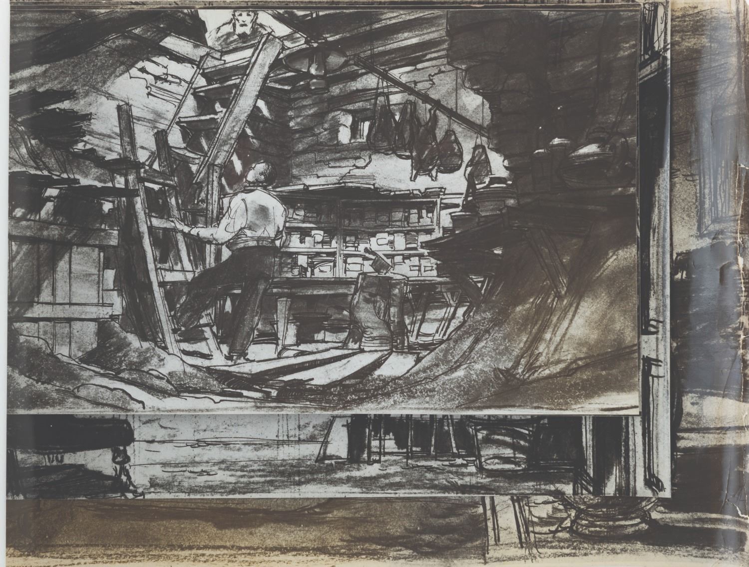 (Goff, 1930s-40s) A collection of 12 photo prints of set designs by Harper Goff for an unknown film production, featuring a hotel, livery, and mine. The glossy black and white prints measure from 6.5” x 11” to 9” x 12.5” and have been stapled together on the left edge. the photos are in fair to good condition with discoloration from age, creasing and tears along the edges. Disneyland. Artist Harper Goff’s fingerprints are all over pop culture’s history. Goff first met Walt Disney in London when the two collectors tried to buy the same train set. The Disney Legend would go on to design the Nautilus, create concepts for Main Street, U.S.A., and even play banjo in the popular Firehouse Five Plus Two, a band consisting of Goff and his fellow Disney artists. Goff’s talents were appreciated throughout Hollywood, as he worked for many different studios over the years. We are proud to have some of his wonderful designs up for auction.