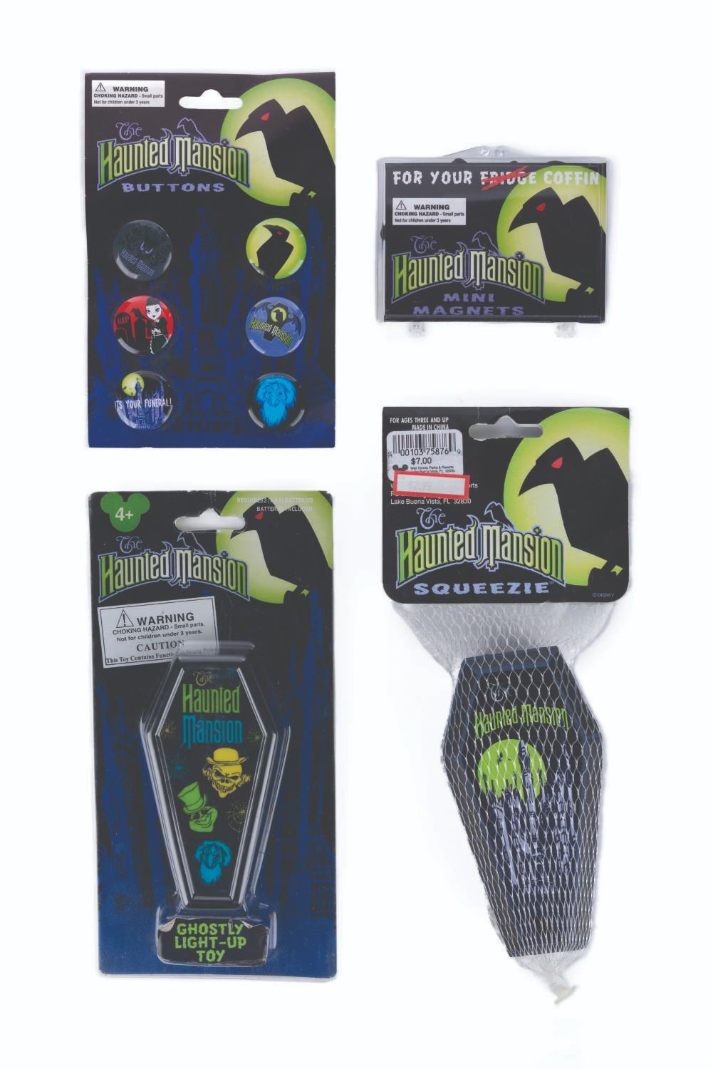 (Disney Parks) A Disney Parks Haunted Mansion souvenir collection. Included are a six-button set, a ghostly light-up toy, mini magnets, and a squeeze toy. Each piece is in fine condition.