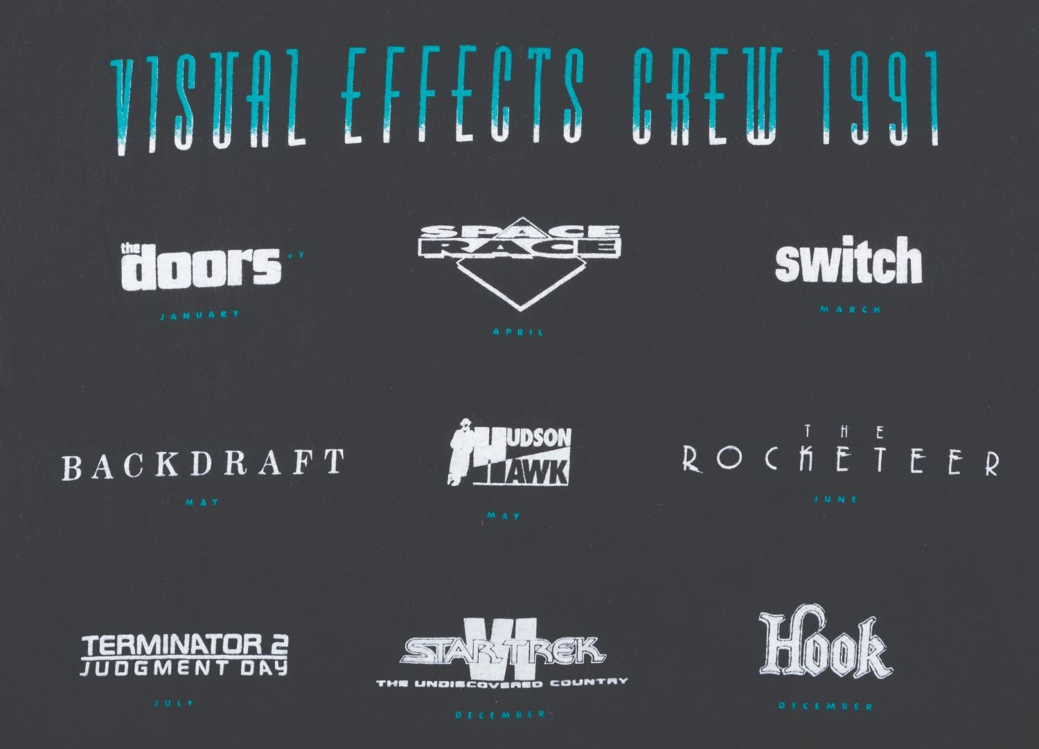 (TriStar, 1991) Production souvenirs from Steven Spielberg’s "Hook,” starring Robin Williams and Dustin Hoffman. Included are three production-used prints of Peter, Hook, and Tootles, used for special effects animation, a premiere program and admission ticket, an Industrial Light & Magic t-shirt labeled a men’s M, a keychain, part of a plastic doubloon prop, and three Hook lapel pins. Ranging in size from the 1” x 0.5” lapel pins to the 14” x 17” prints, the items are in good to fine condition with light edge wear and creasing to the prints and program.