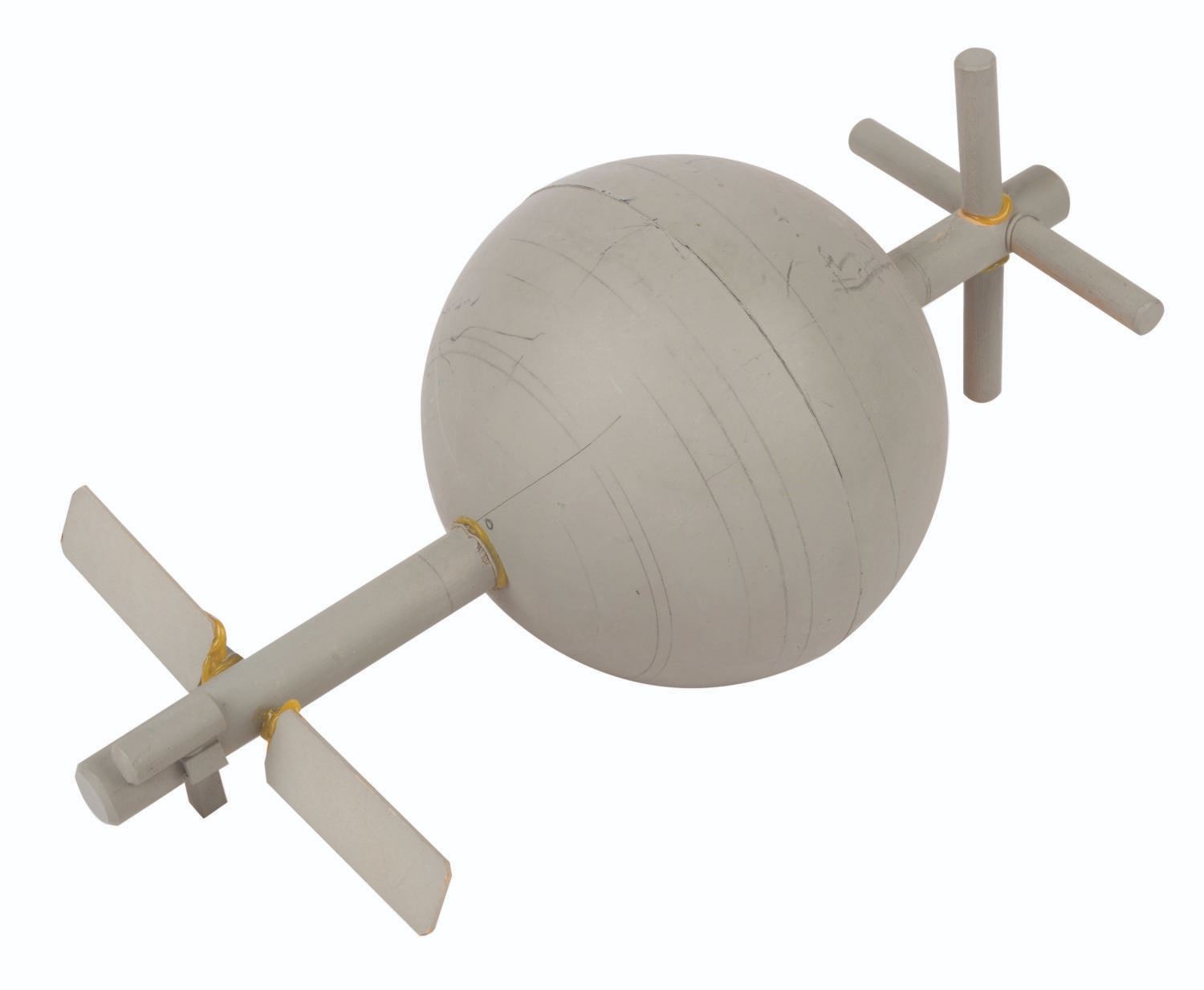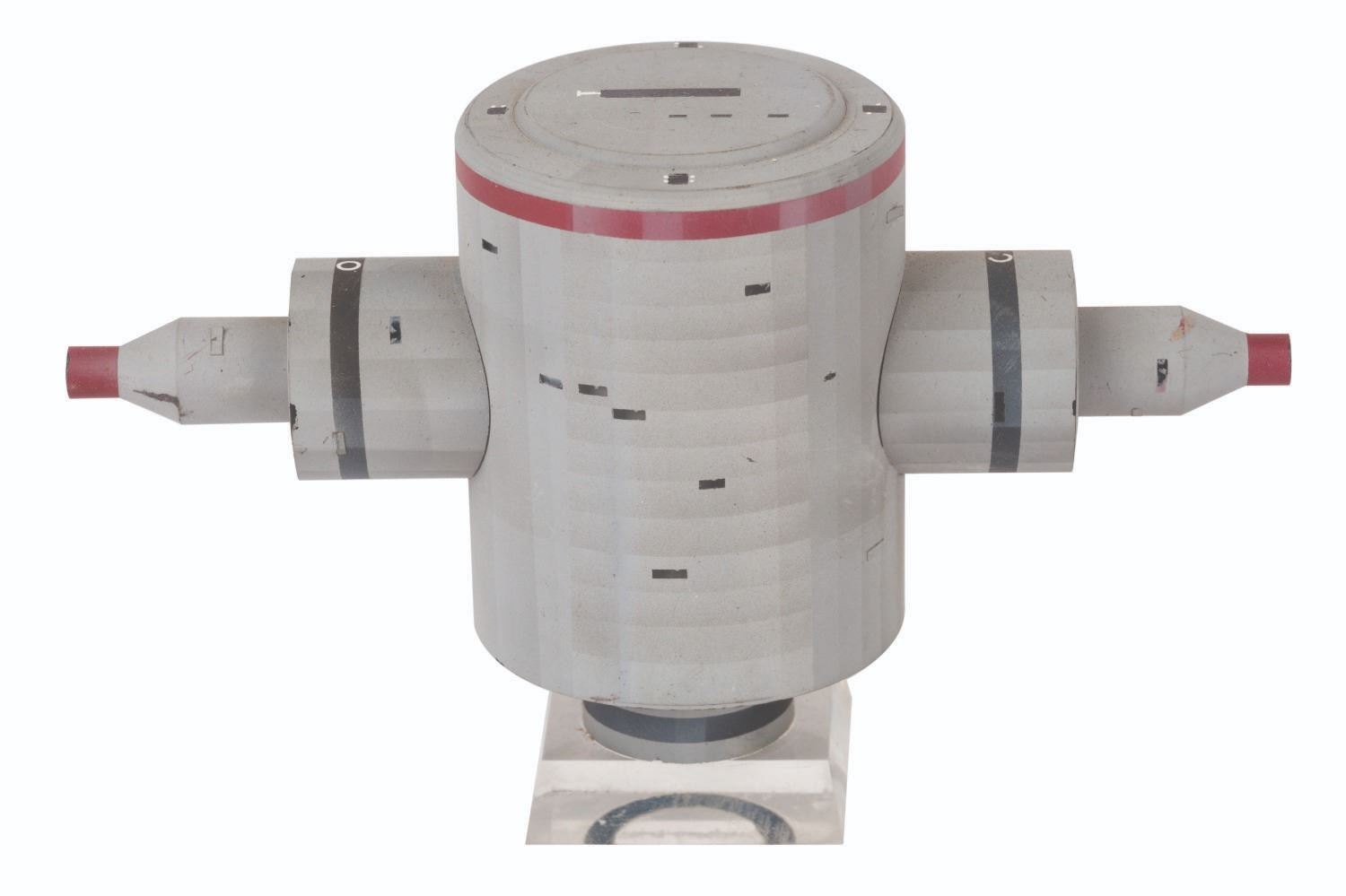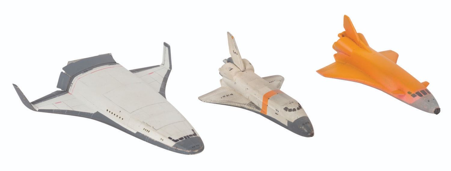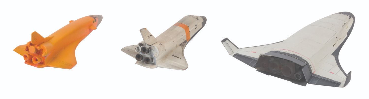 (EPCOT Center, 1976-83) A collection of miniature production-used models from the Horizons Brava Centauri scene. Included are one large Brava Centauri prototype model, three space shuttles, and one other miniature handcrafted model. Also included is a circuit board wired with resistors and light bulbs for illumination of the Brava Centauri model. Measuring various sizes from 3" to 11", this mixed media model collection exhibits rough areas, voids, and imperfections from the casting, hand-painted, and production processes, and displays a very good to fine condition.
