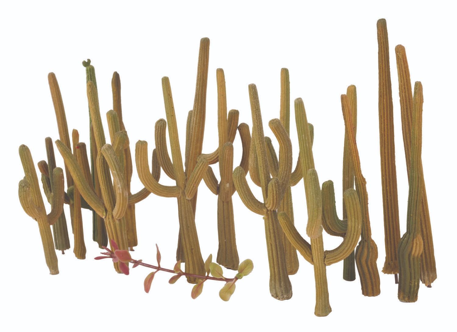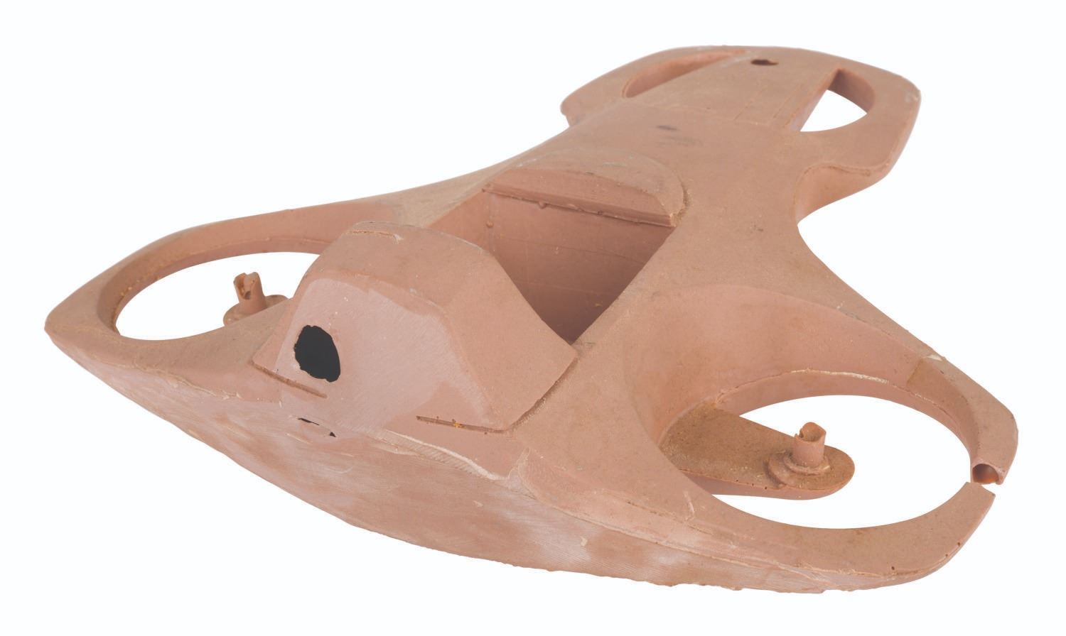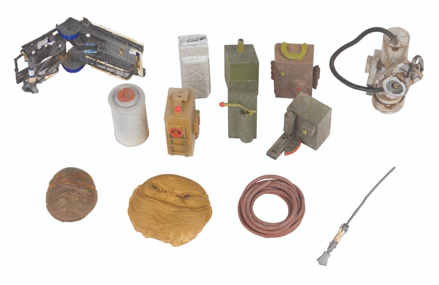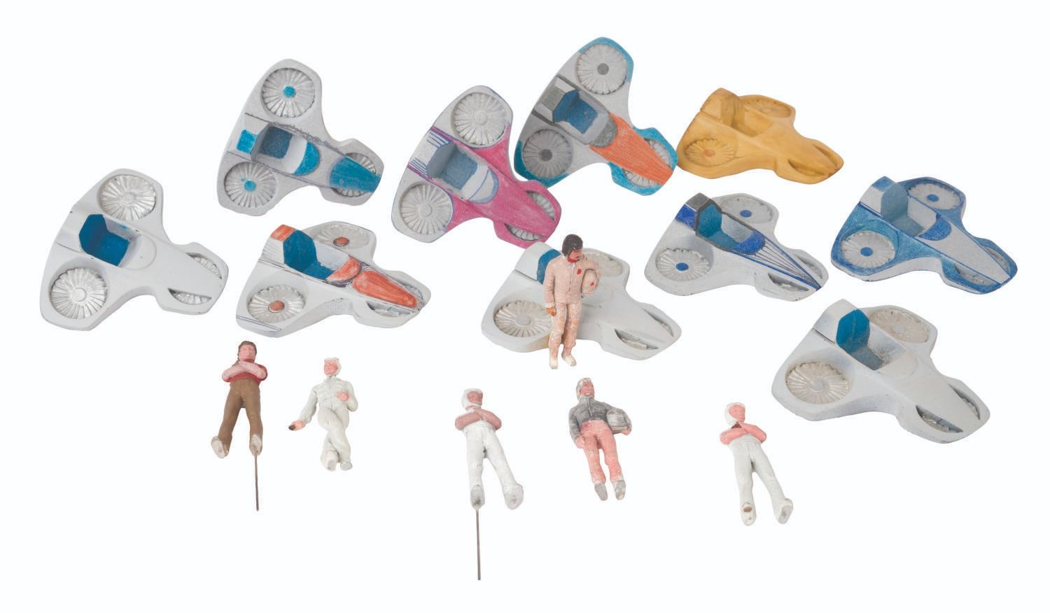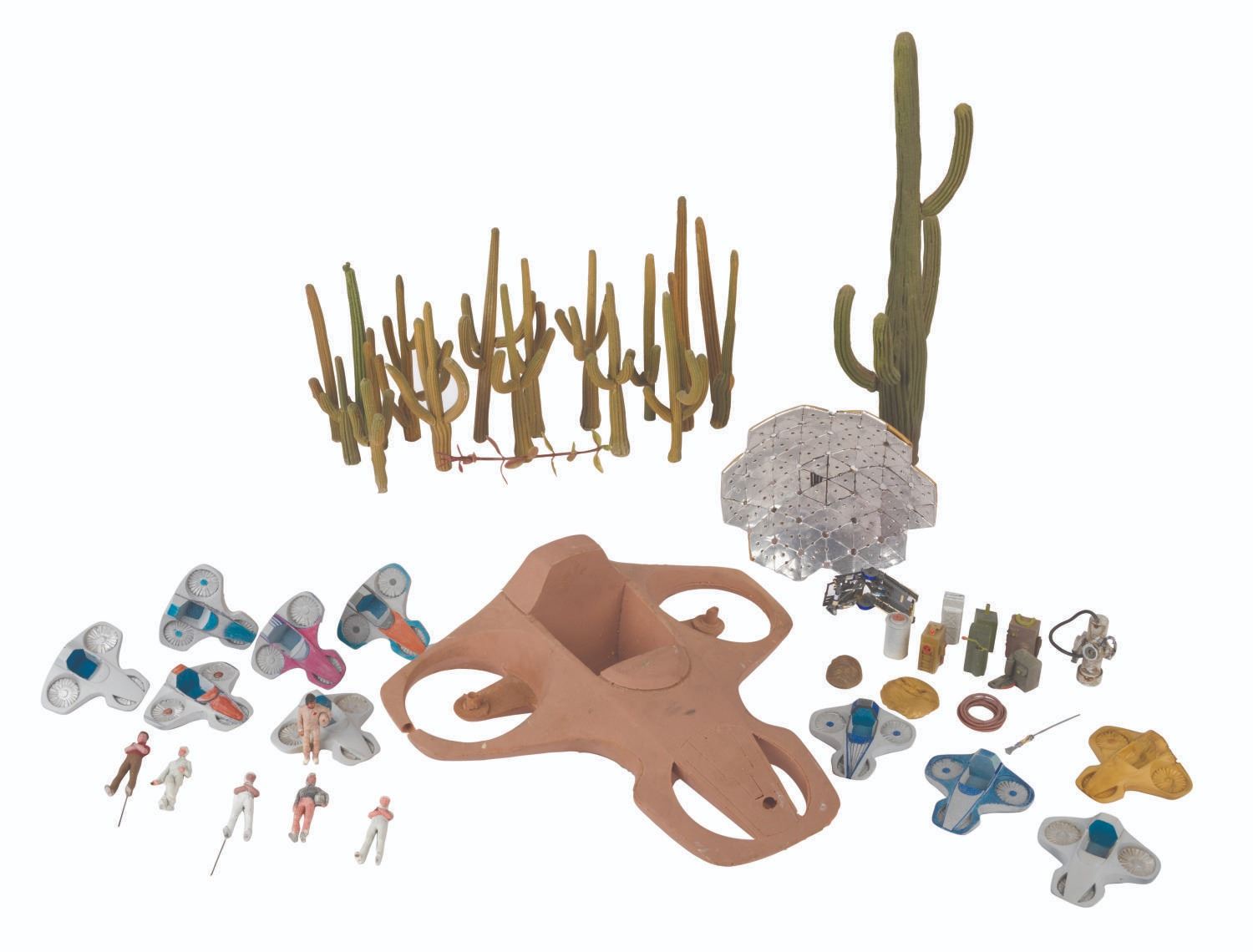 (EPCOT Center, 1976-83) A collection of miniature production-used models from the Horizons Mesa Verde Scene. Included are one large Hoverlift prototype model, eleven miniature Hoverlift prototype models, six human figures, 20 cacti, and numerous miniature handcrafted parts. Also included is a reflective satellite dish model prepared for the Space Colony film. Measuring various sizes up to 10", this mixed media model collection exhibits rough areas, voids, and imperfections from the casting, hand-painted, and production processes, and displays a very good to fine condition.