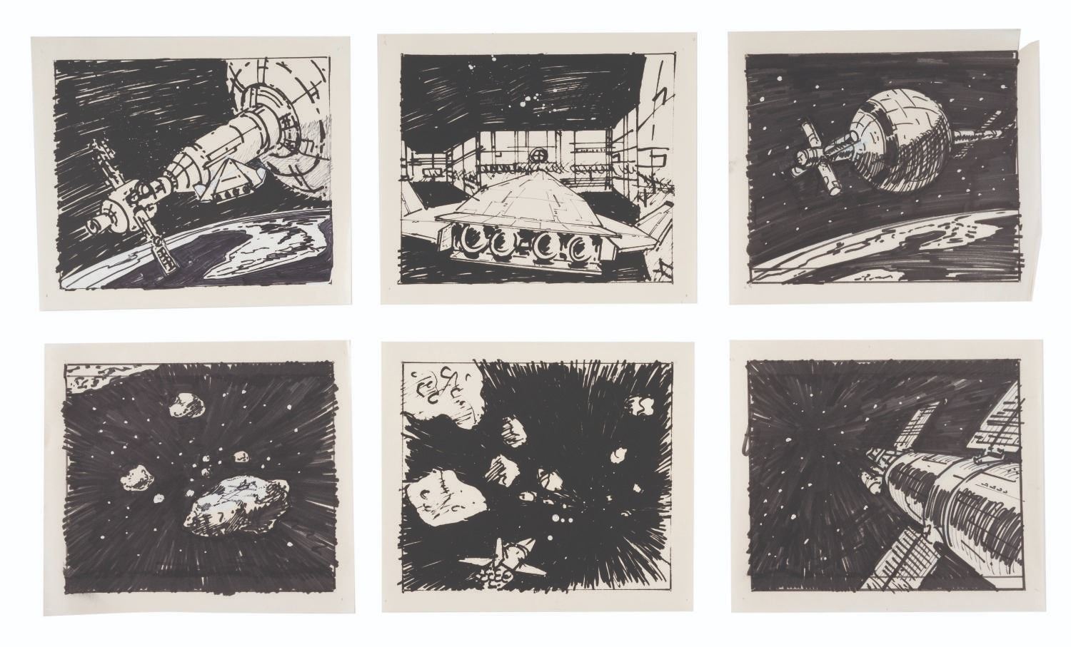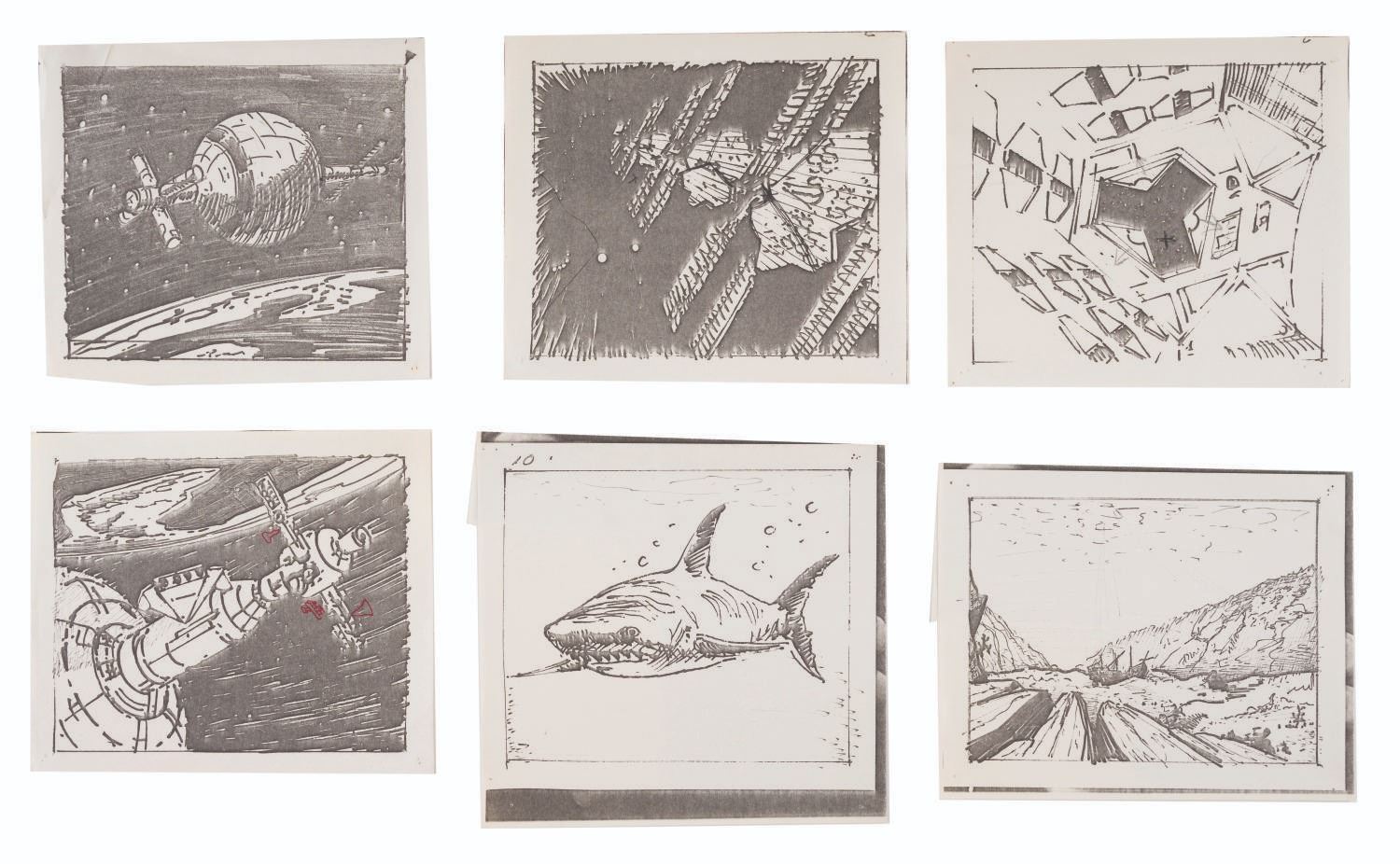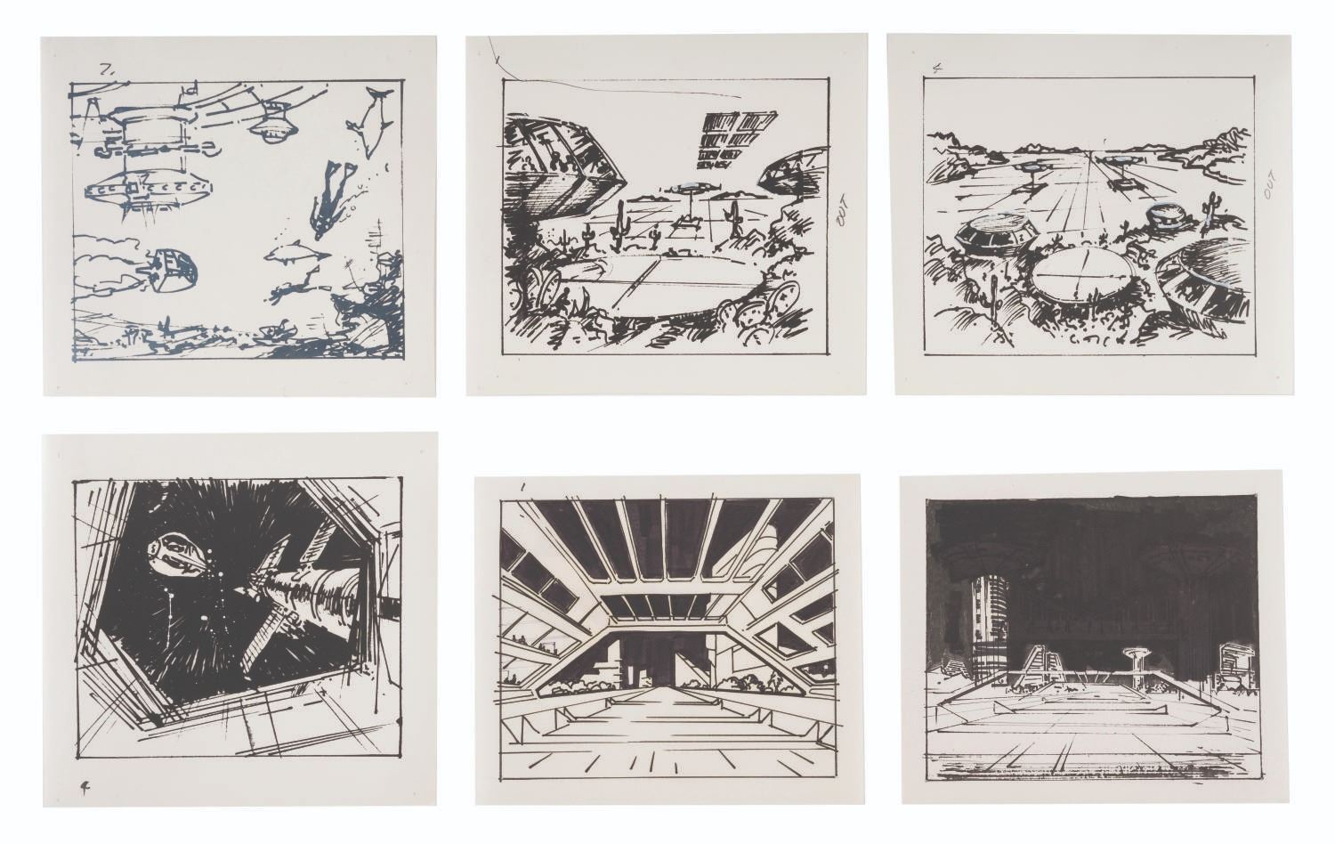 (EPCOT Center, 1976-83) A collection of 129 storyboard panel production copies for the three "Choose Your Tomorrow" ending films for Horizons. Each sheet features an image, with some hand-drawn elements, of Brava Centauri, Sea Castle, and Mesa Verde scenes from the fly-through films. Measuring 6.25"x6.75", each storyboard panel is in very good to fine condition, with pin holes, light creases, and wear from production use.