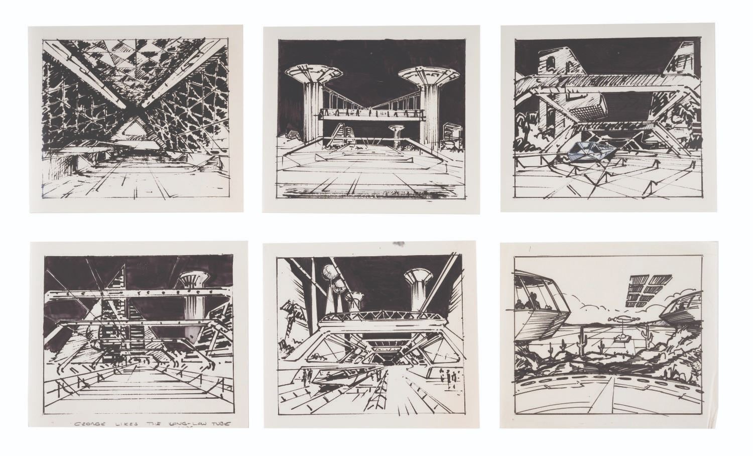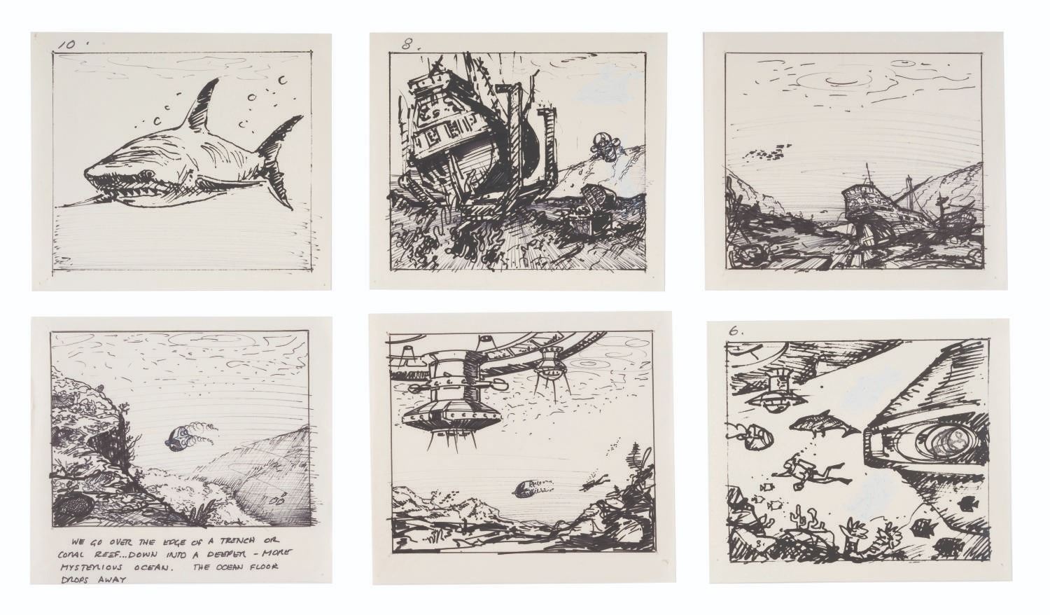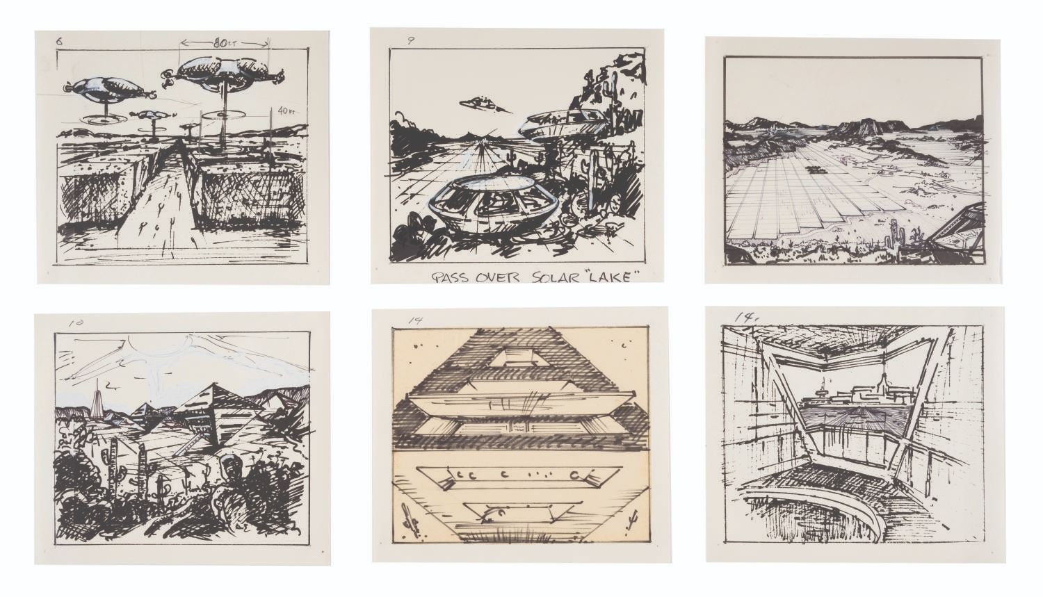 (EPCOT Center, 1976-83) A collection of 129 storyboard panel production copies for the three "Choose Your Tomorrow" ending films for Horizons. Each sheet features an image, with some hand-drawn elements, of Brava Centauri, Sea Castle, and Mesa Verde scenes from the fly-through films. Measuring 6.25"x6.75", each storyboard panel is in very good to fine condition, with pin holes, light creases, and wear from production use.