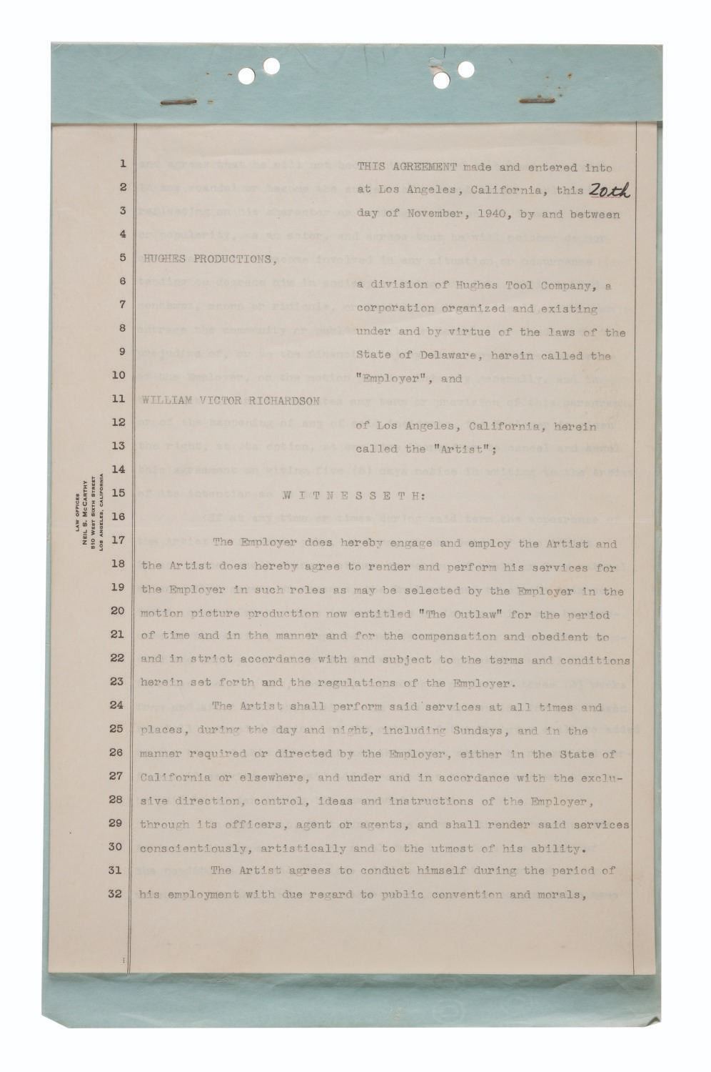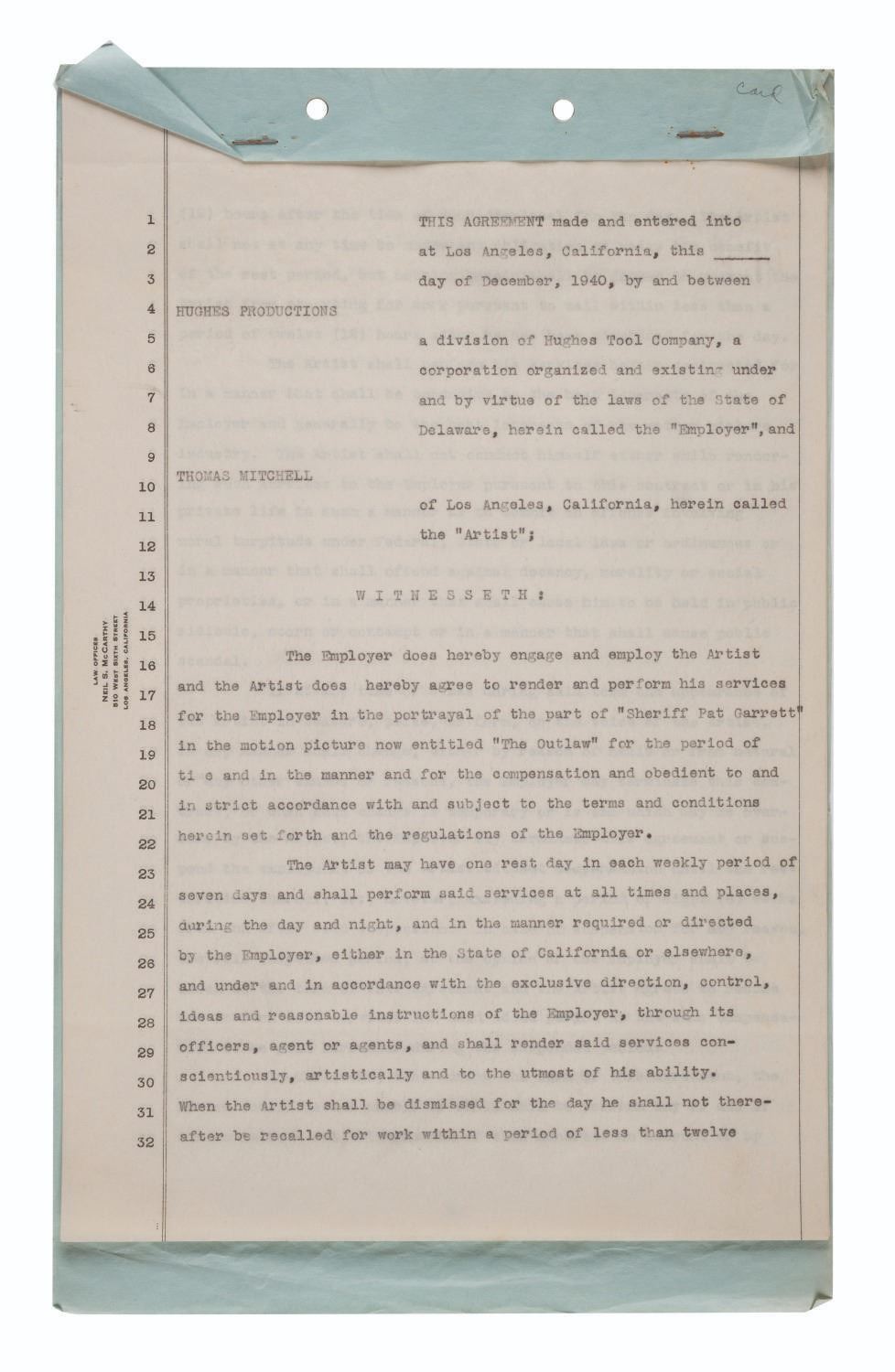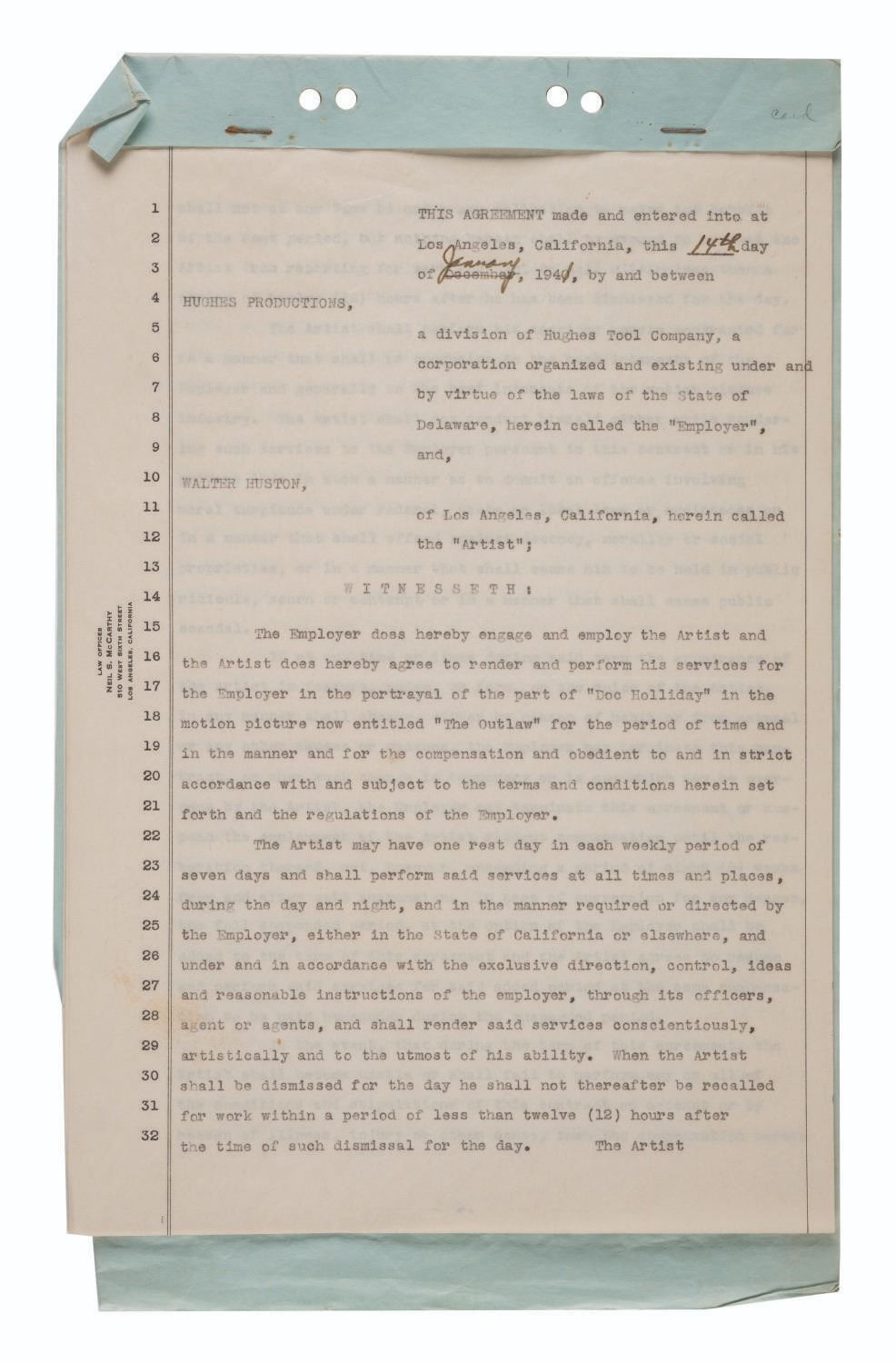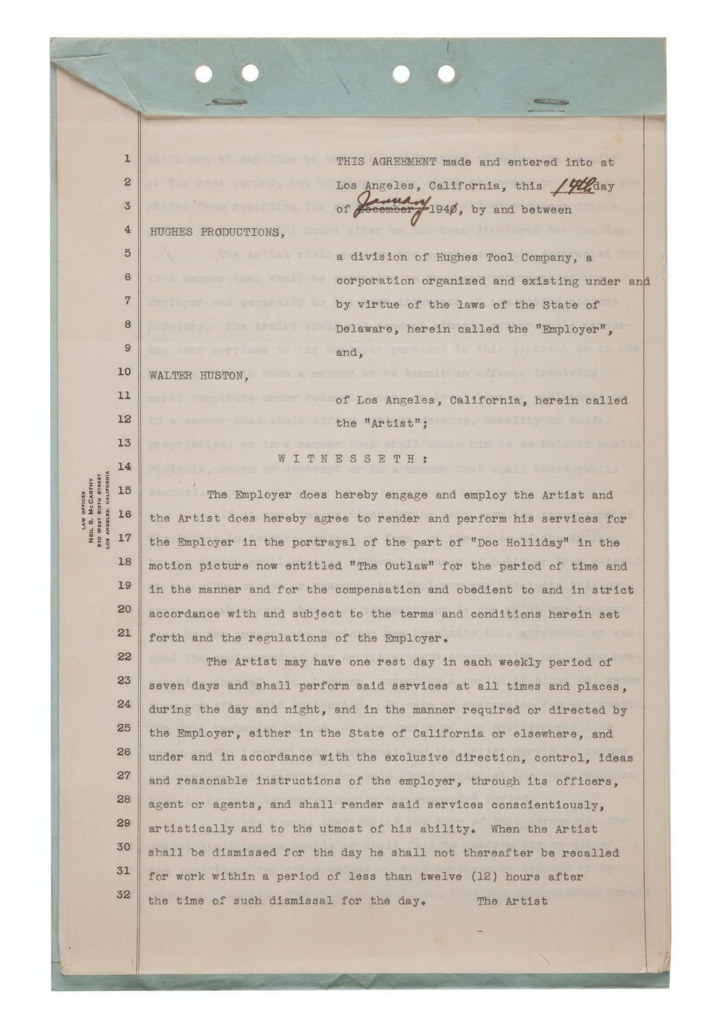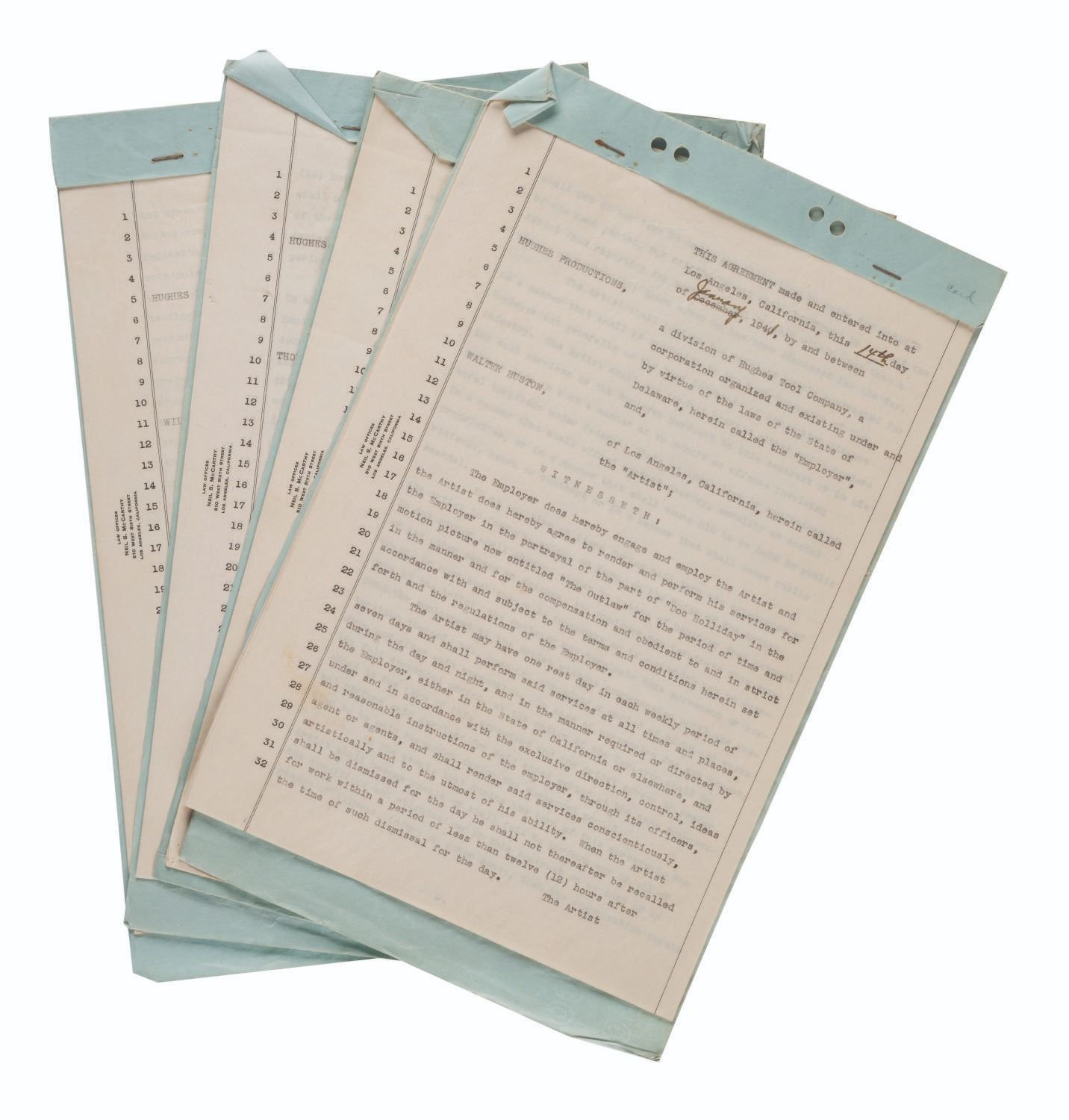 (Hughes Productions, 1940-41) A collection of four employment contract agreements for Hughes Productions, owned by aerospace pioneer Howard Hughes. Two of the contracts are for actor Walter Huston, while the others are for William Victor Richardson and Thomas Mitchell. Richardson's services were ultimately not needed, but the other two actors were cast as Doc Holliday and Sheriff Pat Garrett in the 1943 film "The Outlaw," which launched Jane Russell into superstardom. Measuring 8.75" x 14", these rare pieces of ephemera from Howard Hughes' heyday display in very good condition with typical creases, light stains, folds, oxidation to the staples from age, and wear from use.