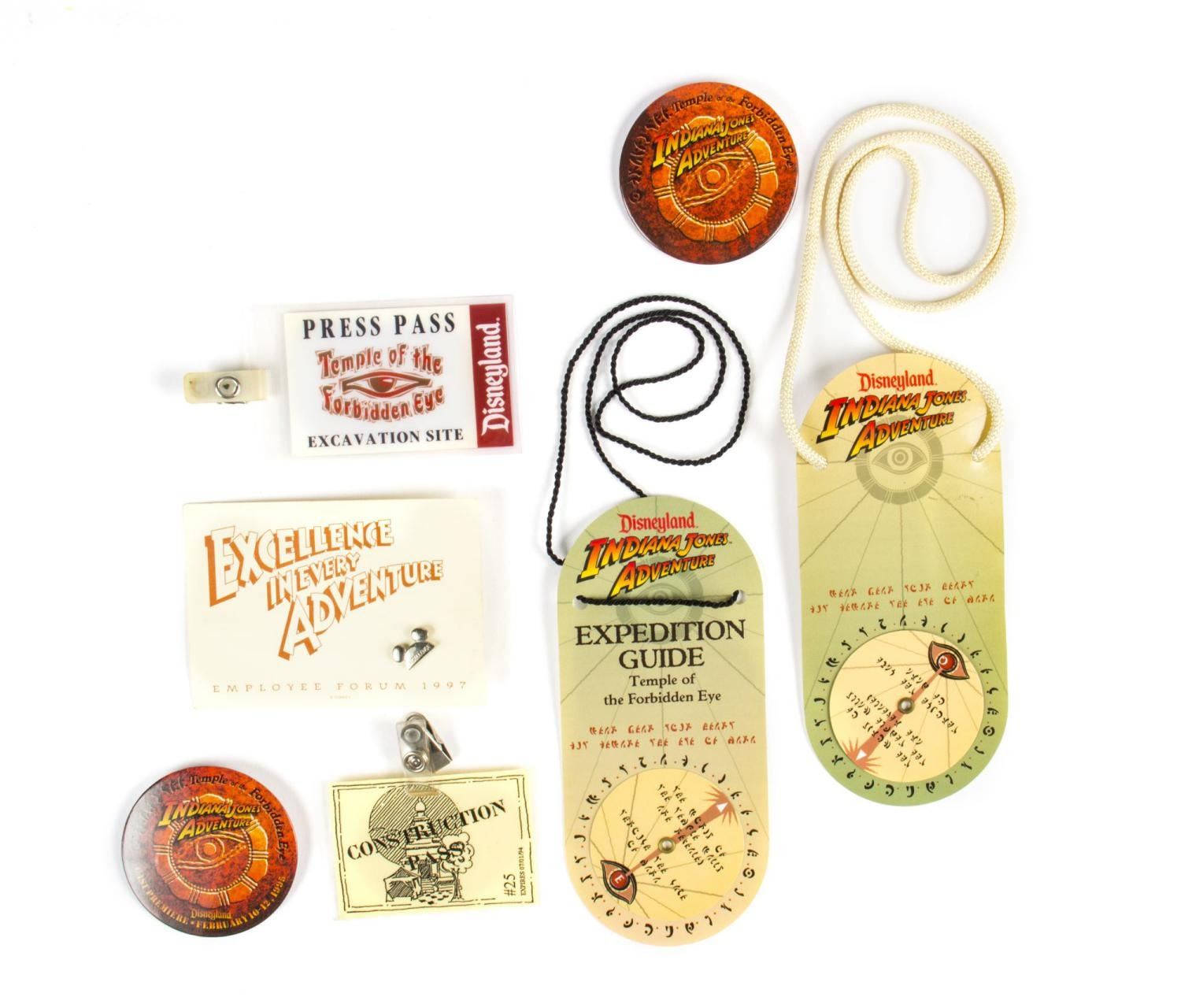 (Disneyland, 1994-95) A collection of 7 Cast Member-exclusive and VIP items from the Indiana Jones Adventure attraction at Disneyland. Included are a pair of attraction decoder passes for a VIP Guest and Cast Member, an employee construction pass, a press pass, an employee appreciation pin, and two pinback buttons. The collection is in very good condition overall, with some very light handling wear.
