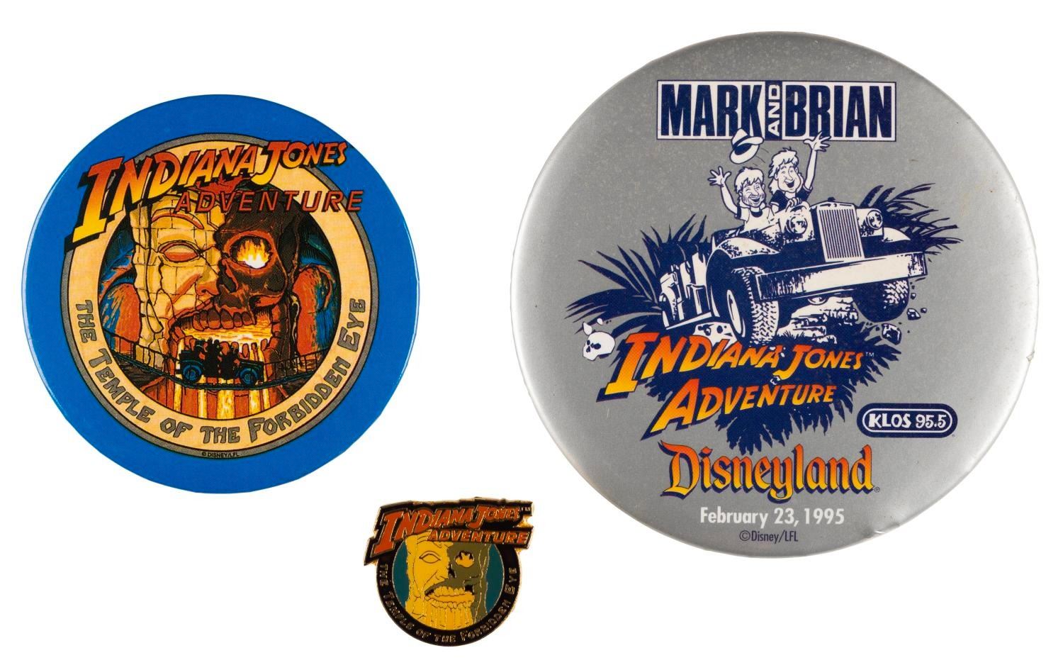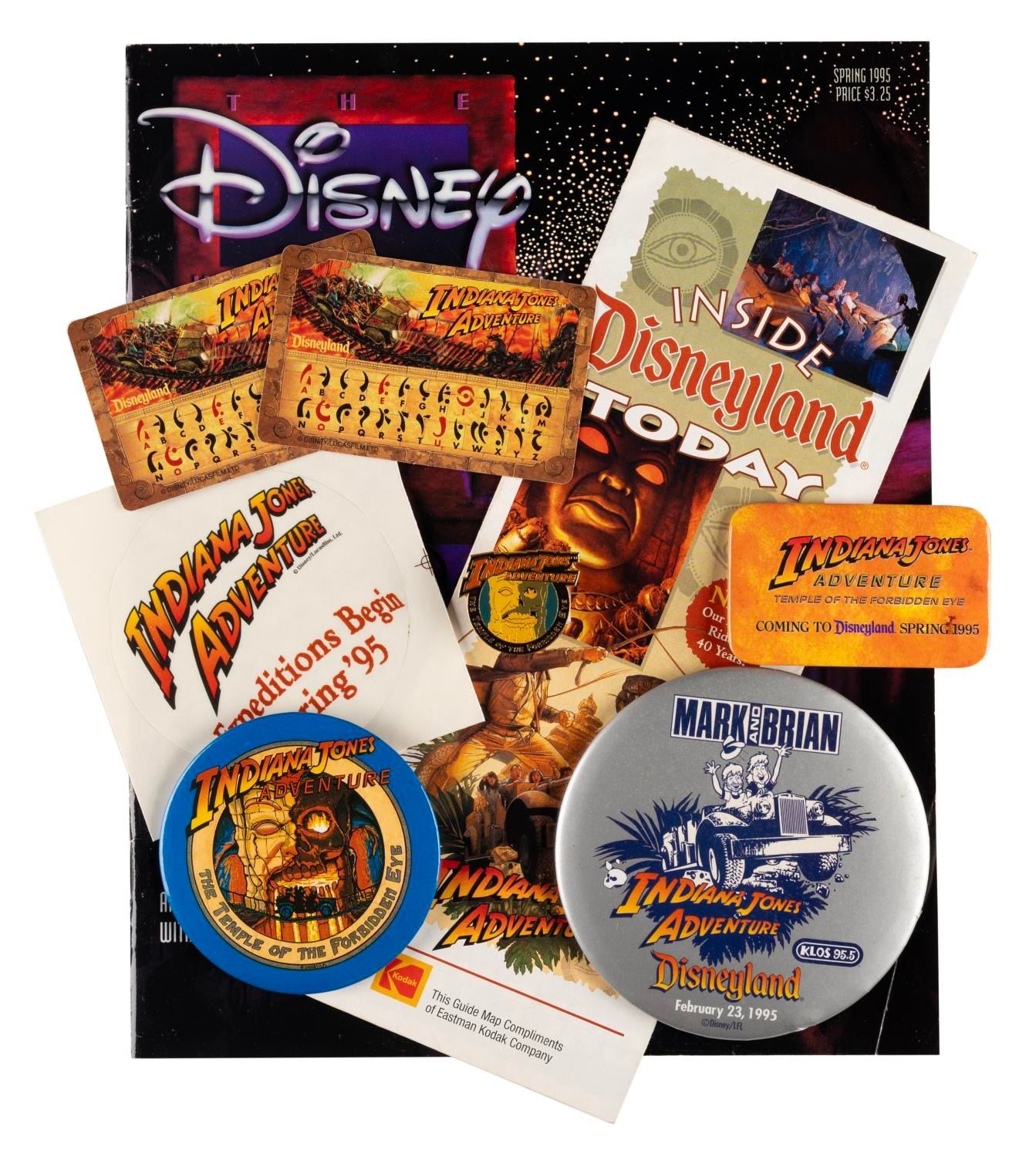 (Disneyland, 1995) A collection of Indiana Jones Adventure Temple of the Forbidden Eye opening year memorabilia, including a copy of "The Disneyland Magazine" from Spring 1995, an "Inside Disneyland Today" gate pamphlet, two queue decoder cards, a decal, and three pinback buttons. Measuring various sizes up to the 8.5"x10.75" magazine, the items are in very good condition with handling and edge wear to the paper ephemera, including a torn edge on the gate pamphlet, minor discoloration, scuffing, and oxidization to the reverse of the "Mark and Brian" button.