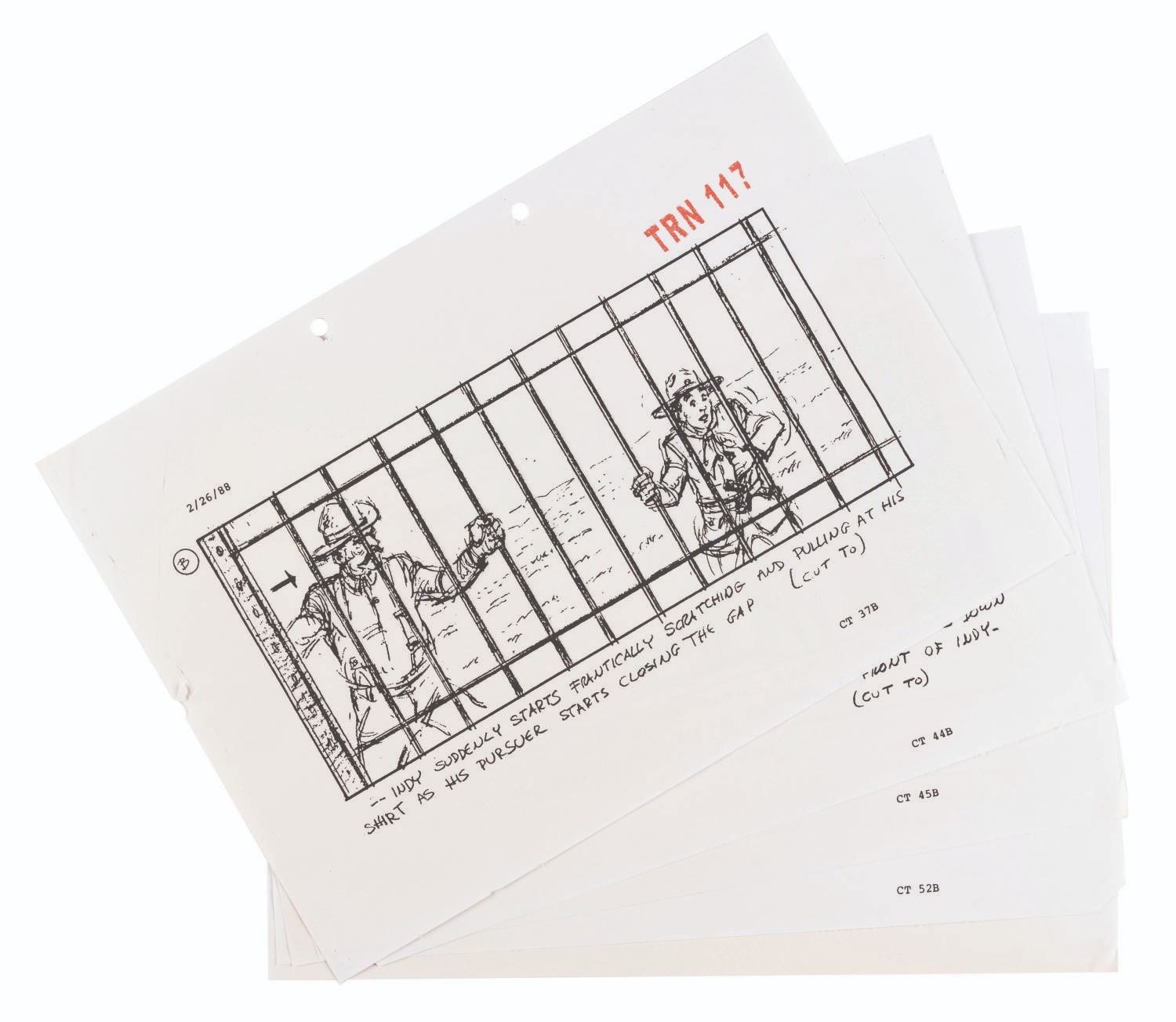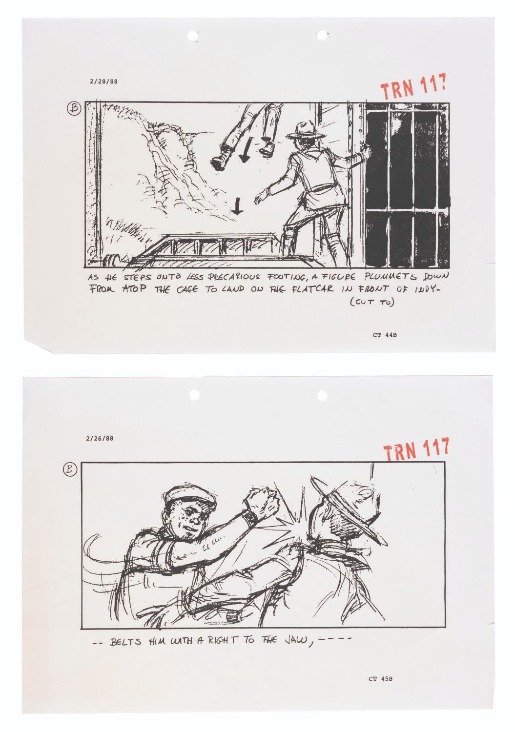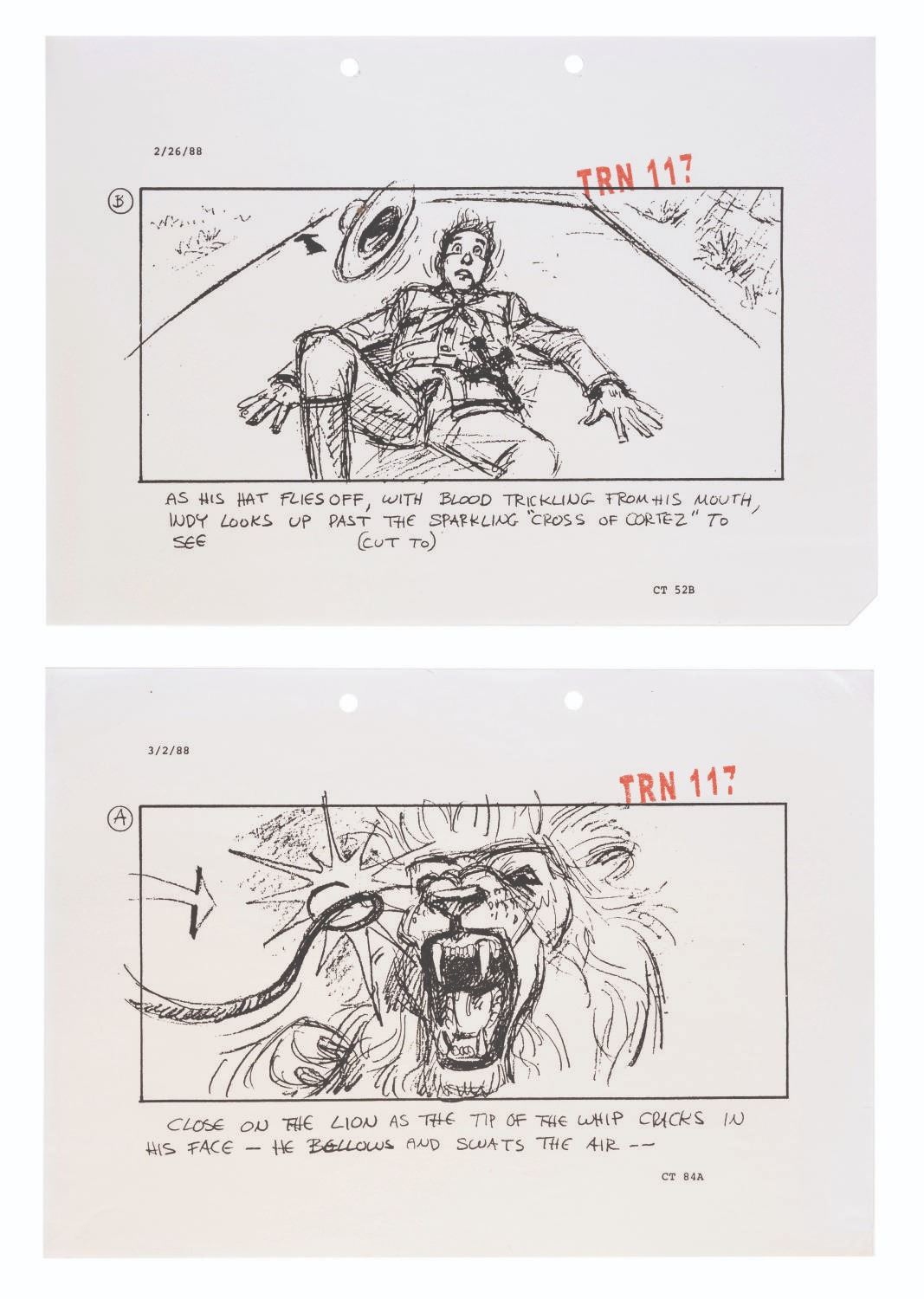 (Paramount, 1989) A collection of five production-used storyboard pages for the action-packed opening of "Indiana Jones and the Last Crusade," which featured River Phoenix as a young Indiana Jones, pursued by treasure hunters on a circus train. Measuring 8.5" x 11.75" each, the photocopy pages display in very good condition with wear from production use, light paper loss along the edges, and a 3" tear in one, which does not affect the image.