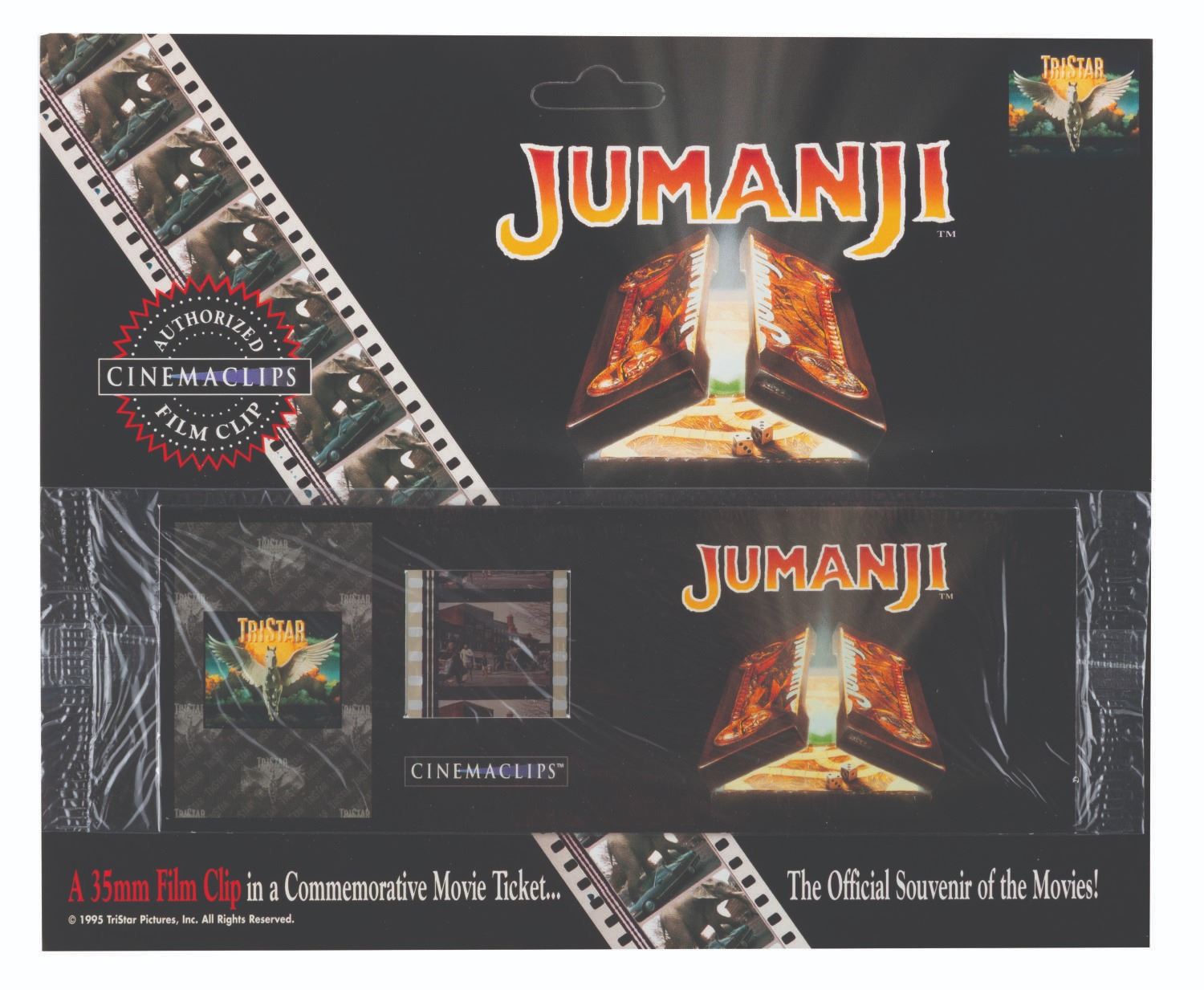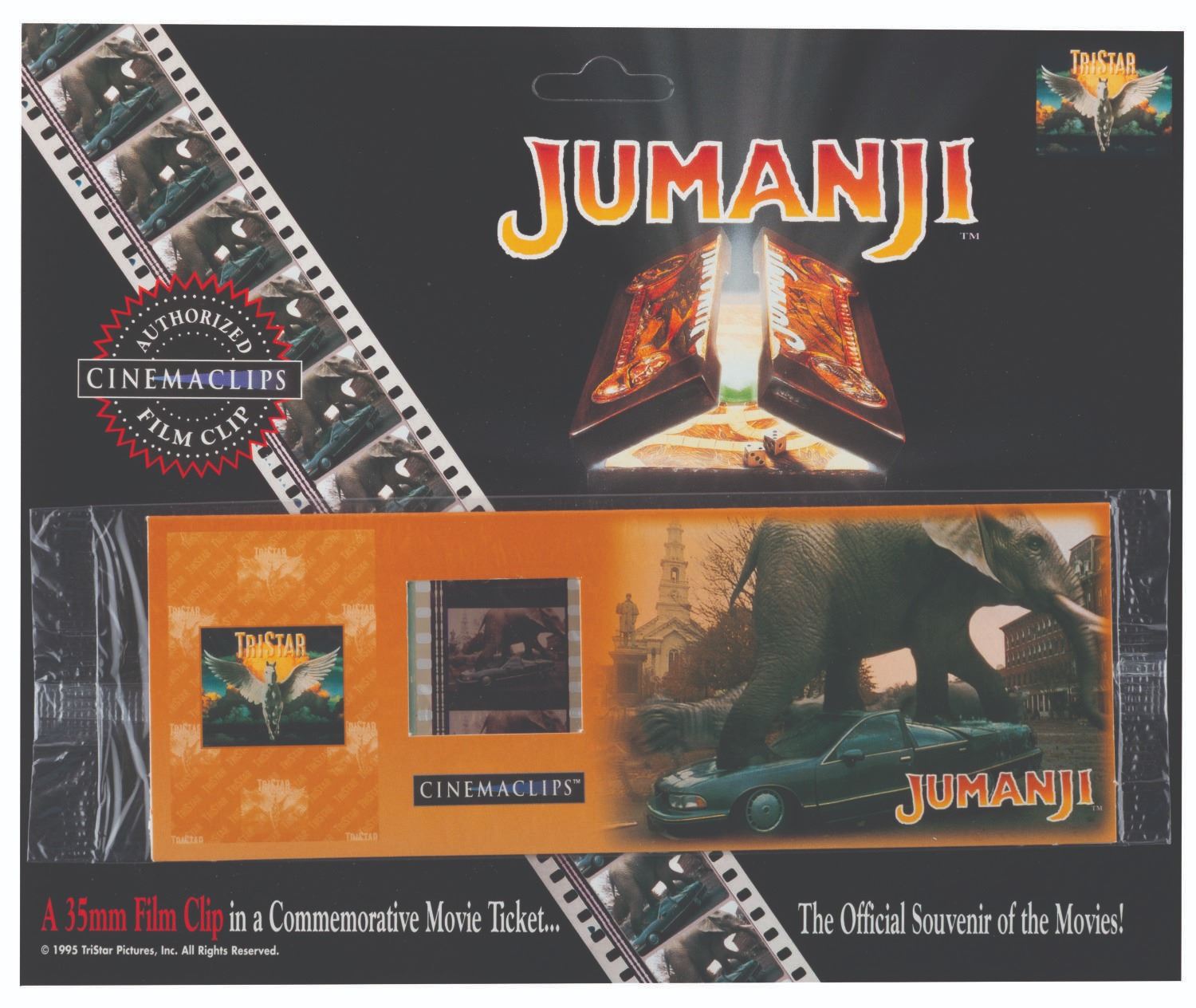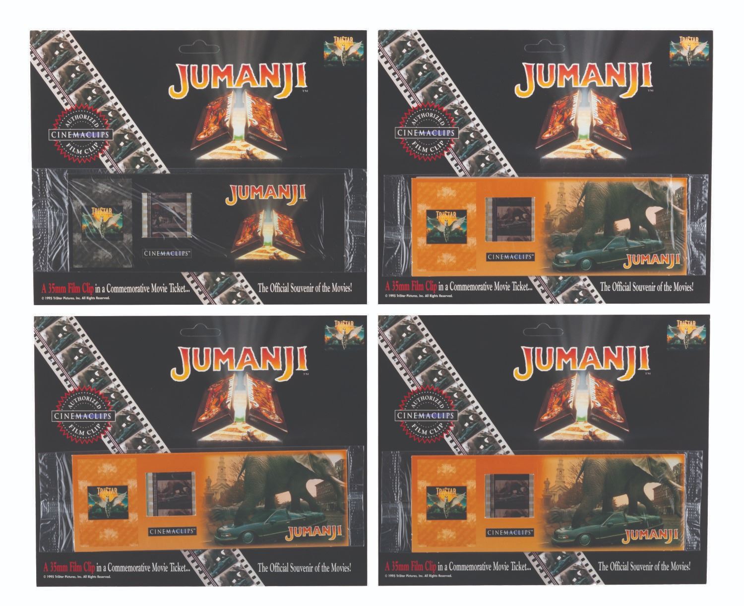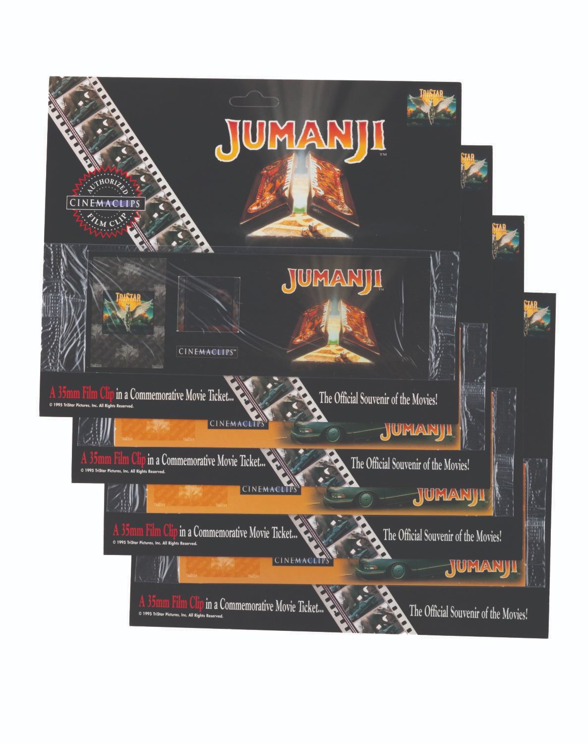 (Cinemaclips, 1990s) A collection of four 35mm film clips from "Jumanji.” Mounted into a commemorative movie ticket frame, the film clips feature the elephant rampaging scene. Measuring 7” x 8.5” overall, the clips are in fine condition.