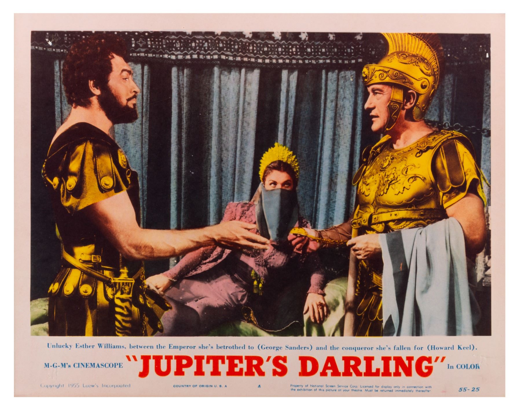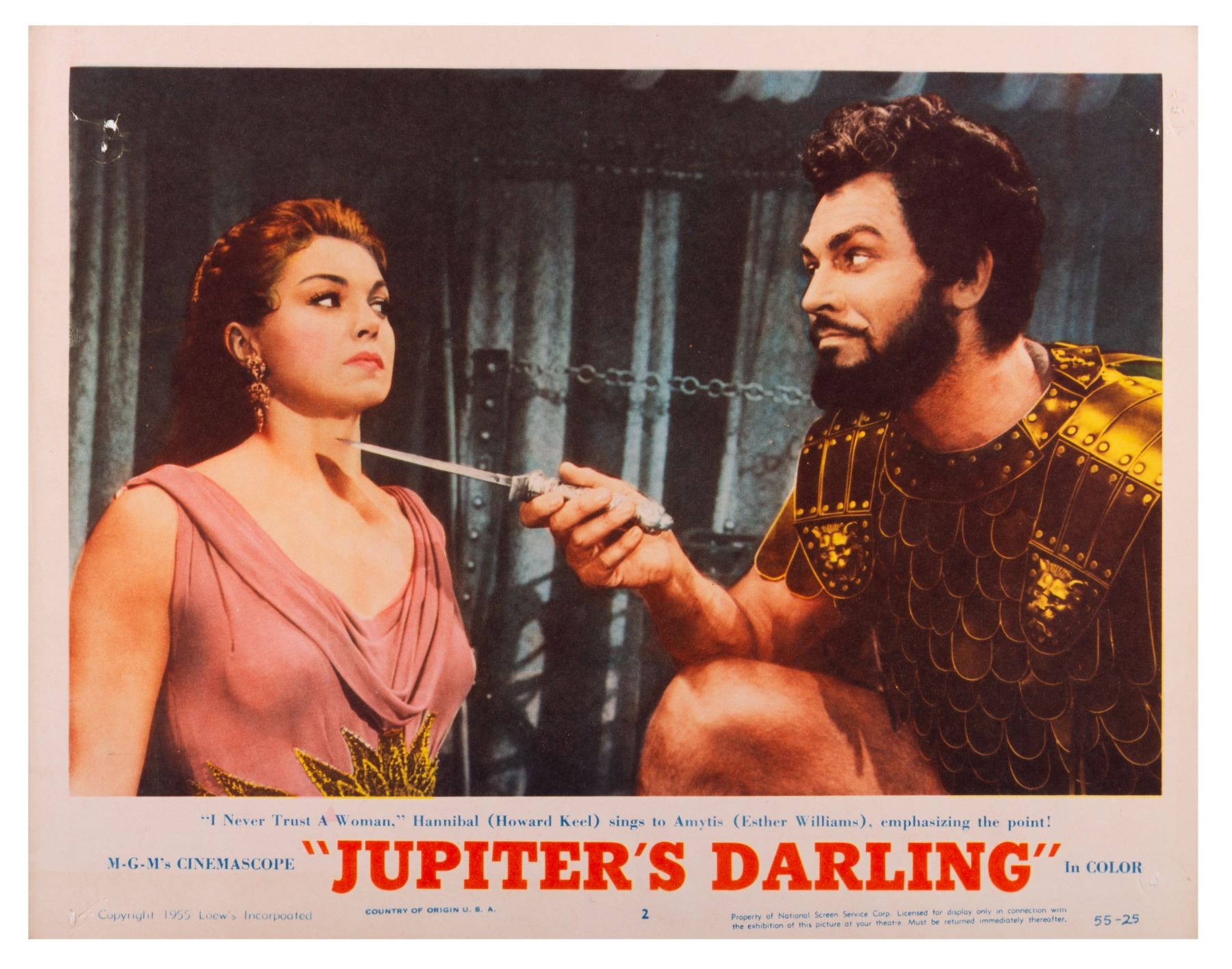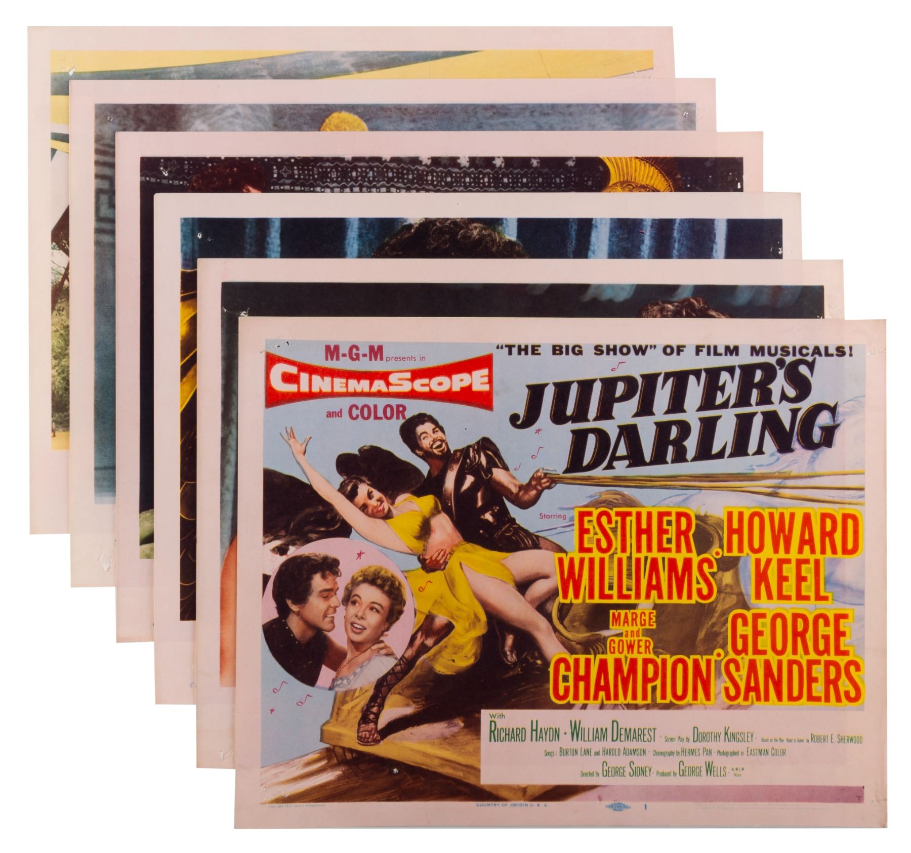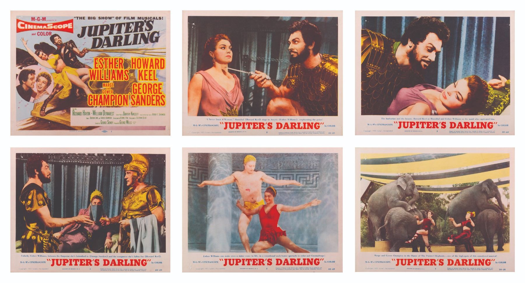(MGM, 1955) Six lobby cards for the 1955 Cinemascope musical "Jupiter's Darling" starring Esther Williams and Howard Keel. Each measuring 11" x 14", the cards display in very good condition with pinholes near the corners and slight discoloration from age.