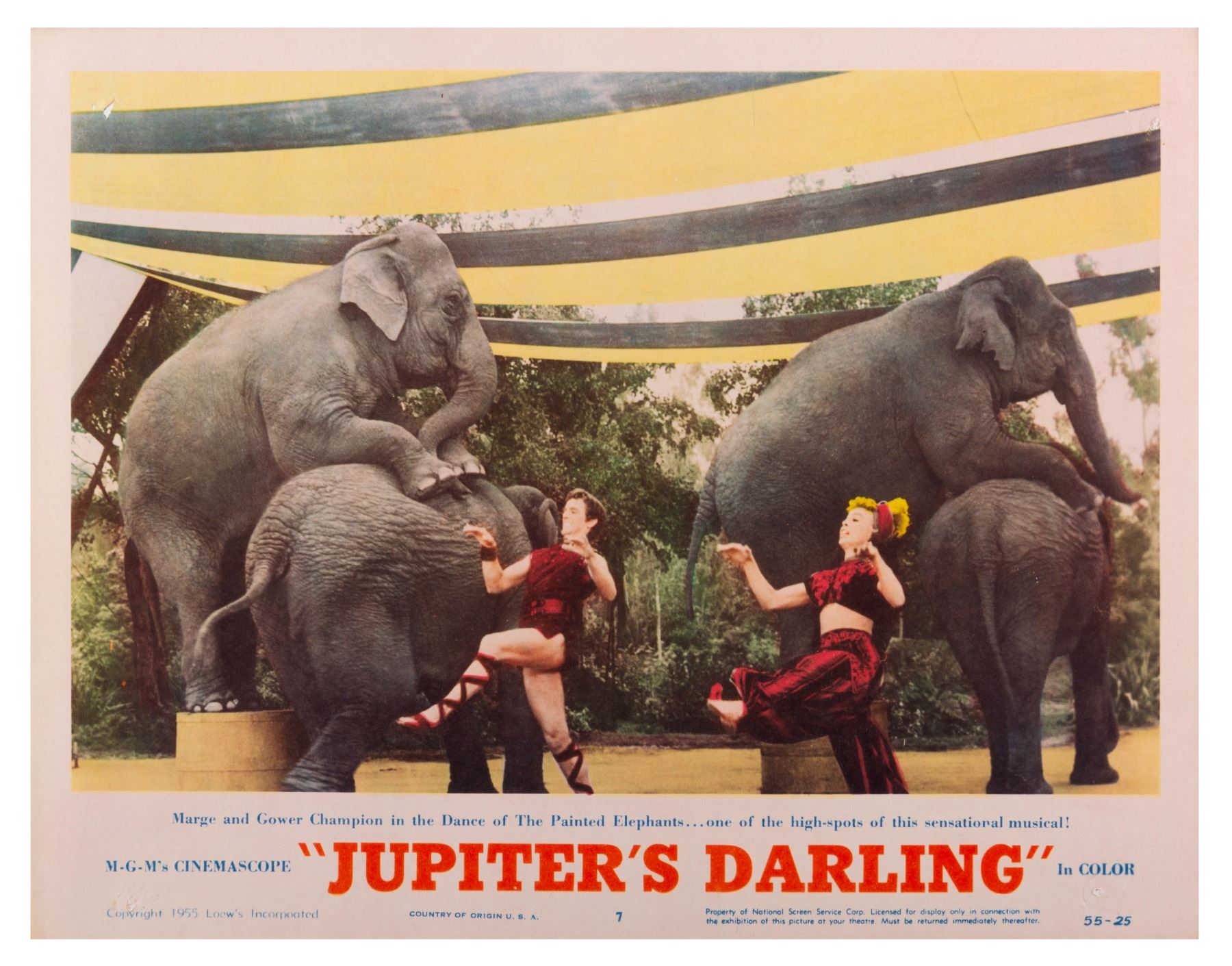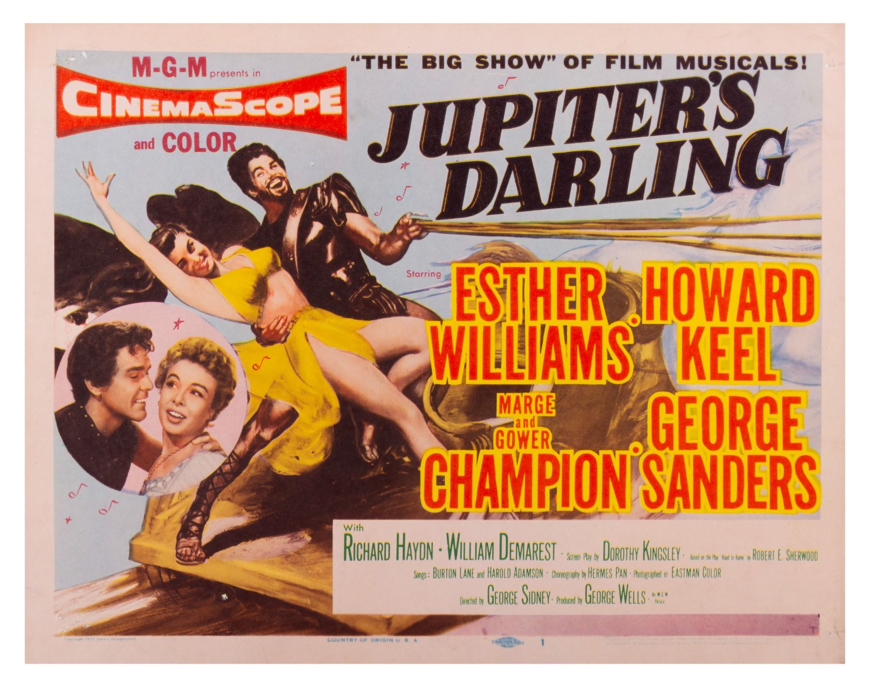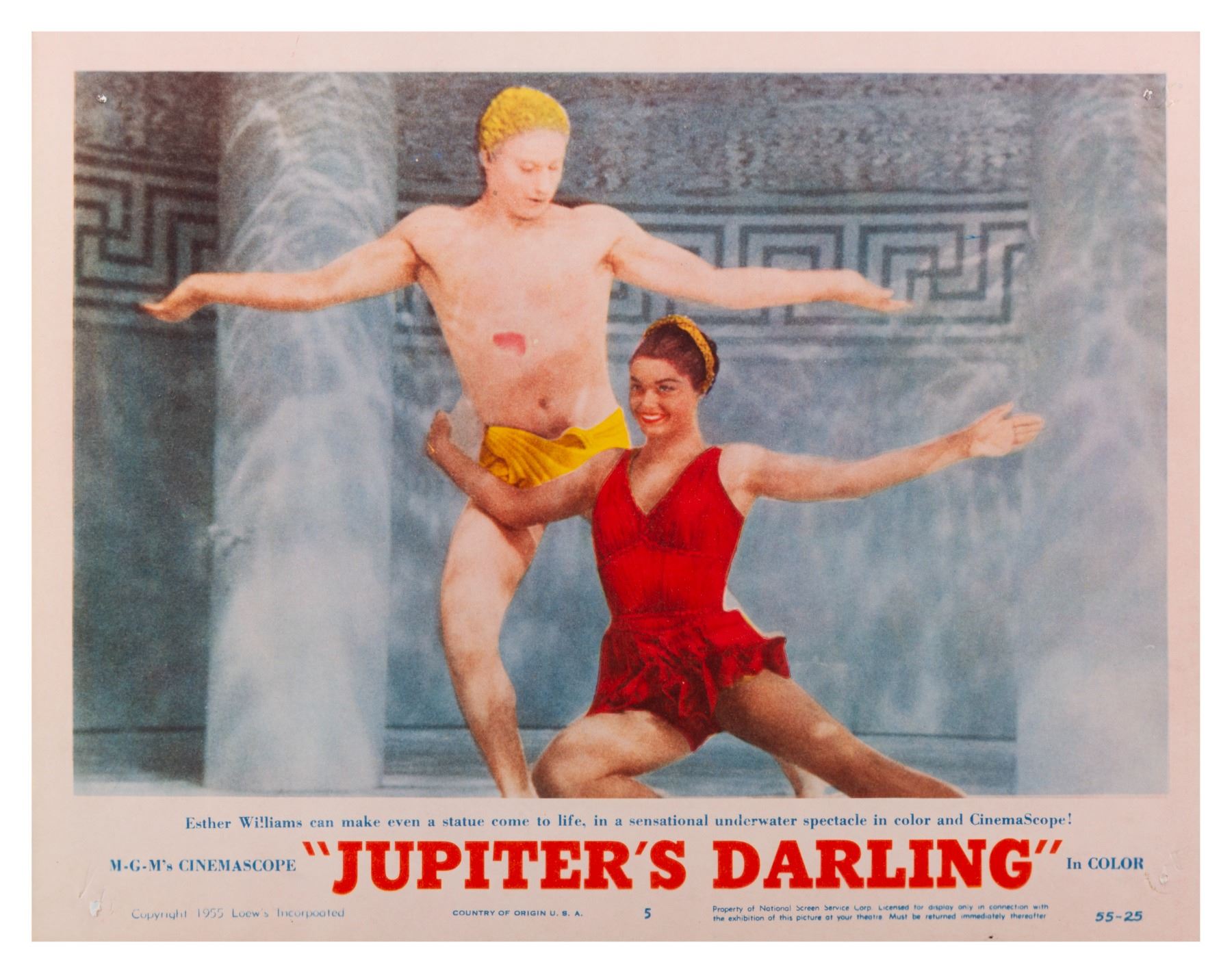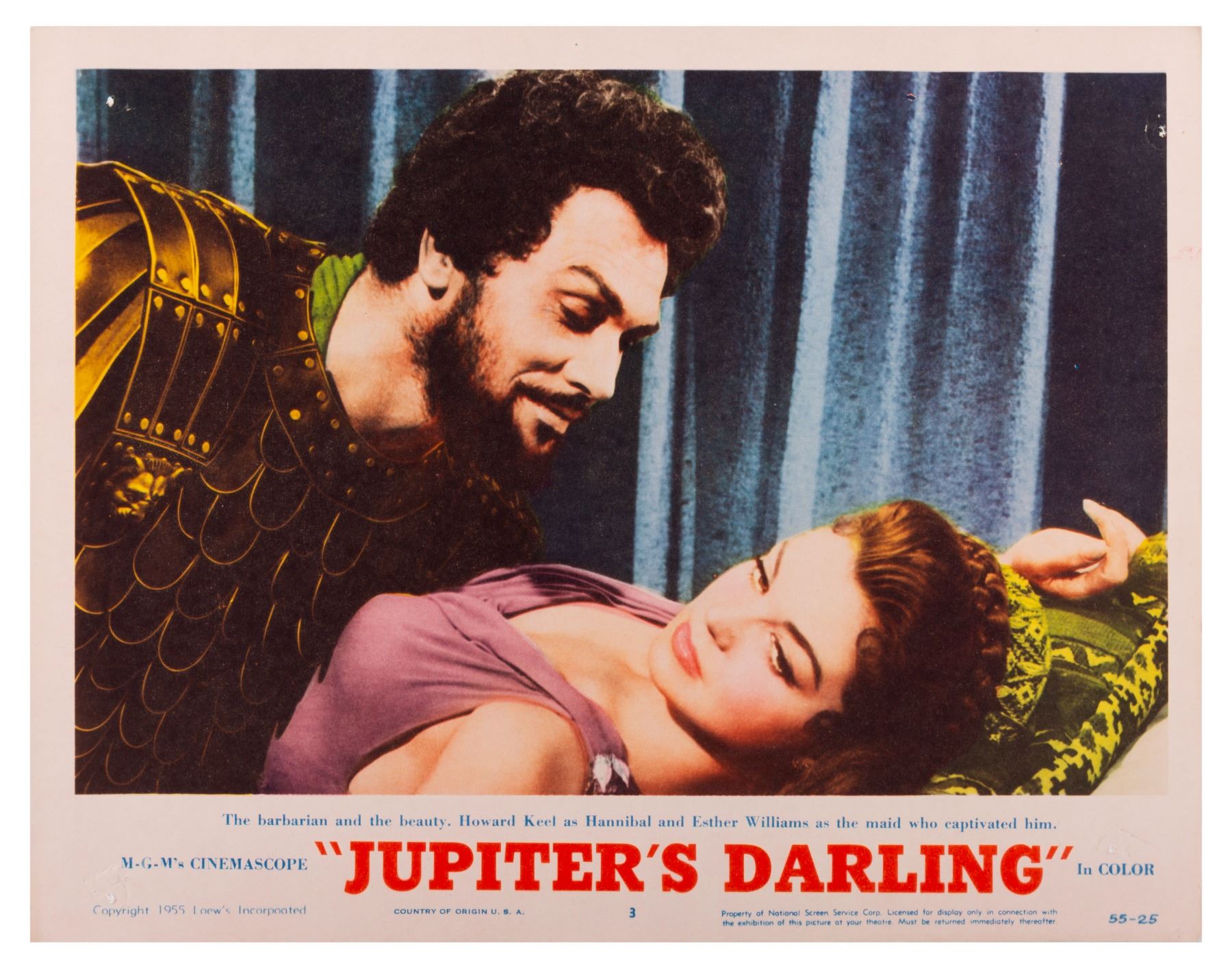 (MGM, 1955) Six lobby cards for the 1955 Cinemascope musical "Jupiter's Darling" starring Esther Williams and Howard Keel. Each measuring 11" x 14", the cards display in very good condition with pinholes near the corners and slight discoloration from age.