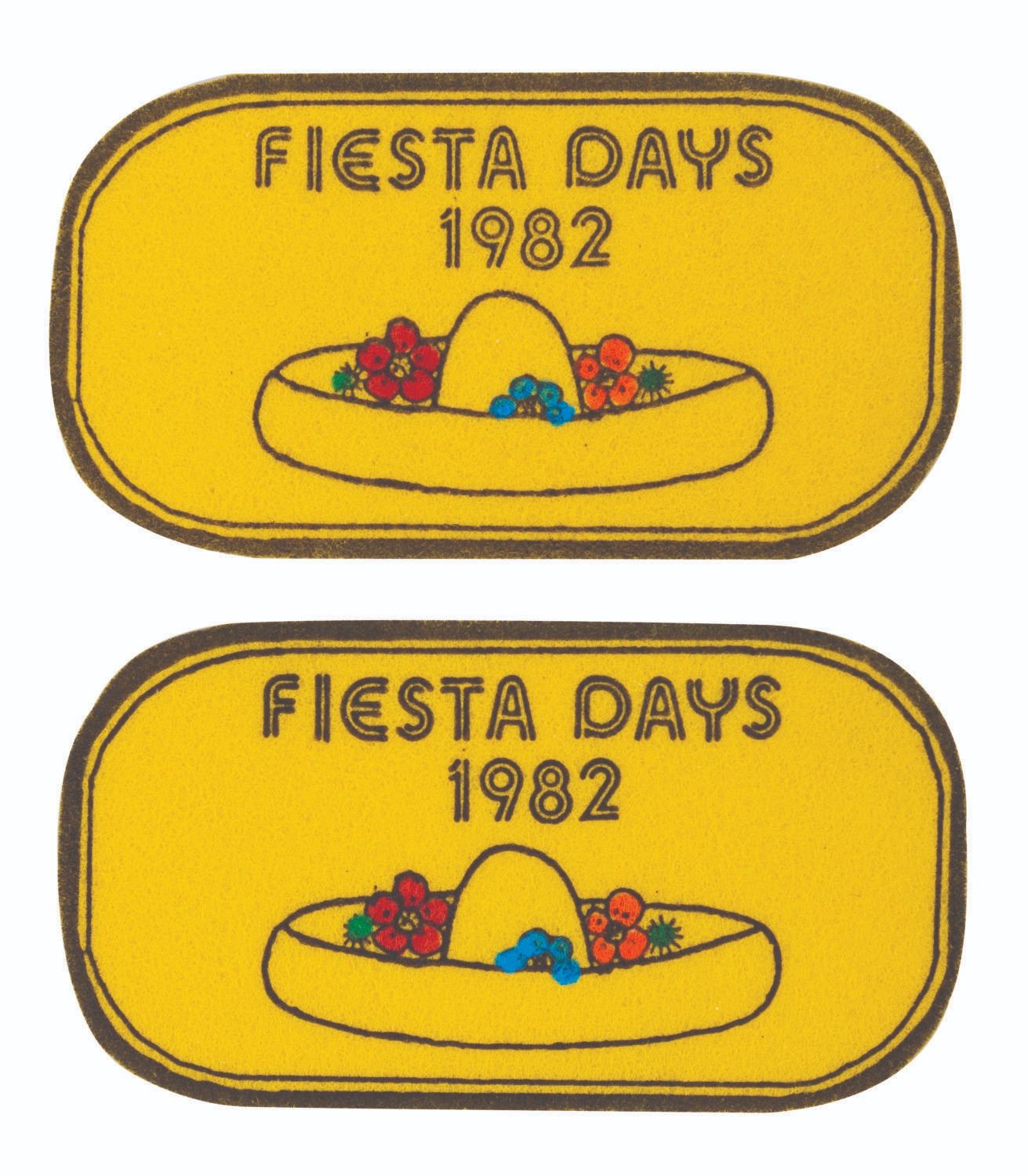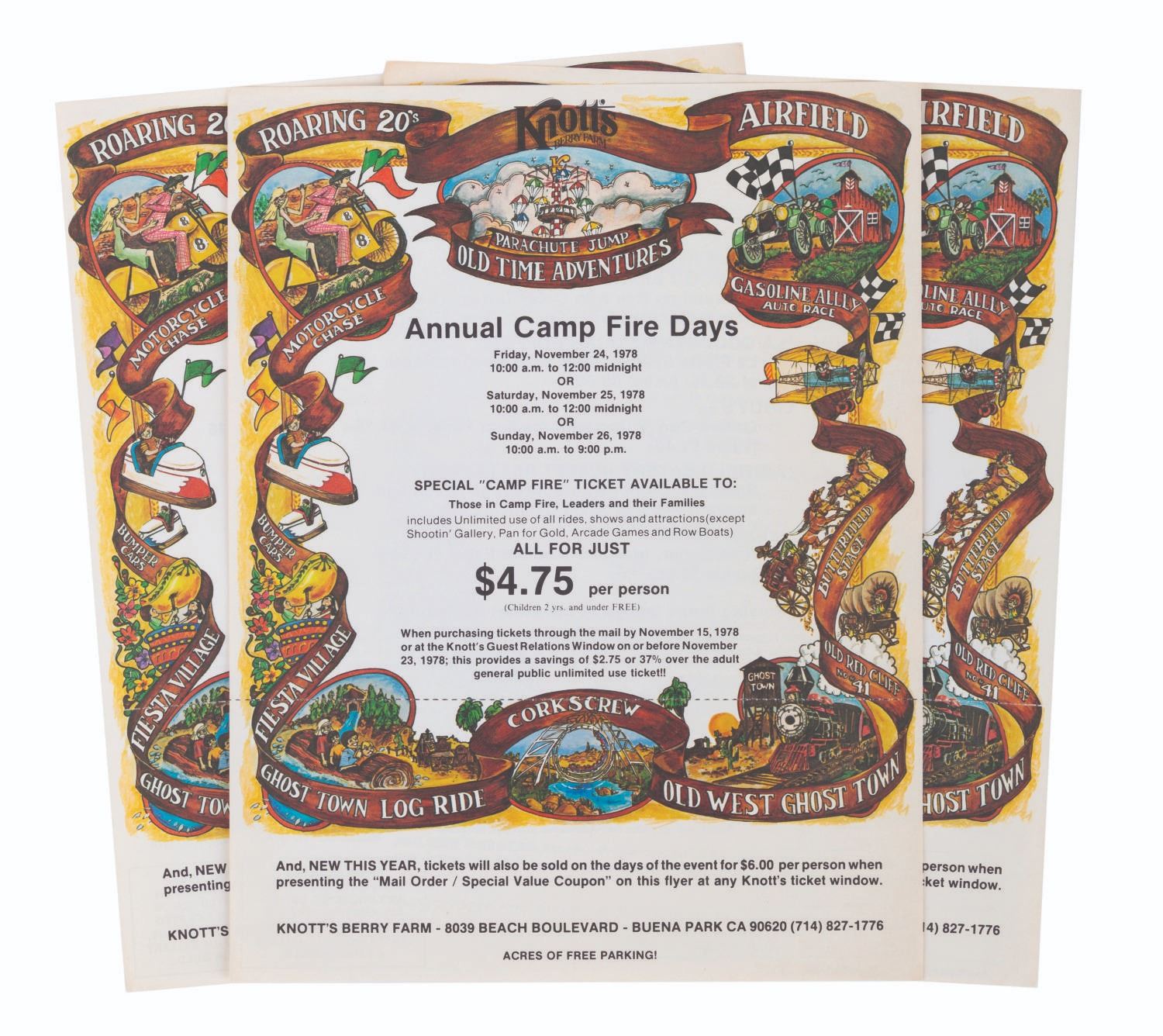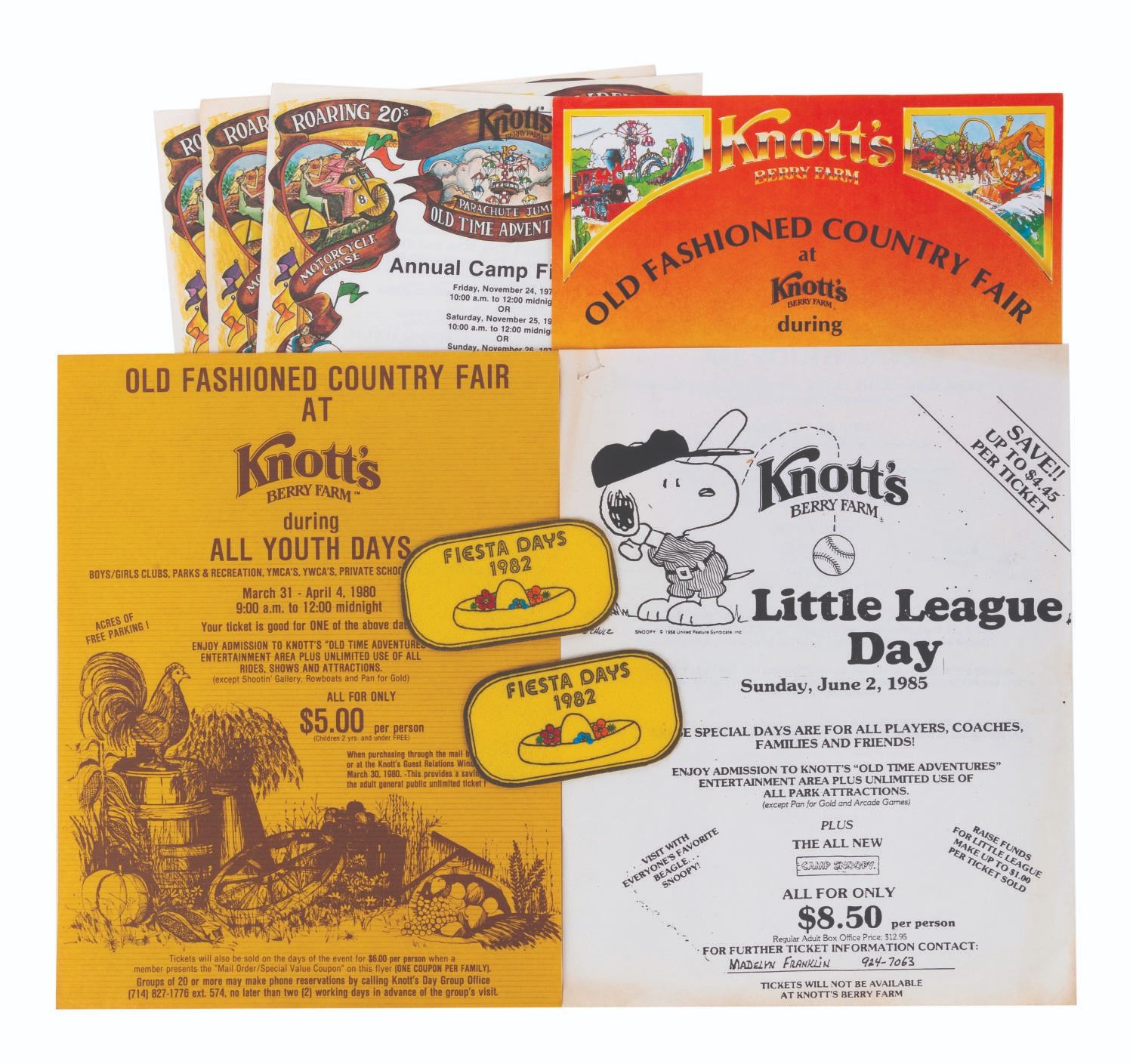 (Knott's Berry Farm, 1978-1985) A collection of six event flyers from Knott's Berry Farms, with two patches for the 1982 Fiesta Days. The events range from the 1978 Camp Fire Days to the 1985 Little League Day. The patches measuring 2"x3.5" are in fine condition. The 8.5"x11" flyers are in fine condition, with the Snoopy/Little League flyer in good condition showing wear from age and handling.