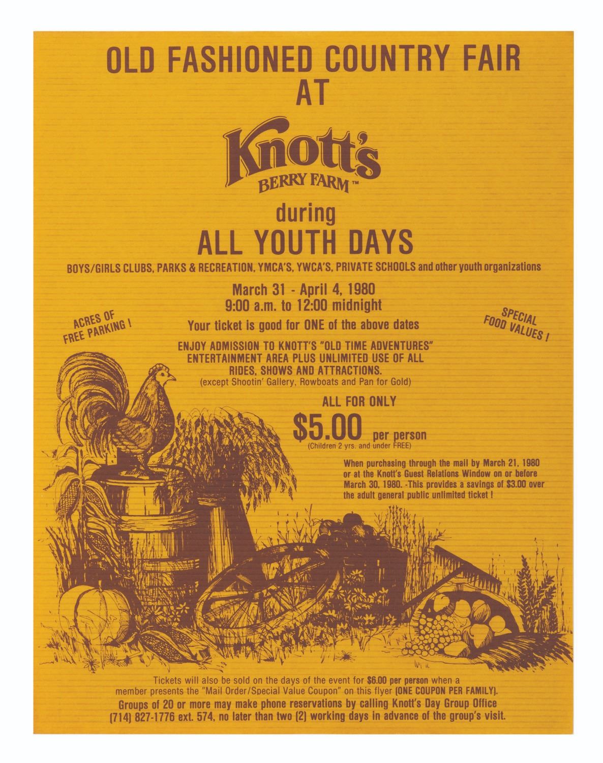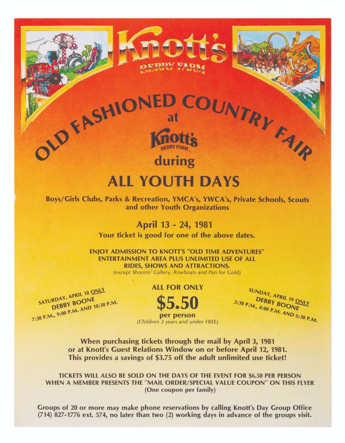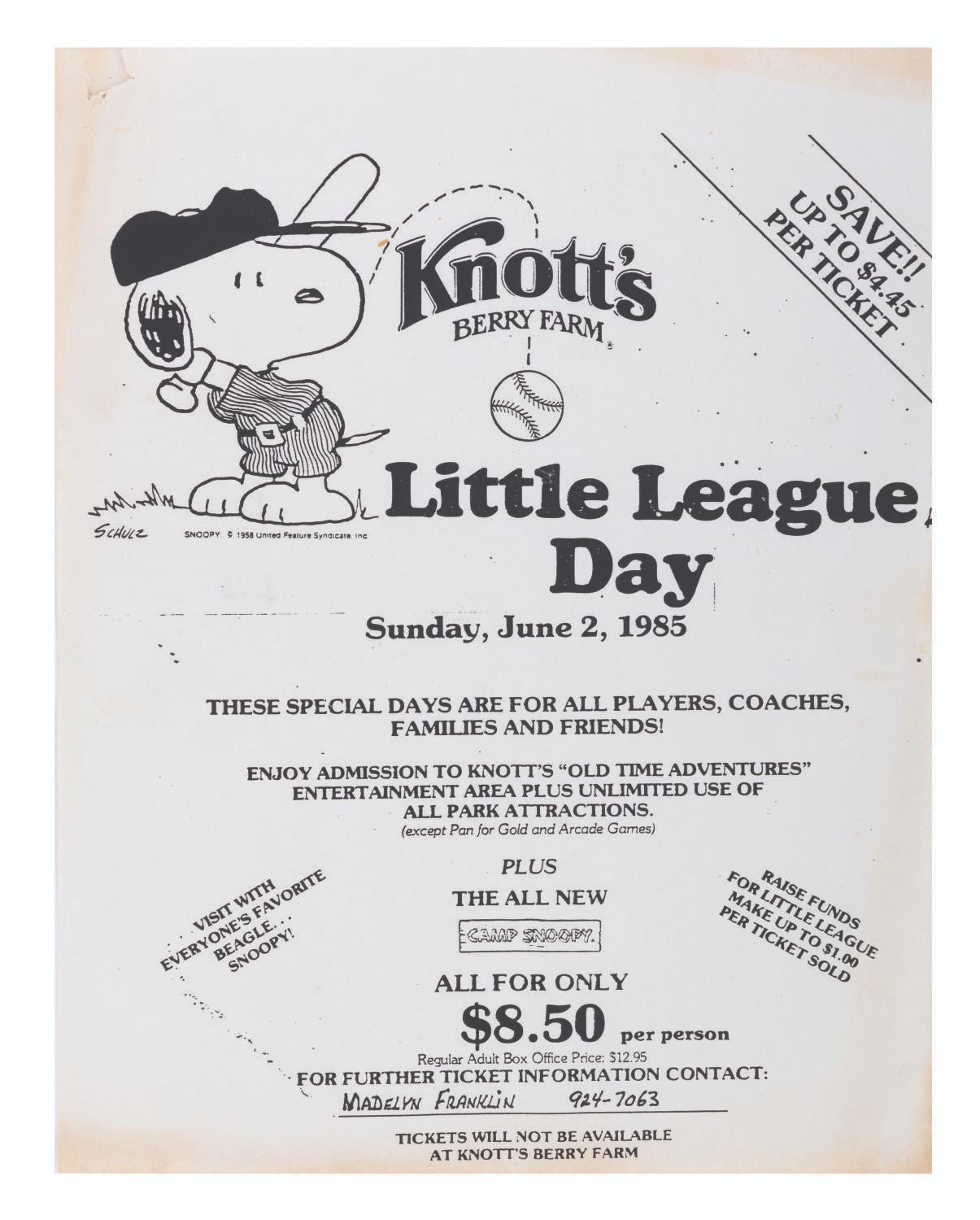 (Knott's Berry Farm, 1978-1985) A collection of six event flyers from Knott's Berry Farms, with two patches for the 1982 Fiesta Days. The events range from the 1978 Camp Fire Days to the 1985 Little League Day. The patches measuring 2"x3.5" are in fine condition. The 8.5"x11" flyers are in fine condition, with the Snoopy/Little League flyer in good condition showing wear from age and handling.