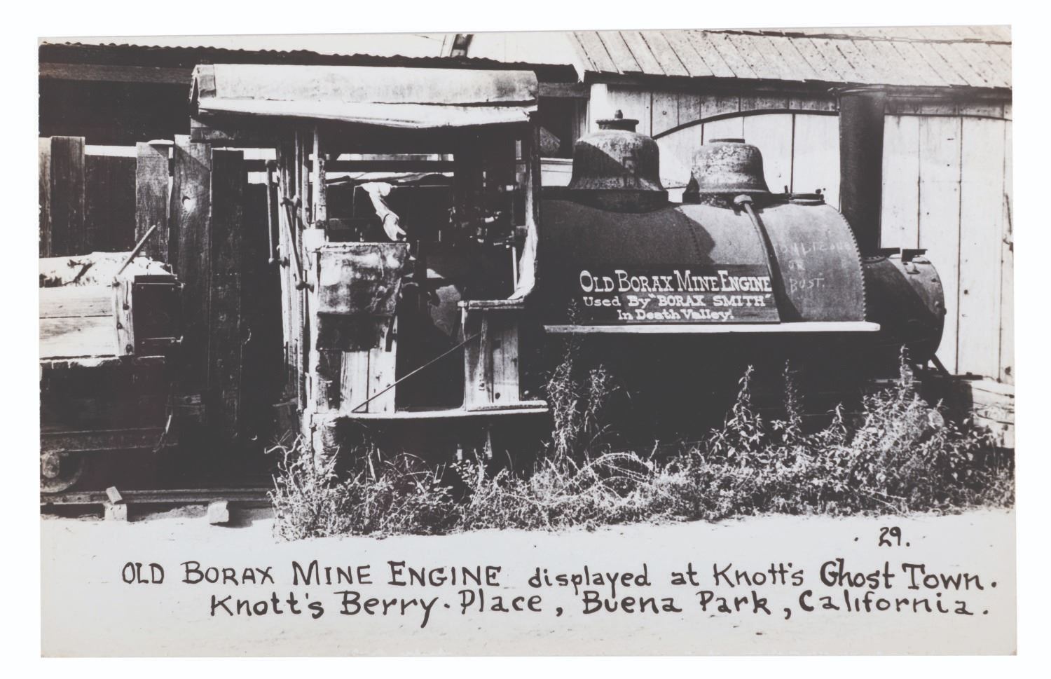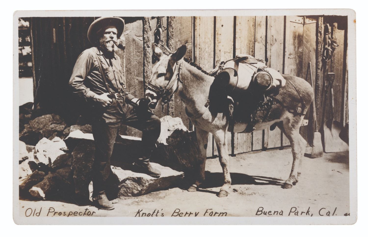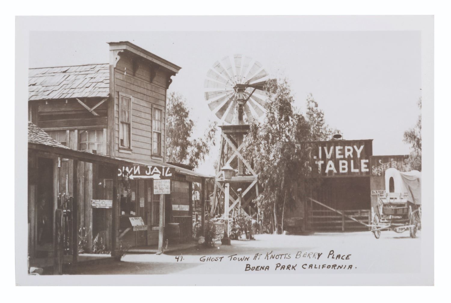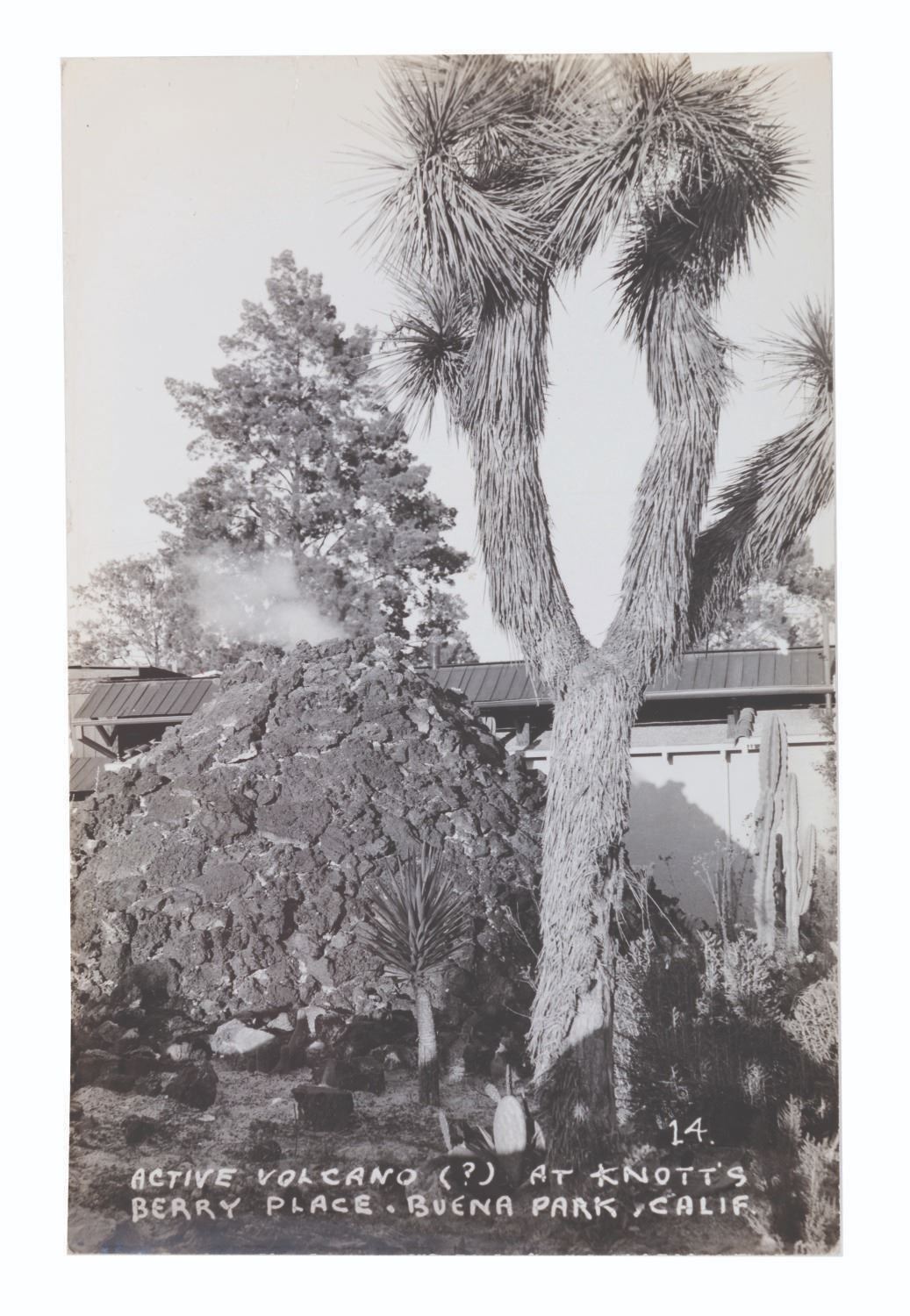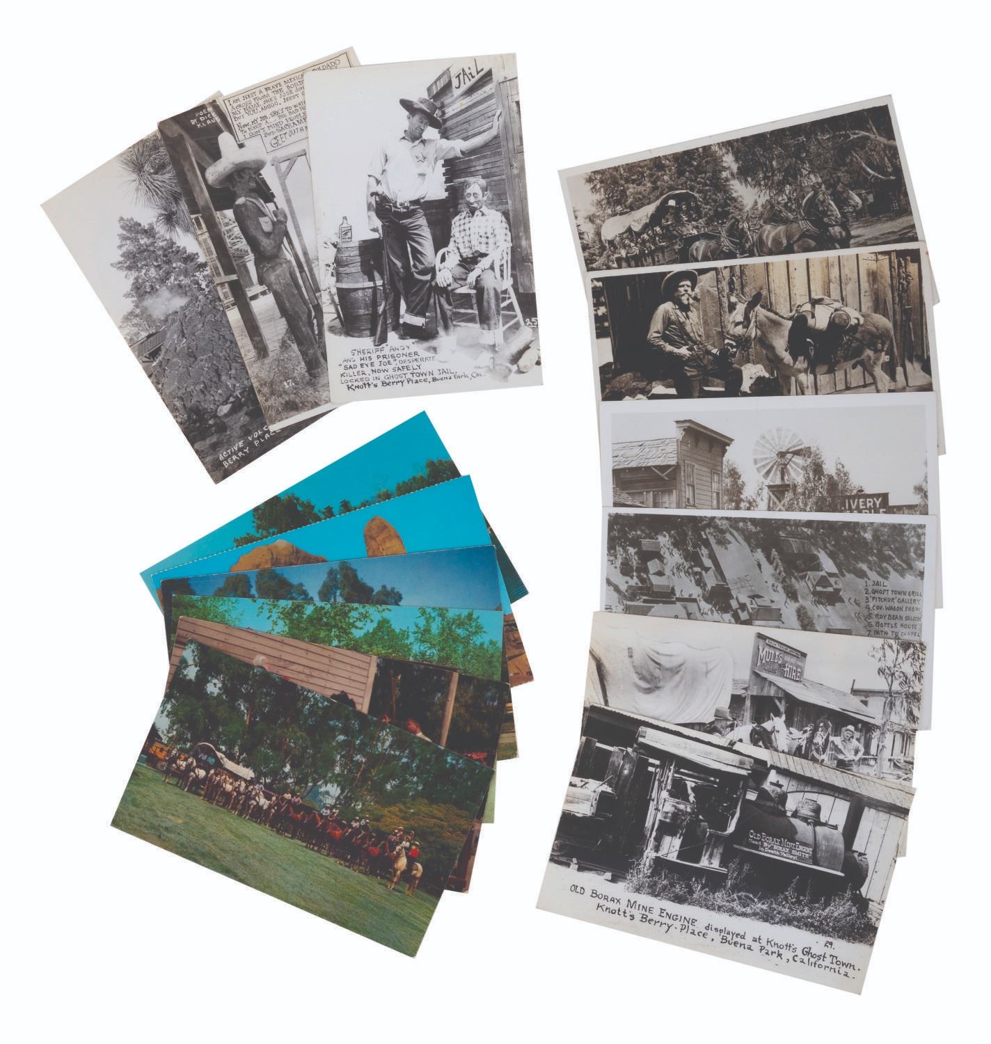 (Knott's Berry Farm, 1940s-1970s) A collection of 15 post cards dating to the early days of Knott's Berry Farm. Included are (9) early black and white cards, and (6) color. Subjects include a map and features of the Ghost Town, an active volcano attraction, stagecoaches, and more. The cards all measure 3.5"x5.5" and are in good to very good condition, with (1) black and white card of the covered wagon ride in fair condition with a corner torn.
