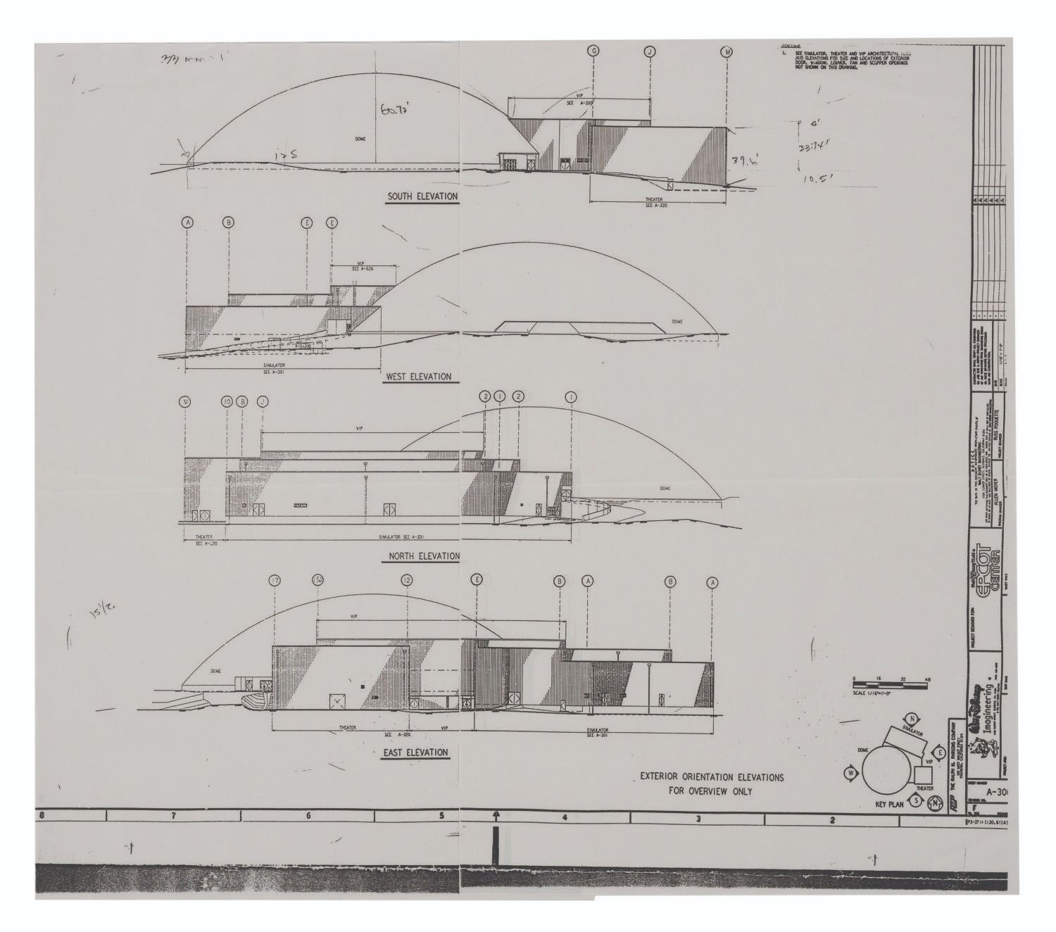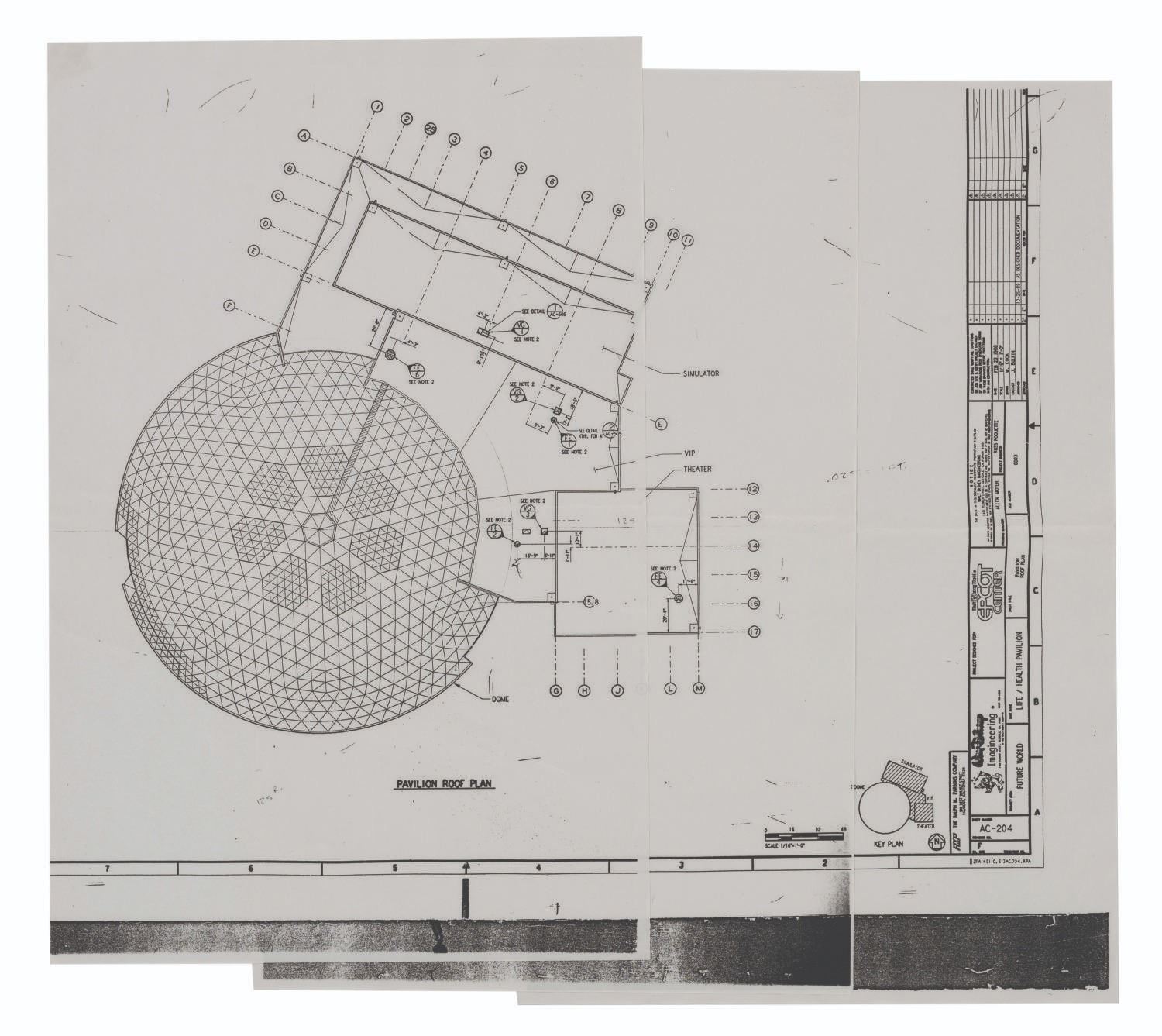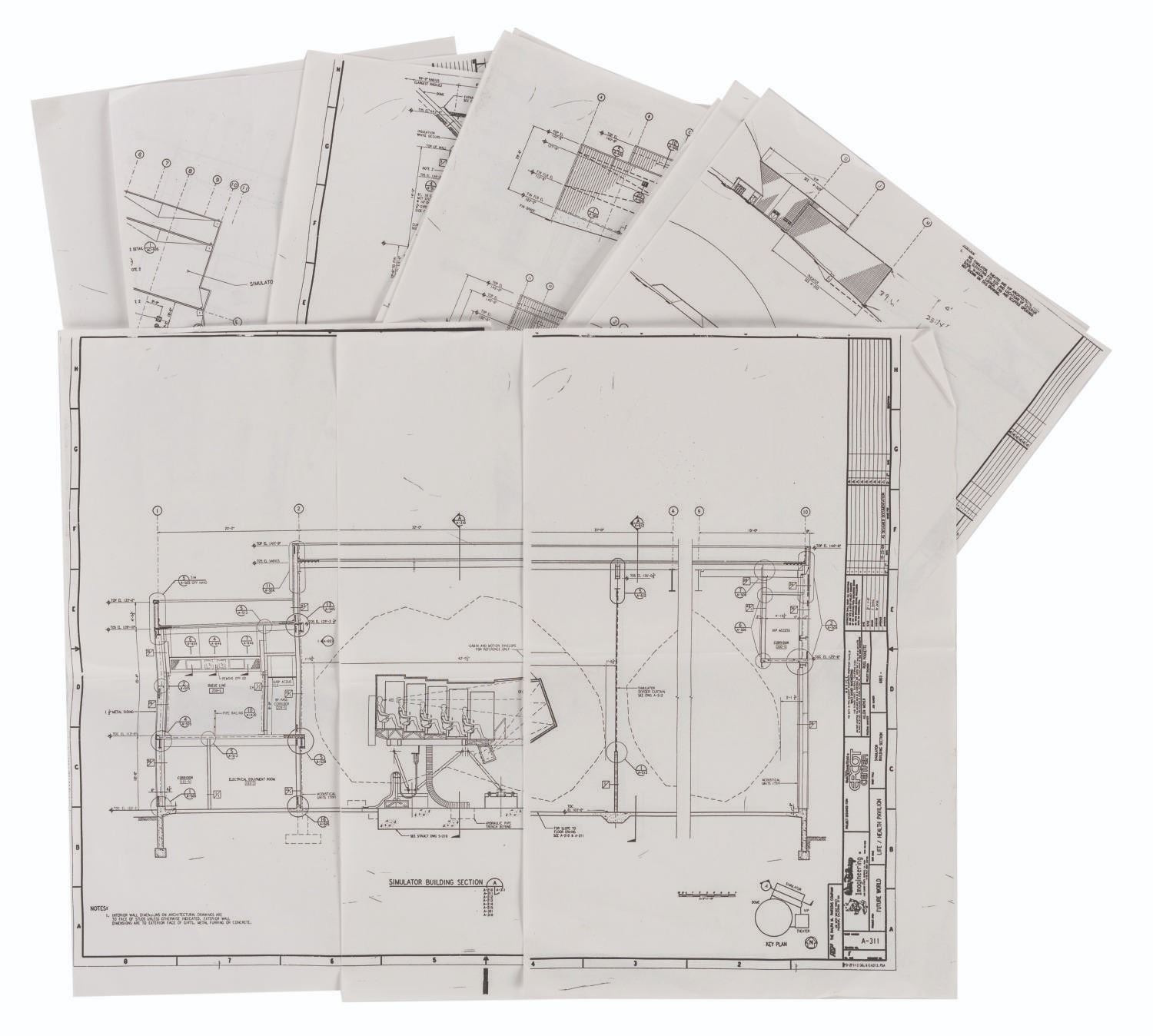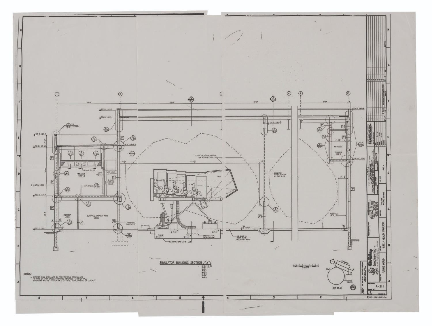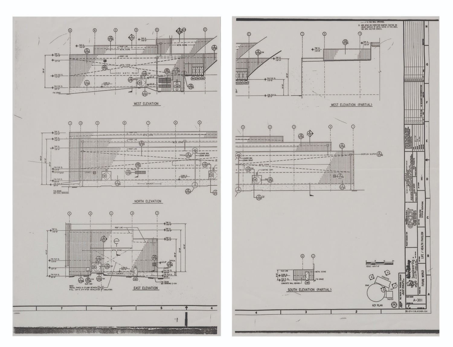 (EPCOT Center, 1988-89) A collection of thirteen sheets of plans for the "Life/Health Pavilion" Project at EPCOT Center. Included are xeroxed sheets comprising plans for building elevations, dome sections, the simulator building section, and the pavilion roof of the Body Wars attraction in Future World. Measuring 11"x17" each, the plans are in very good condition, with creases and wear throughout.