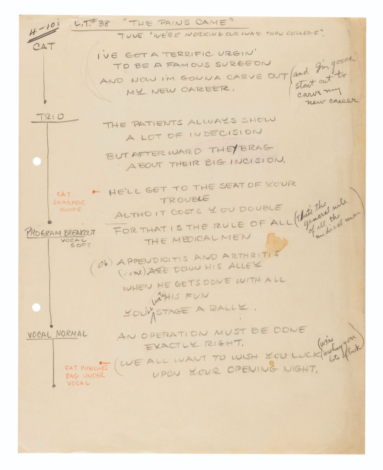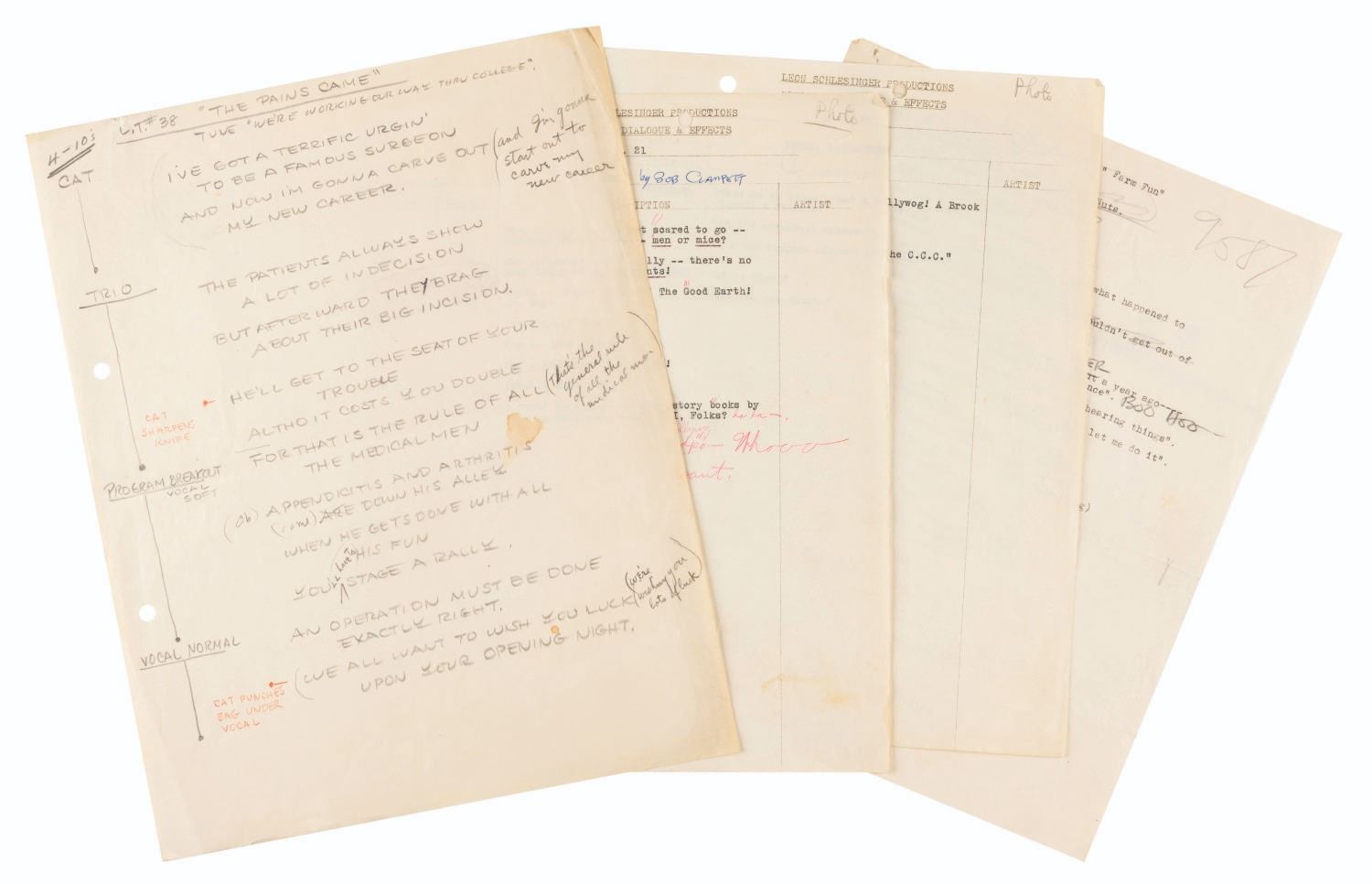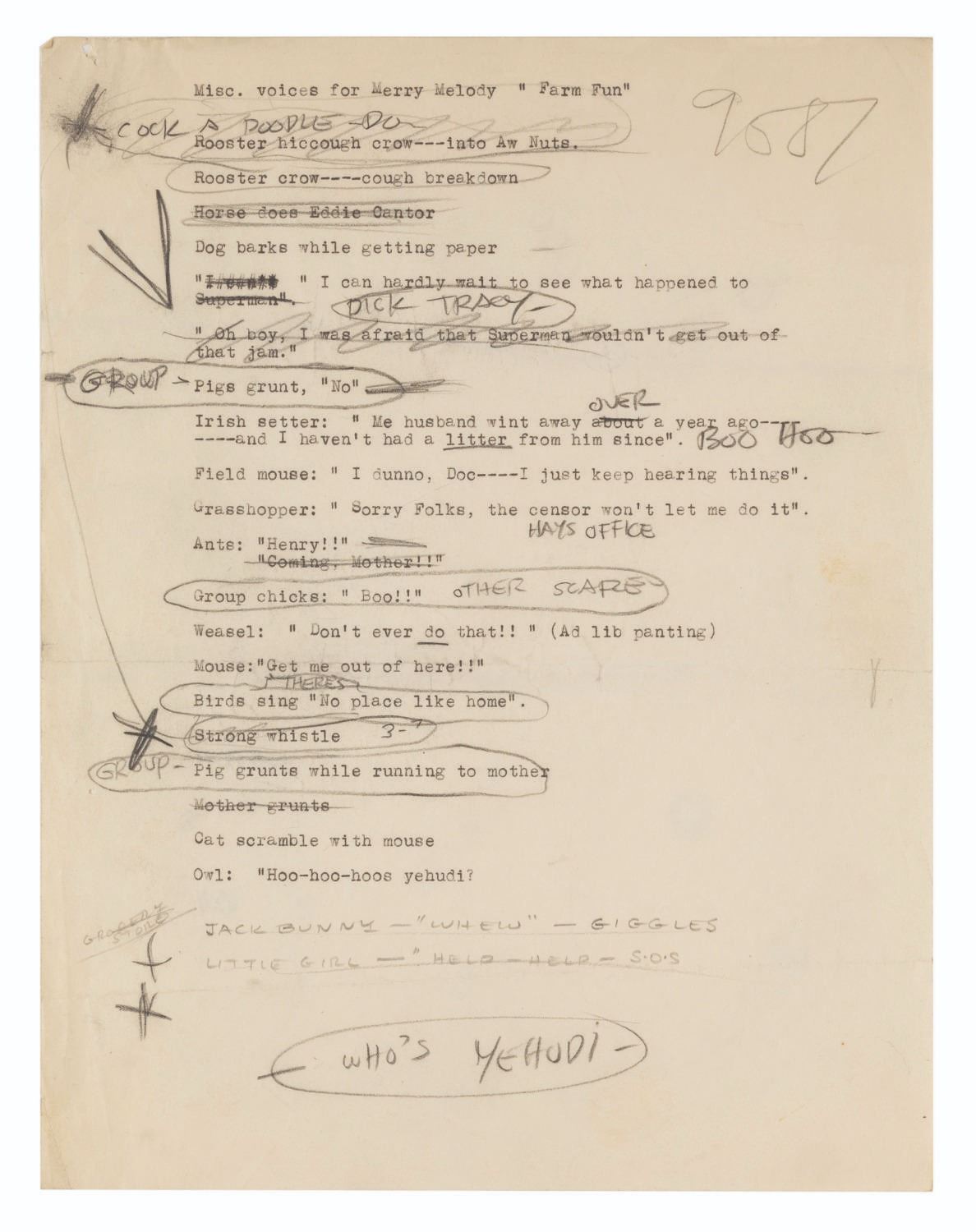(Schlesinger, 1939-41) A collection of four dialogue and recording pages for Looney Tunes and Merrie Melodies cartoons. Included are two typed pages for “Kristopher Kolumbus Jr.”, one for the Merrie Melodies “Farm Frolics” (here titled “Farm Fun”), and a handwritten page for “Patient Porky” with the lyrics for the cat’s song. All but one of the pages have extensive handwritten notes and adjustments to the dialogue. Measuring up to 9.5” x 12”, the pages are in very good condition with handling wear and smudges typical of production use, some discoloration from age, and edge wear.