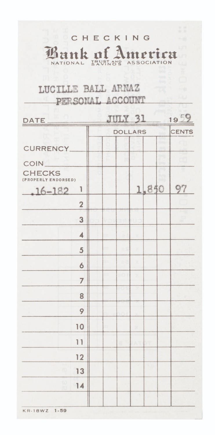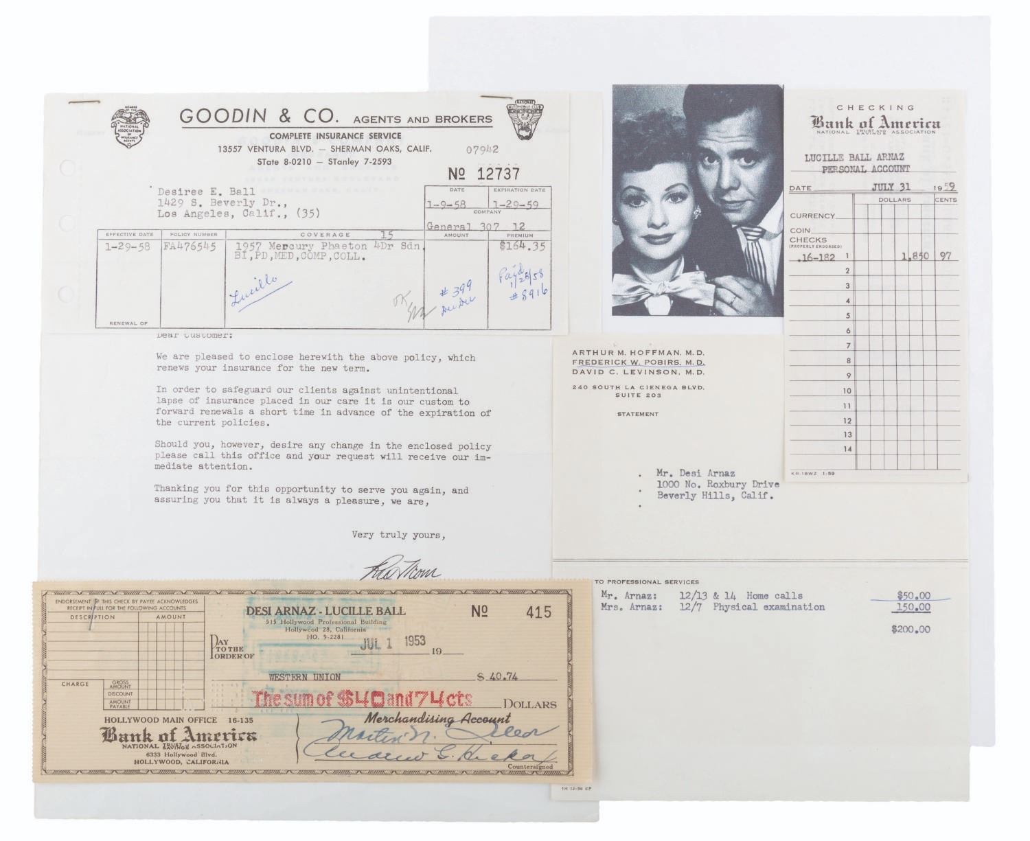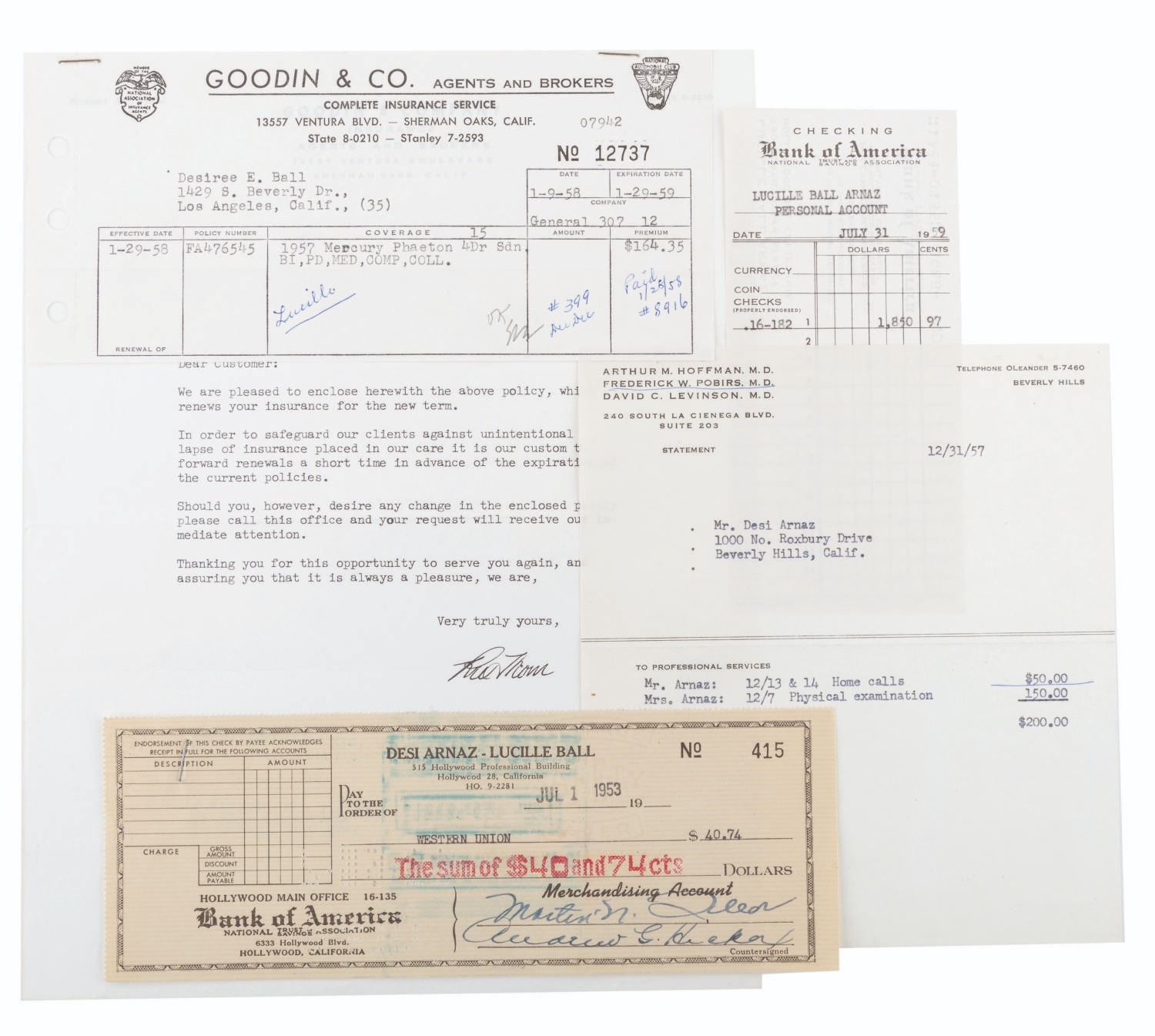 (Lucille Ball, 1953-59) A collection of 12 Lucille Ball documents, including deposit slips, medical receipts, an auto insurance policy, shopping receipts, a cancelled check, and cash/check vouchers. None of the documents have been signed by Lucille Ball. Measuring 2.75" x 6" to 8.5" x 11", the collection is in very good condition with light handling wear.
