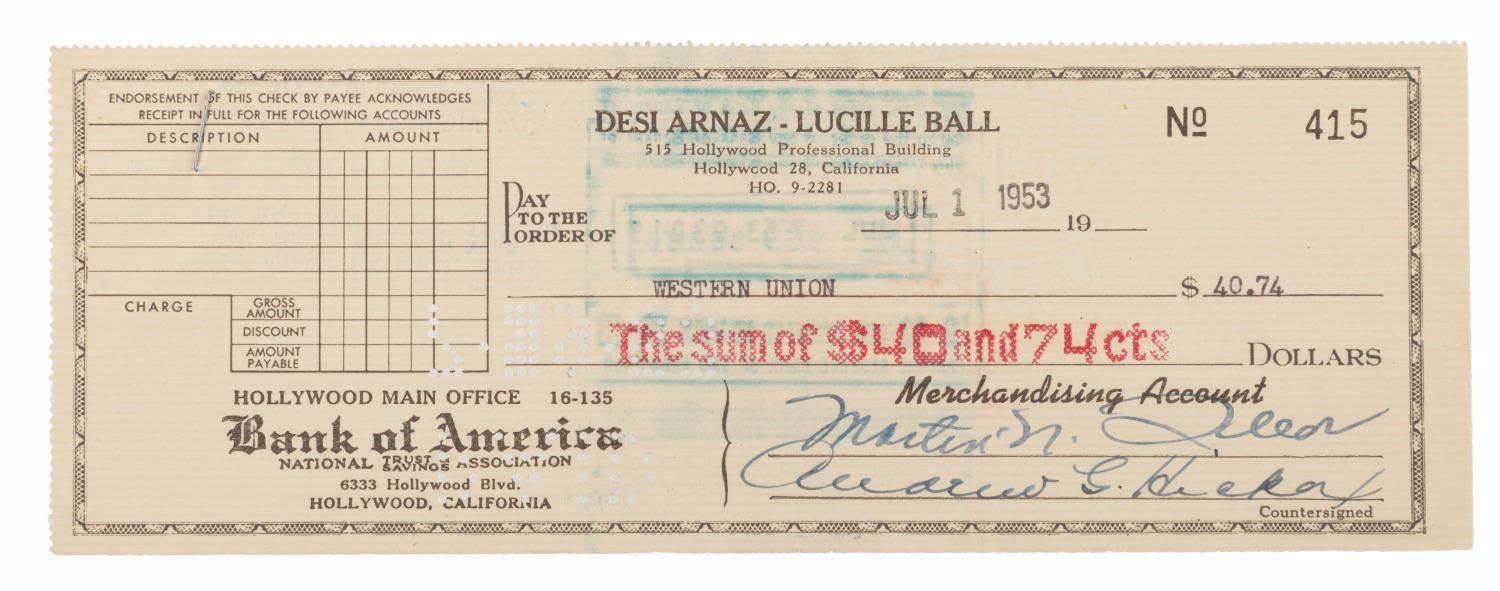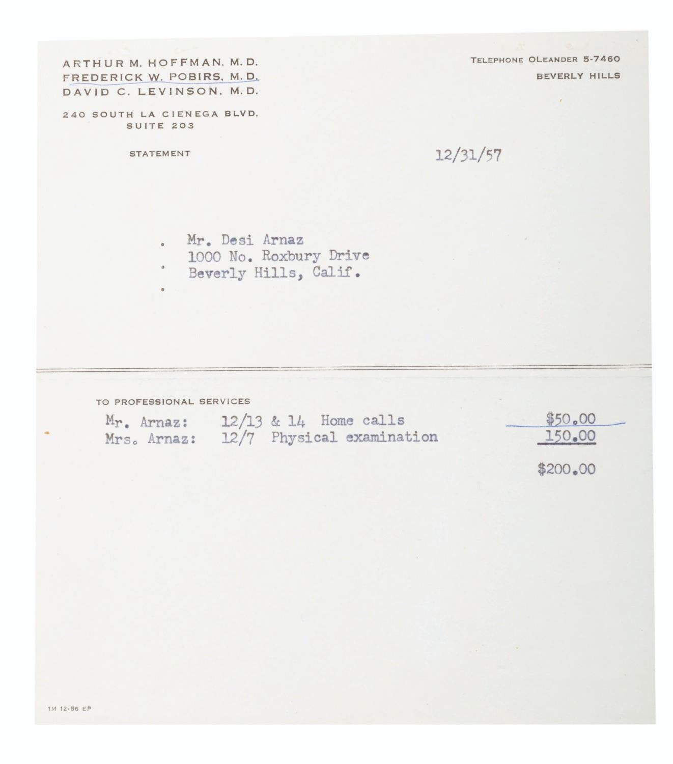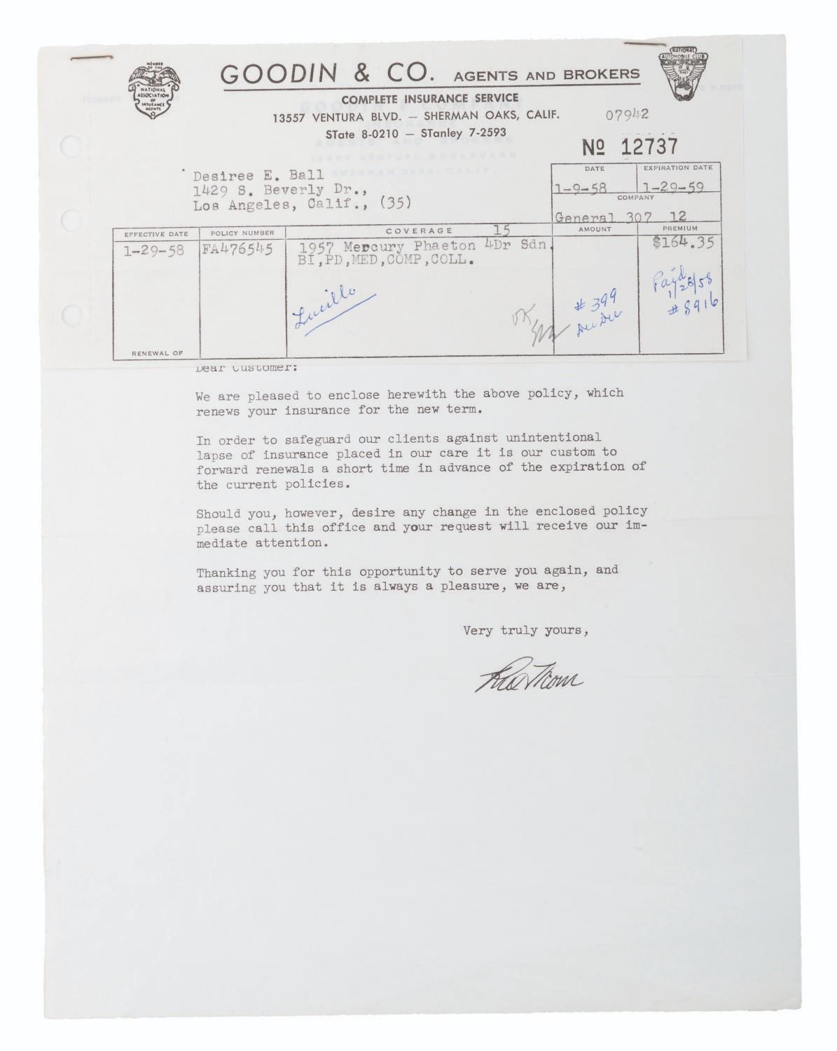 (Lucille Ball, 1953-59) A collection of 12 Lucille Ball documents, including deposit slips, medical receipts, an auto insurance policy, shopping receipts, a cancelled check, and cash/check vouchers. None of the documents have been signed by Lucille Ball. Measuring 2.75" x 6" to 8.5" x 11", the collection is in very good condition with light handling wear.