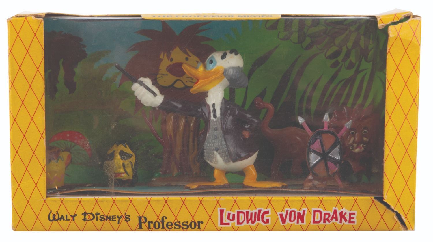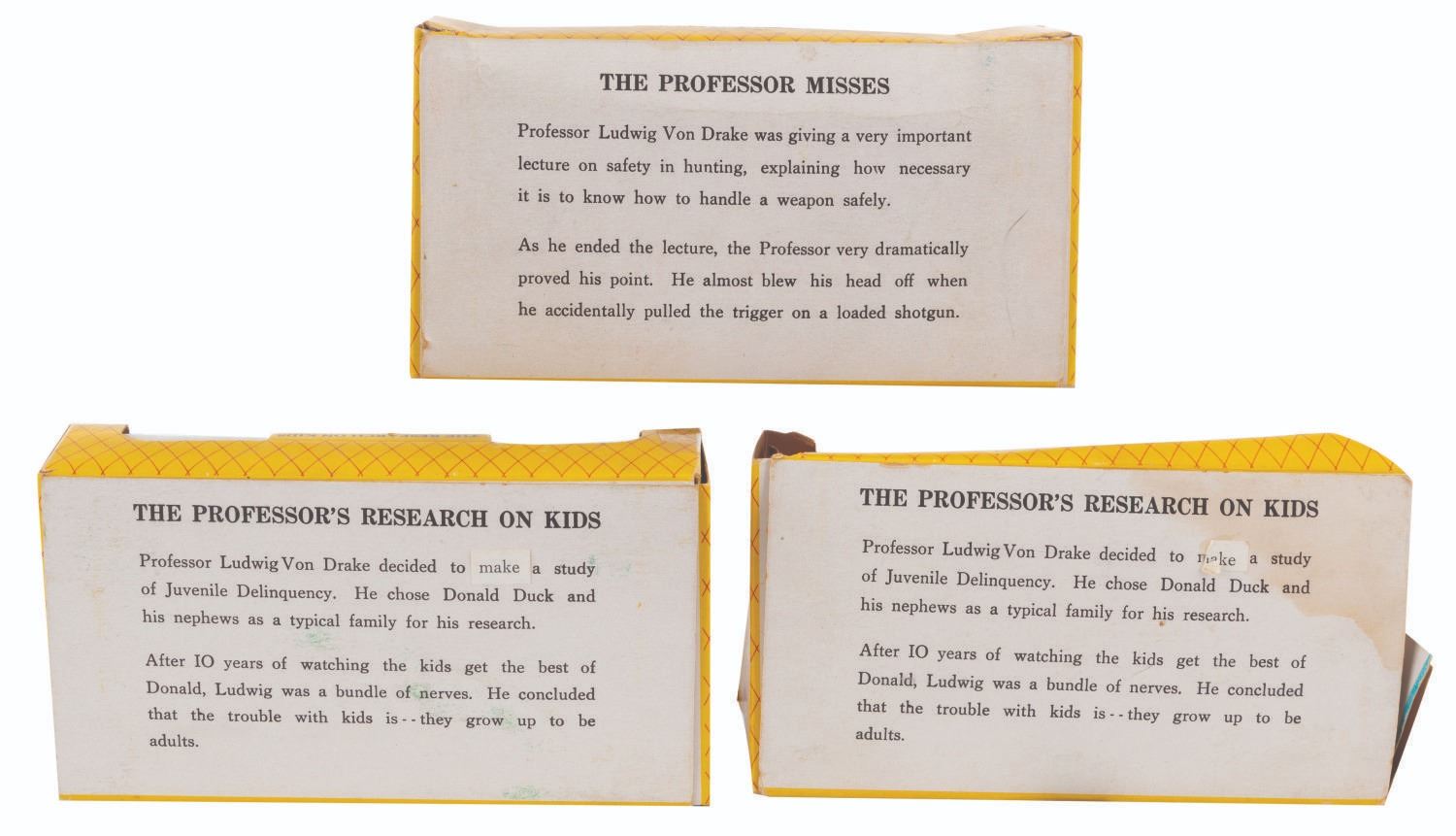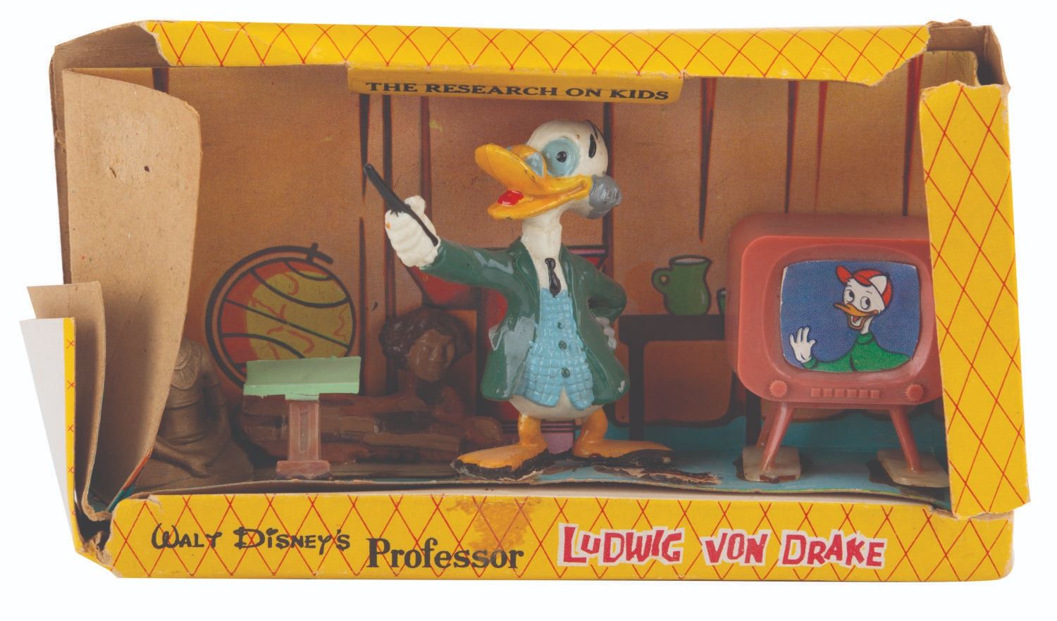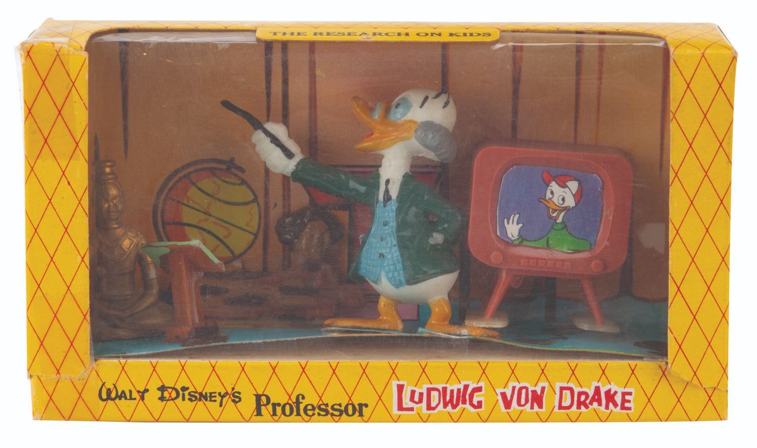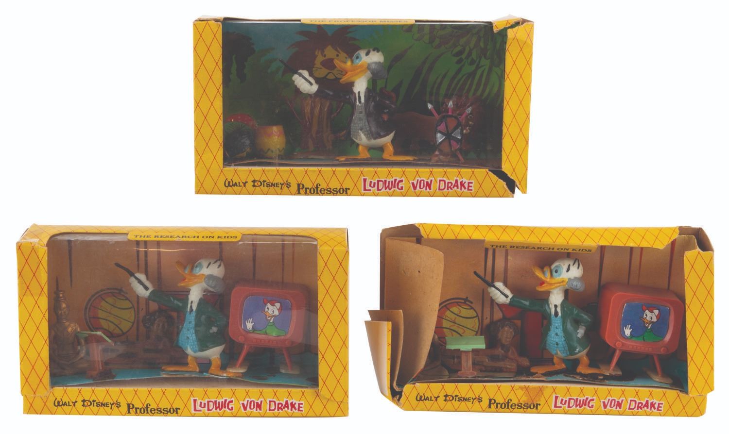 (Marx, 1961) A collection of three Disneykins play sets featuring "Walt Disney's Wonderful World of Color" host Ludwig Von Drake. Included are a pair of"The Professor’s Research on Kids" sets and a "The Professor Misses" set, each featuring four accessories and Ludwig. Measuring 6" x 1.5" x 3.25" tall each, the sets are in fair to good condition with loose pieces, one missing its window, crushing from storage, tears in the packaging, scratches, and wear.