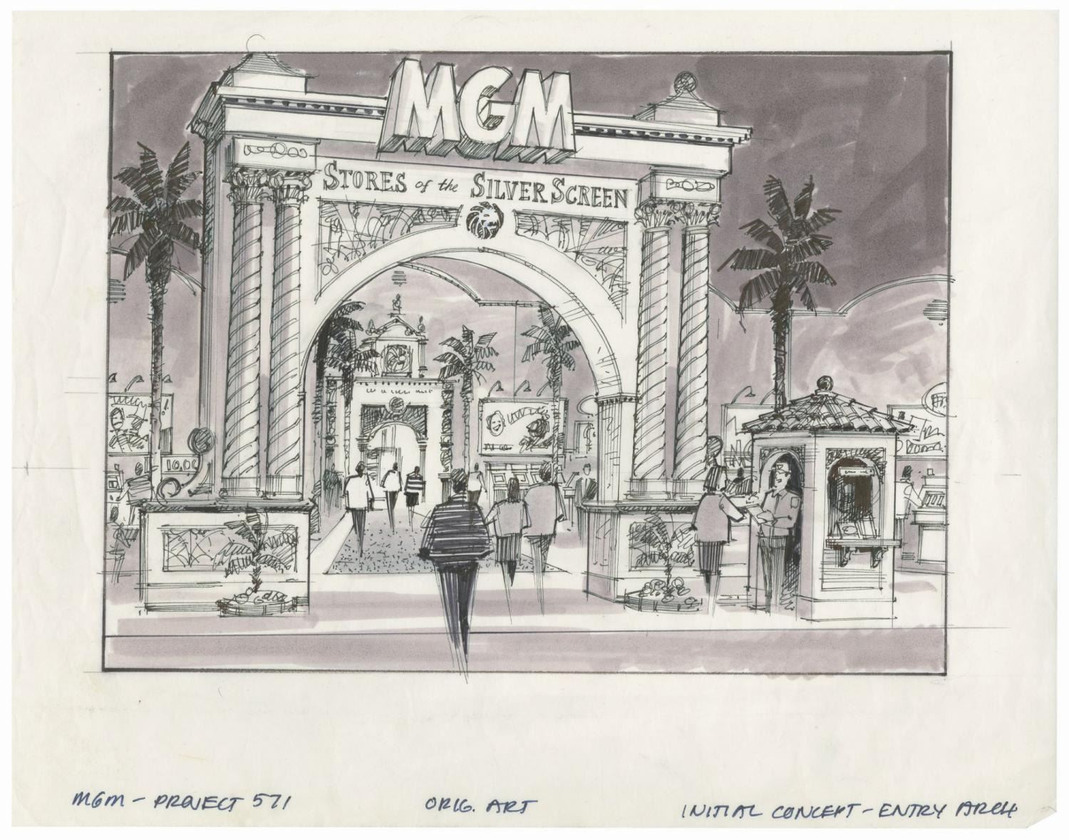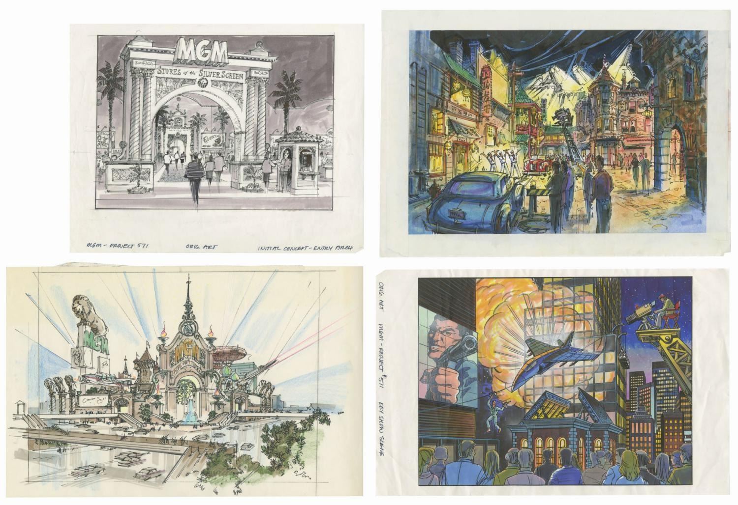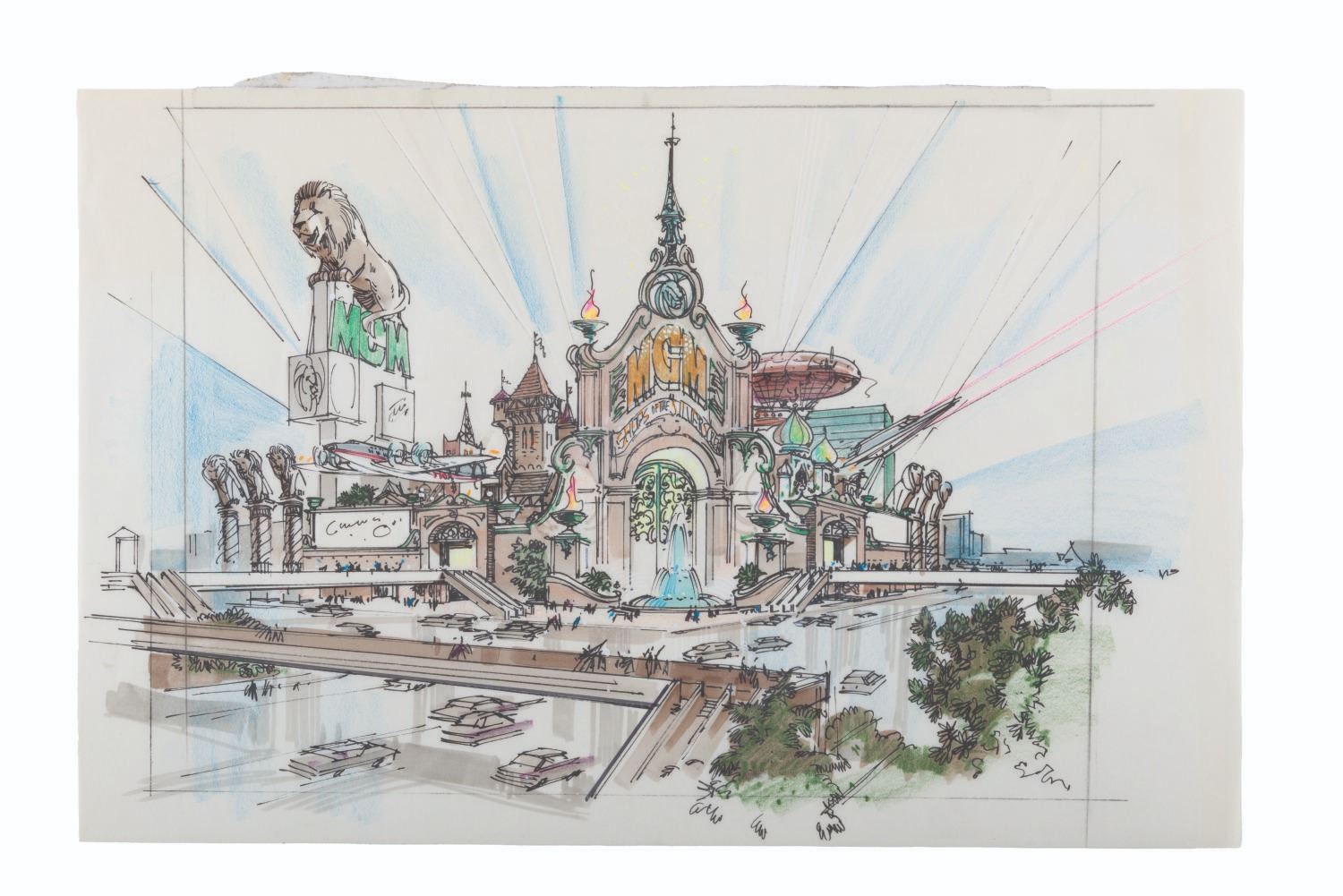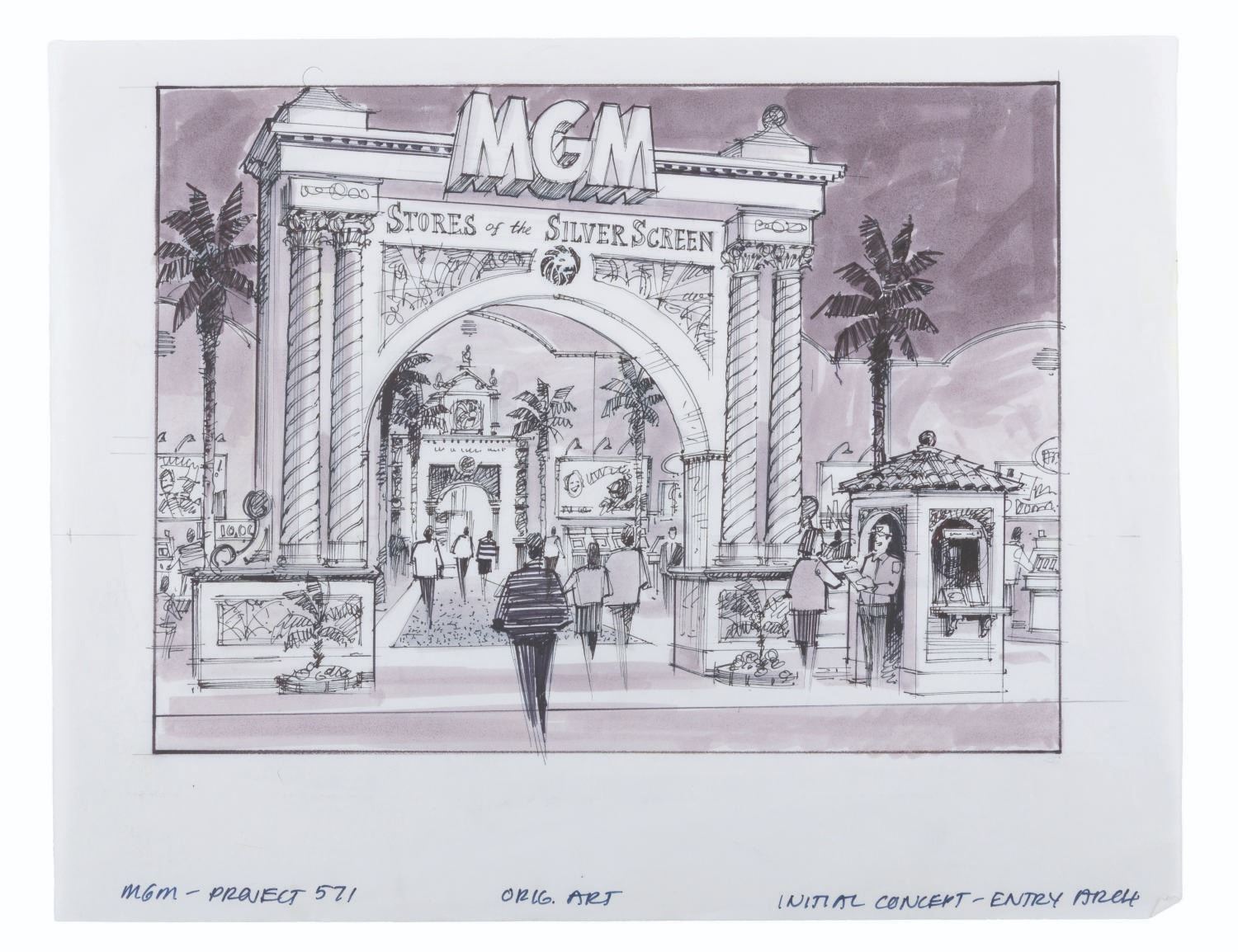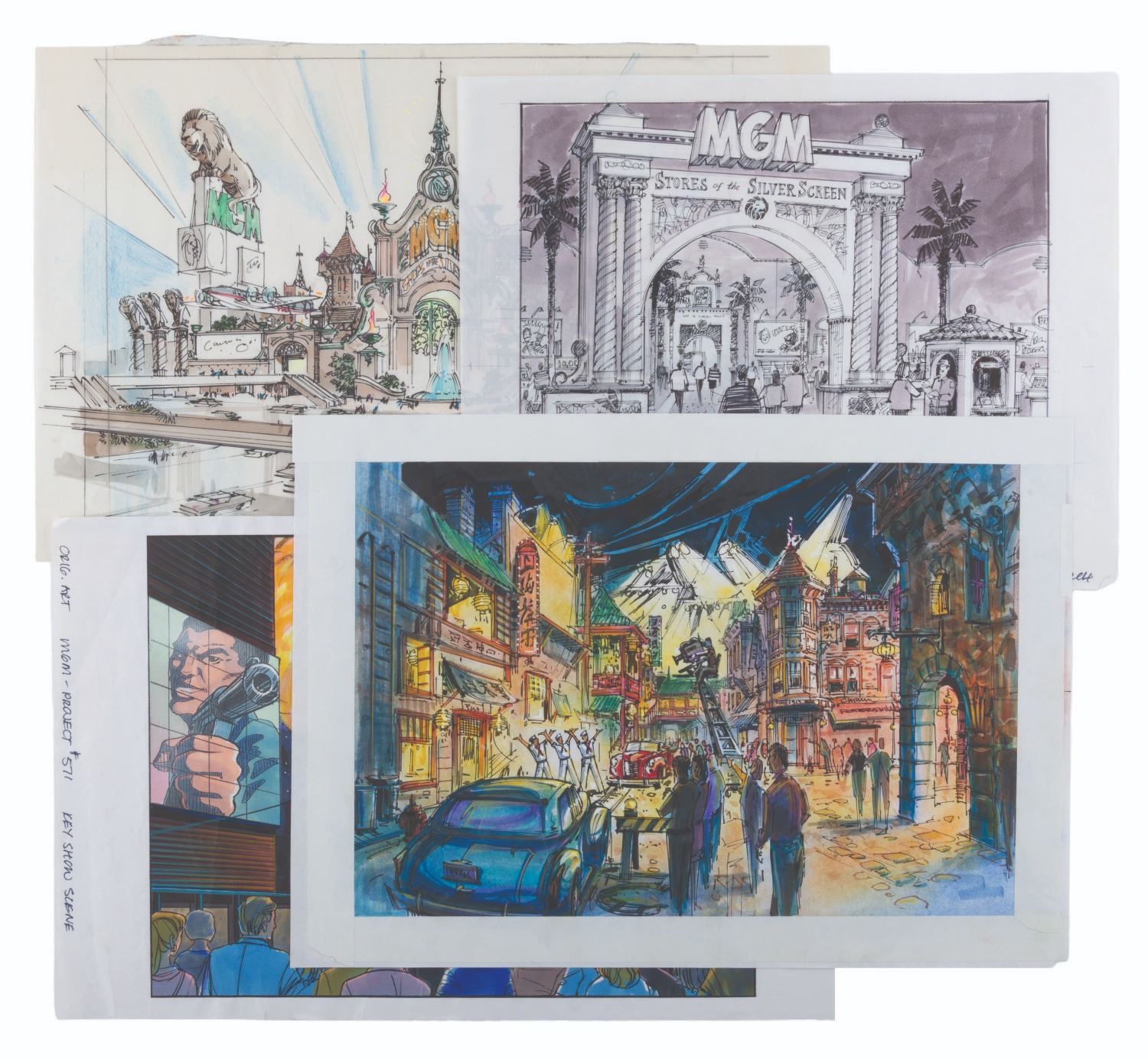 (Landmark Entertainment, 1997) A collection of four original concept artworks for the MGM Stores of the Silver Screen, a proposed shopping center at the MGM Grand Hotel & Casino in Las Vegas. The hand-colored drawings are accomplished in ink, marker, and pastel. Ranging in size from 11" x 14" to 12" x 16.75", the concepts are in very good condition with creases and edge wear.