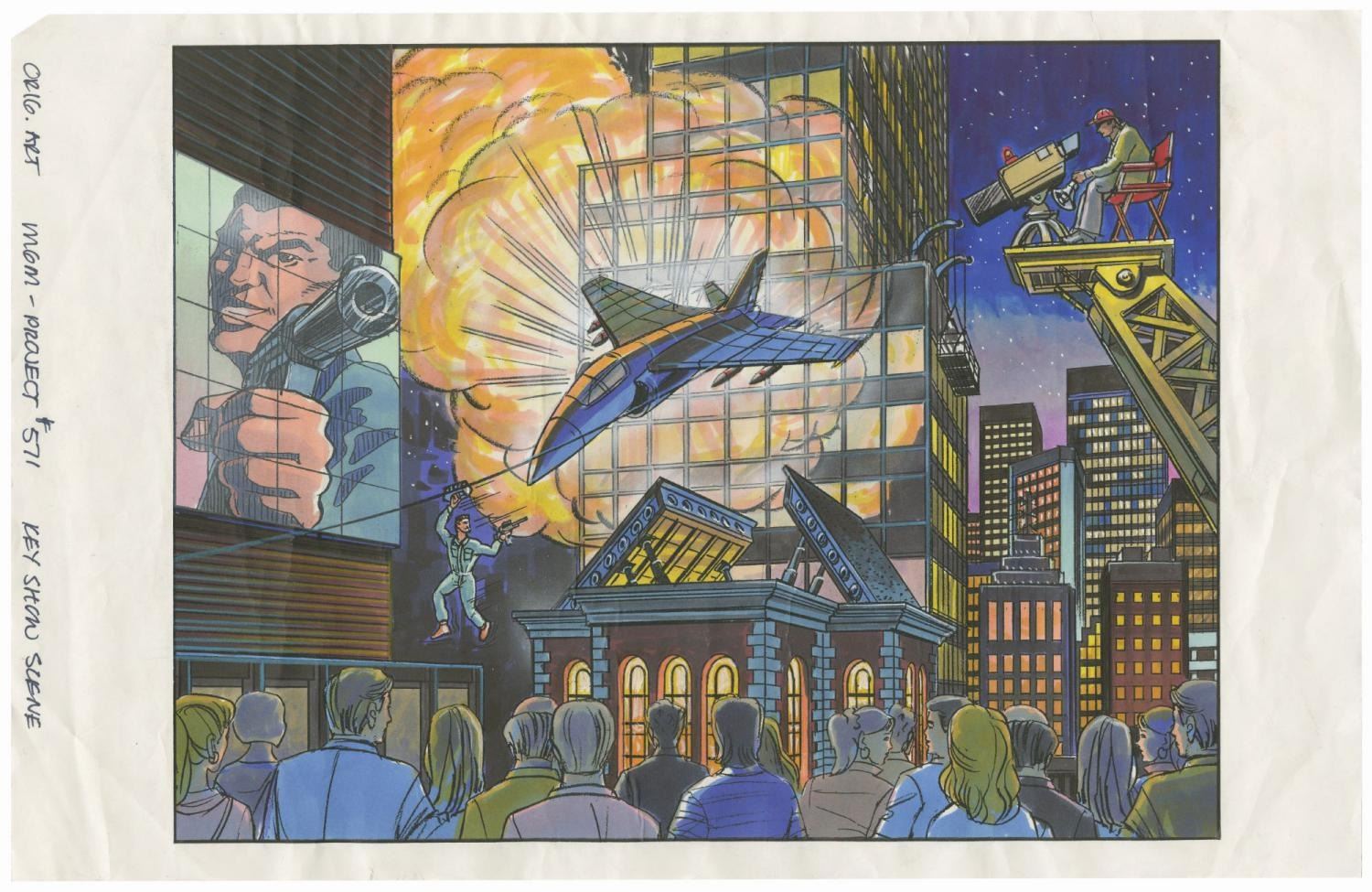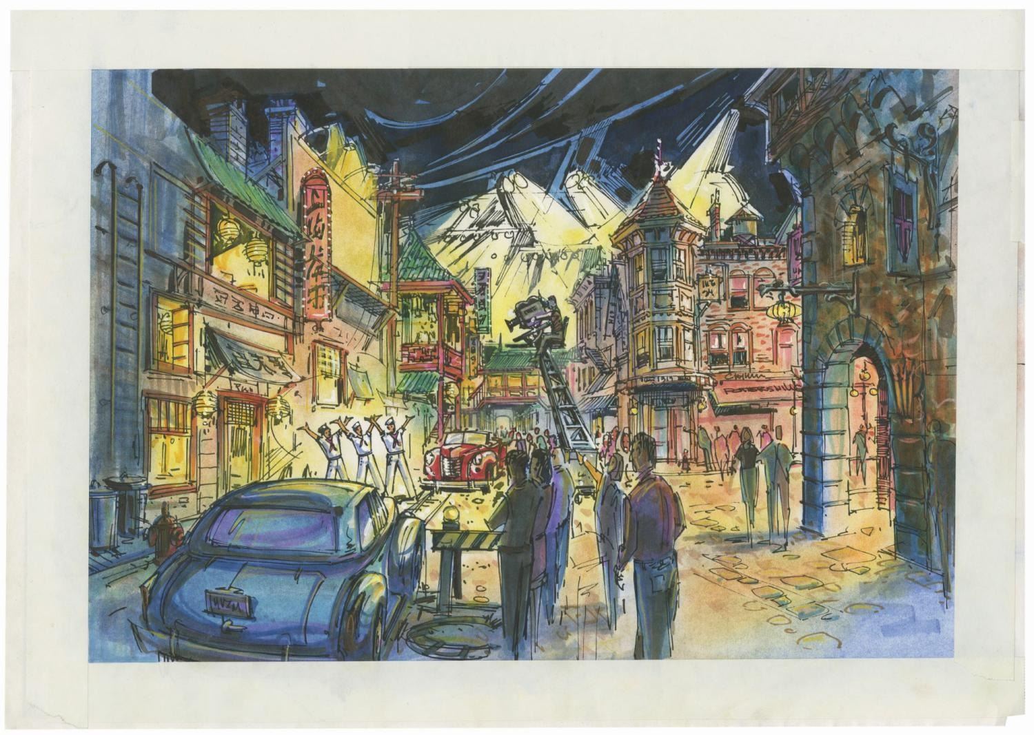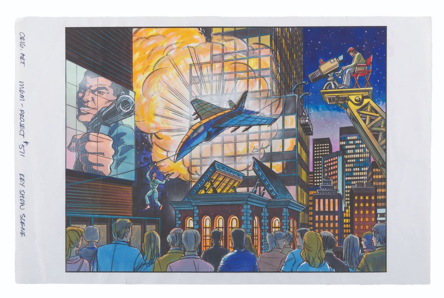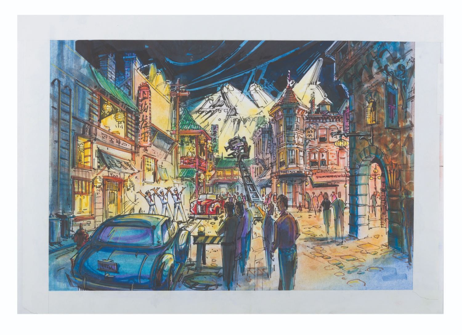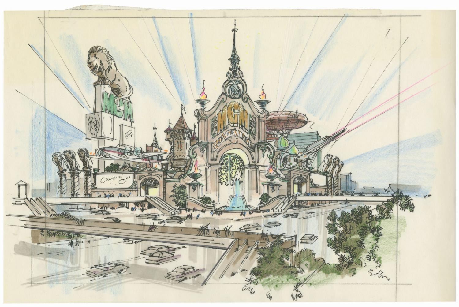 (Landmark Entertainment, 1997) A collection of four original concept artworks for the MGM Stores of the Silver Screen, a proposed shopping center at the MGM Grand Hotel & Casino in Las Vegas. The hand-colored drawings are accomplished in ink, marker, and pastel. Ranging in size from 11" x 14" to 12" x 16.75", the concepts are in very good condition with creases and edge wear.