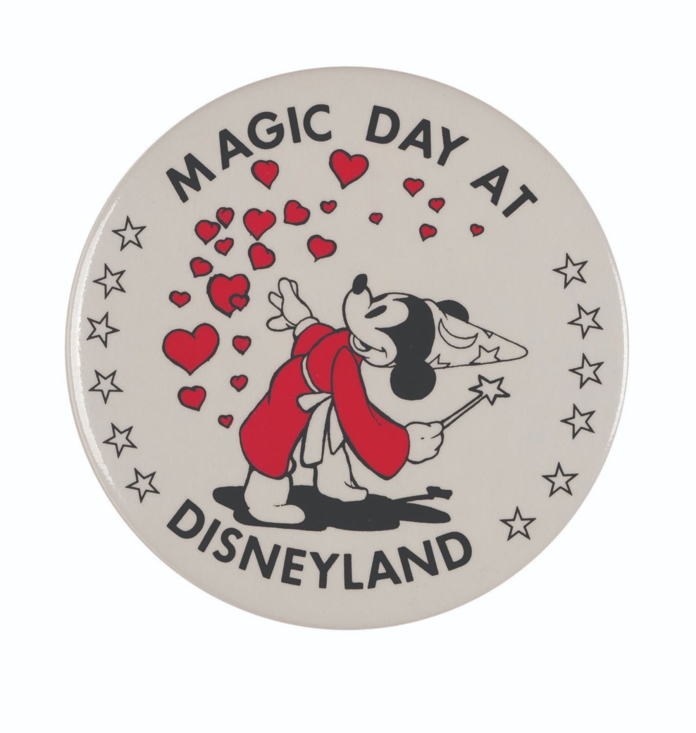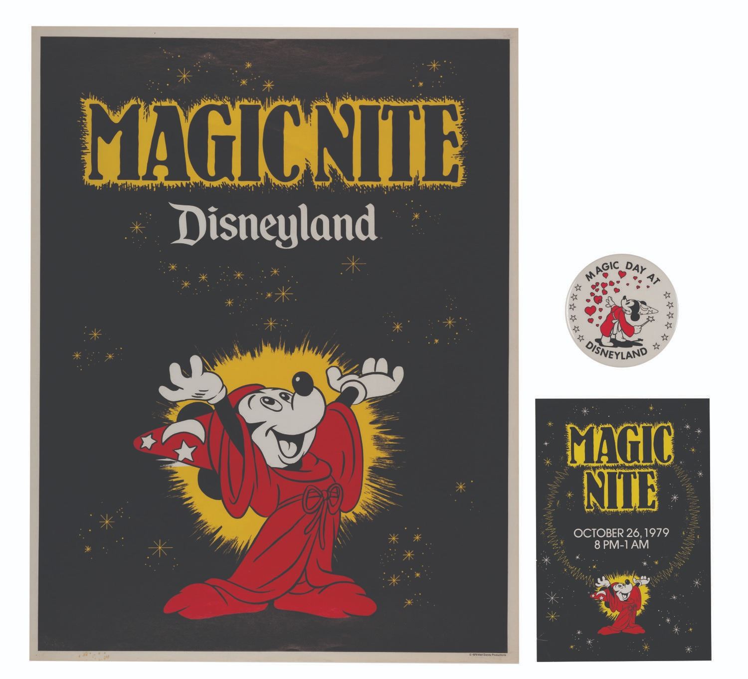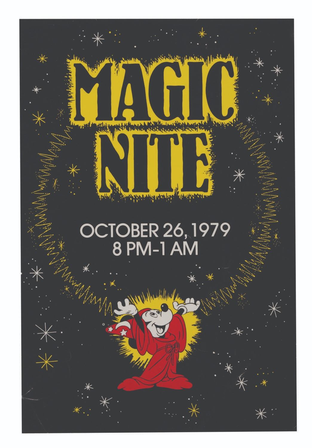 (Disneyland, 1979) A poster, gate flyer, and pinback button for the "Magic Nite at Disneyland" event, which occurred on October 26, 1979. Taking place between 8pm and 1am, the event featured live magicians, musicians, and dancing at several stages throughout the Park. Measuring from 3" diameter up to 17" x 22", the souvenirs are in very good condition with typical light wear from age.