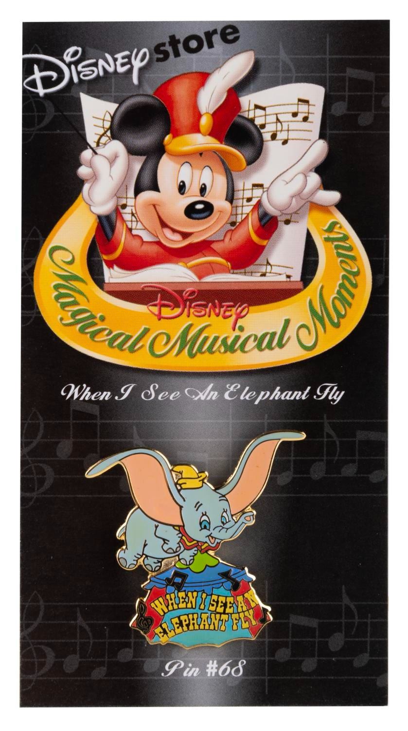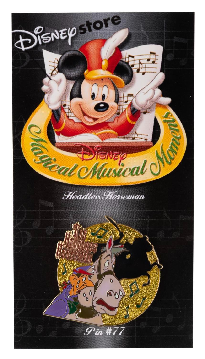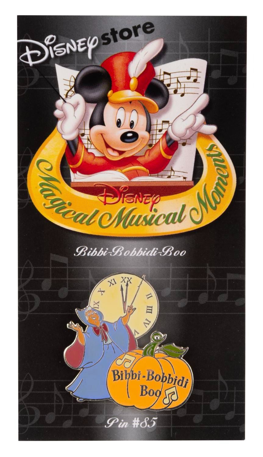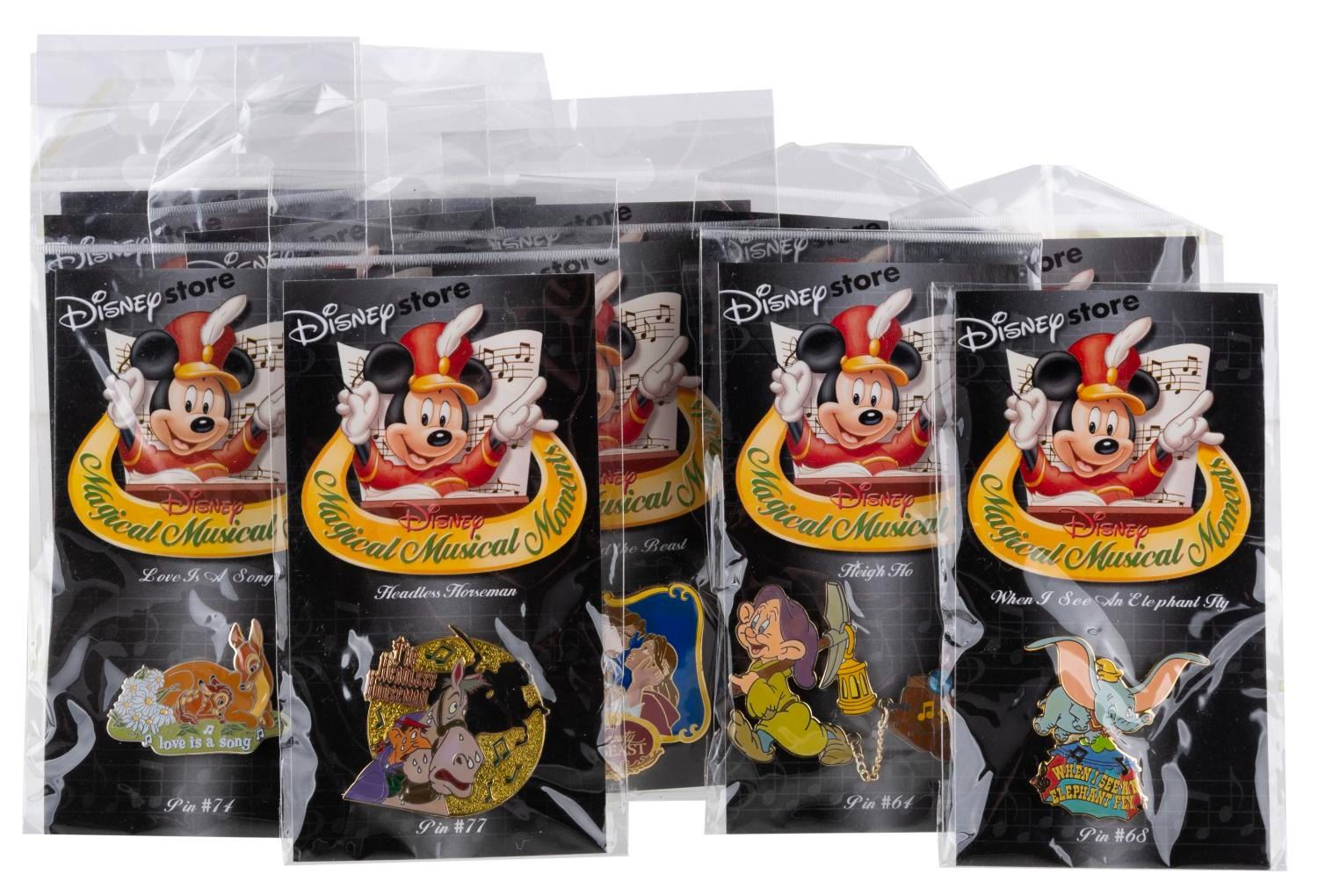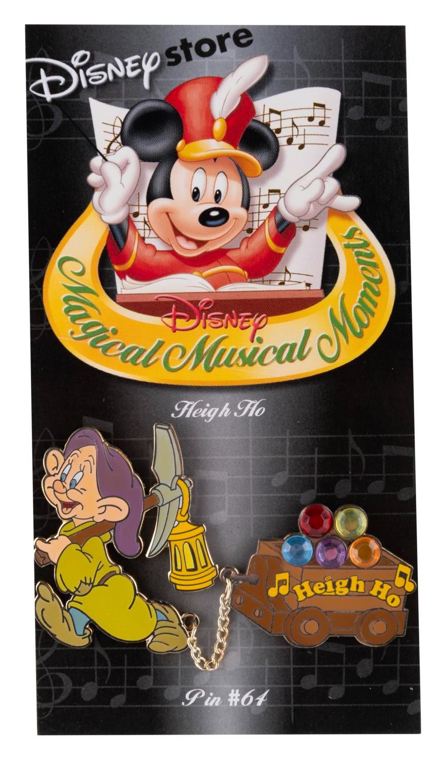 (Disney Store, 2002) Twelve "Magical Musical Moments" pins, each themed to a song from a Disney animated feature. The set includes "Beauty and the Beast," "Once Upon a Dream," "A Dream is a Wish Your Heart Makes," "Topsy Turvy," "Do You Believe in Magic," "Cruella De Vil," "Heigh Ho," "When I See An Elephant Fly," "Love Is A Song," "Headless Horseman," "Bibbidi Bobbidi Boo," and "April Showers." The pins are in fine condition on the original cards, with the "Beauty and the Beast" pin having a musical feature that no longer functions.